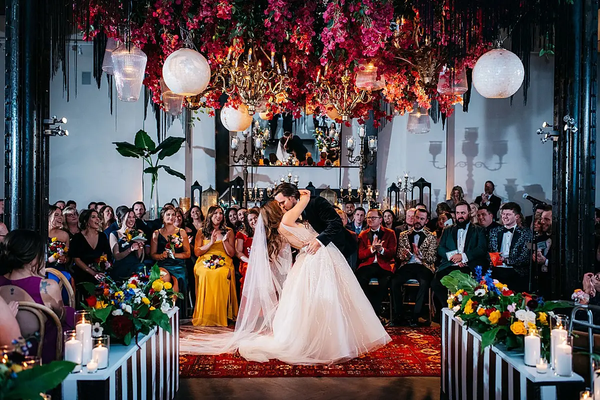 Finally, it was time for the ceremony that took place in the round, under the floating altar of our dreams and on top of a rug we purchased in Marrakech that Shane so graciously carried across three continents for me. This concept was the design idea that sparked the ideas for rest of the décor for an evening. I always knew that I wanted a ceremony in the round as it creates such intimacy in a space. We knew we wanted a colorful and bountiful ceiling of floral adorned with various styles of chandeliers and lighting applications, and then Brittanie from HMR and Daniela from Frost came up with the brilliant idea to trim the installation with scalloped valances decked out in patterns that I had watercolored myself for the most amazing invitation suite and paper goods designed by Stacey of Steracle Press. The aisle was adorned with additional black and white striped planter boxes inspired by the Colonnes de Buren in Paris, which is where we took our very first international trip together and plan to travel back to in the coming weeks for our honeymoon. The ceremony was officiated by my two brothers, the only people we knew would made sense to marry us, and to officially welcome Shane as the first non-blood member of our extremely close sibling club. We wrote our own vows (mine may have ended in a musical number) mixed up a unity cocktail instead of lighting a unity candle, and even had our own “wedding scratch off” which entitled one lucky member of the audience to their very own bar fast pass, and one lucky member to give a heartfelt, yet impromptu speech about us. There wasn’t a dry eye in the house either from laughter or tears, and we have even had countless guests tell us that even though the ceremony ended up lasting over 40 minutes, they were sad when it came to an end.