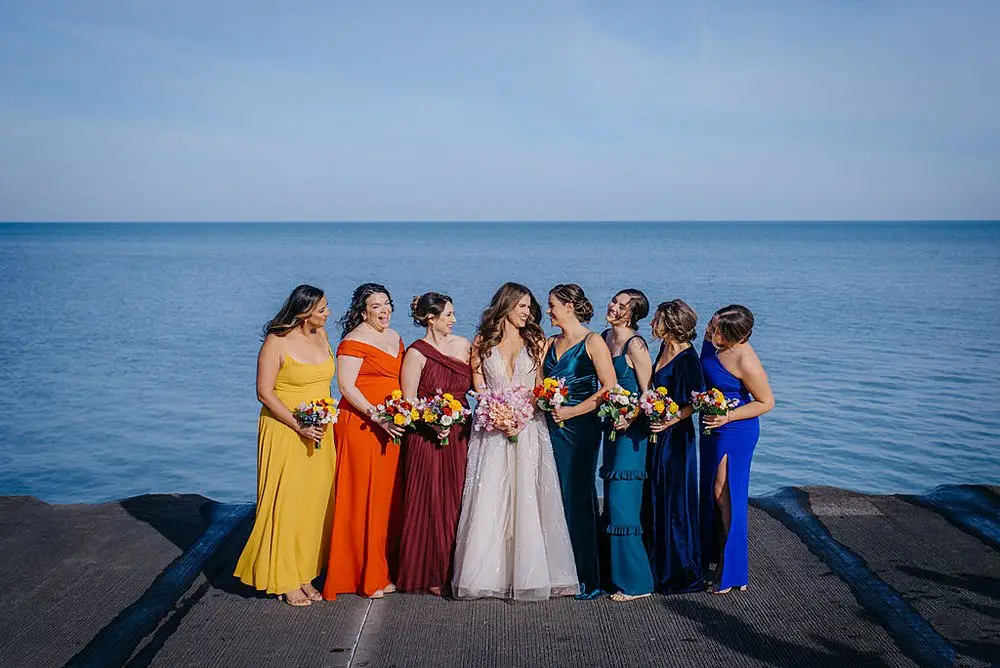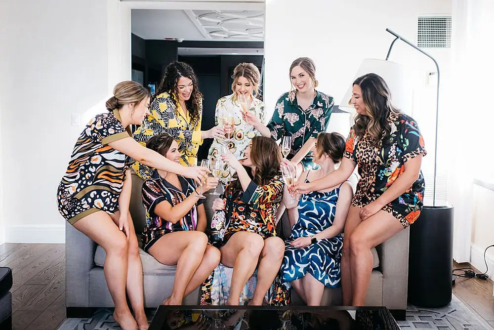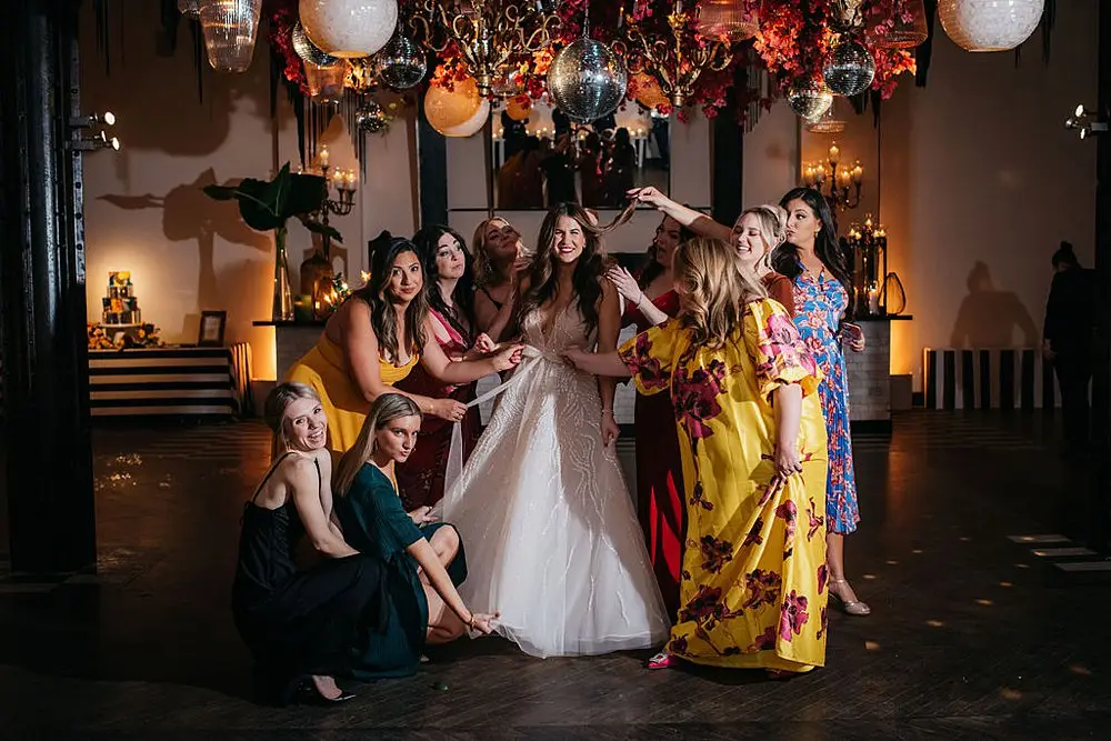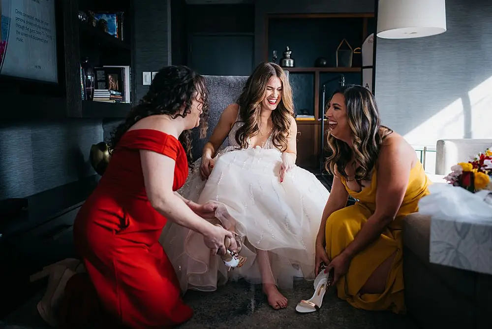 The day started out at the Intercontinental Hotel where we decided to get ready with our wedding party. The Presidential Suite is second to none in the city, and I knew it would be the best backdrop for photos, and the most comfortable spot for Hair and Makeup by Bianca Sansosti’s team, as I decided to include not just bridesmaids in the getting ready process, but close family and friends as well. I suggested that everyone wear their most “Michelle like” PJs, which meant color and pattern, and my bridesmaids and myself wore various styles of PJs via Averie. I was so excited to put on my gown from Eisen Stein, and to complete the look with the splurge worthy purchase of my Sophia Webster heels. The bridesmaids were free to choose gowns in shades of jewel tones in a style they felt most comfortable in, and while it’s not typical for groomsmen to be excited by their ensembles, when we told them they would be