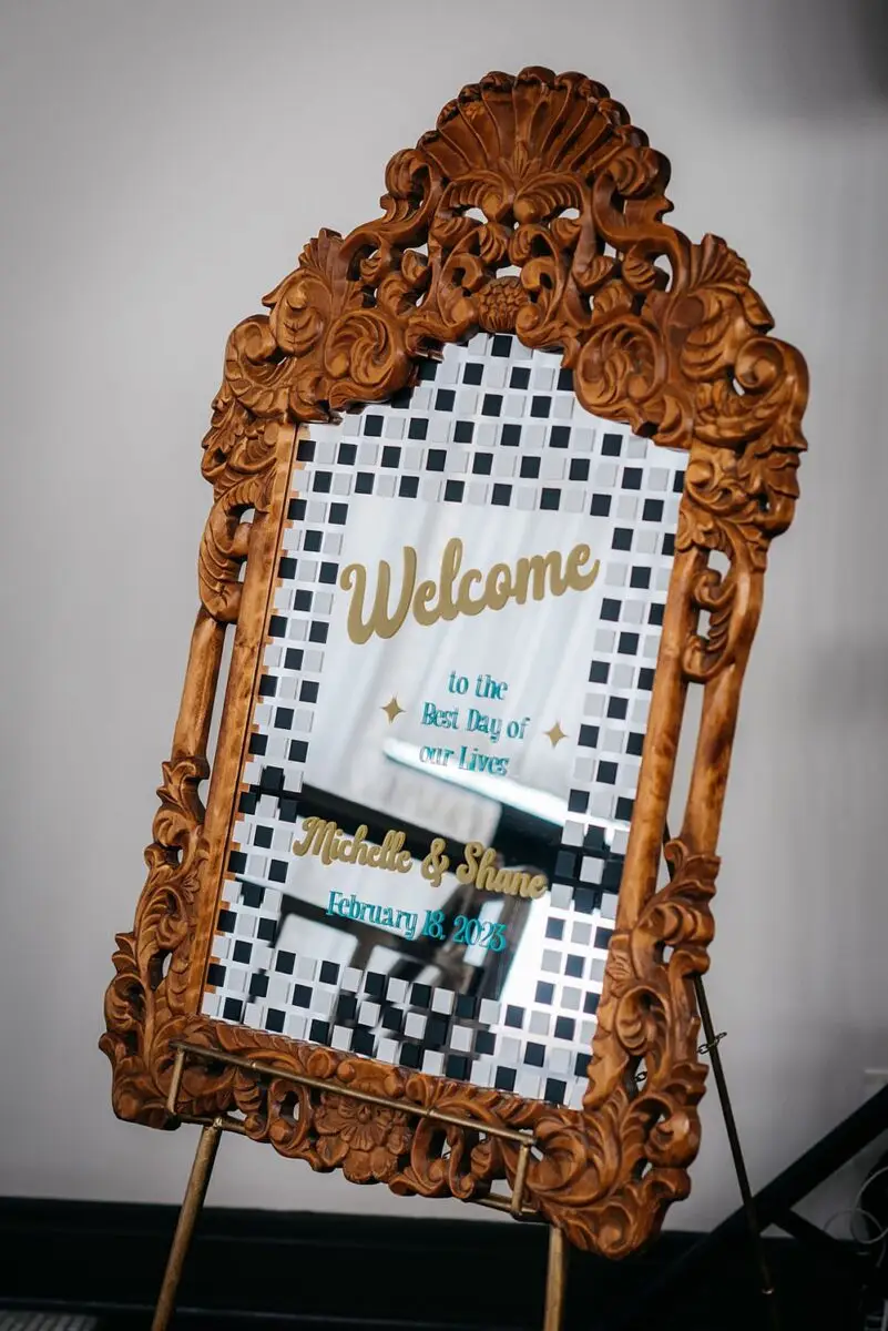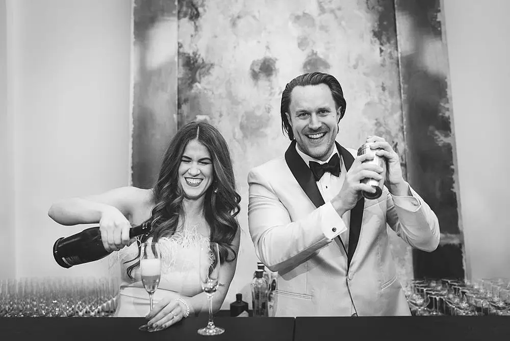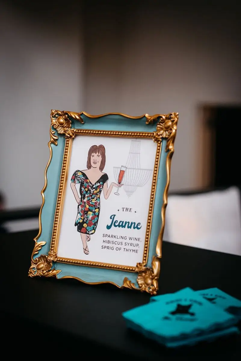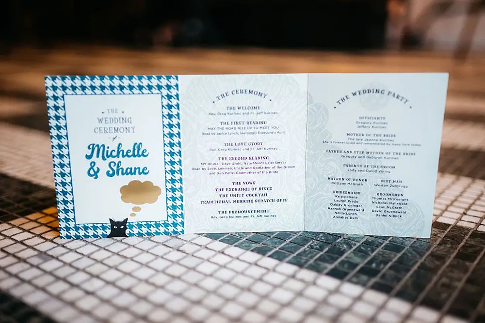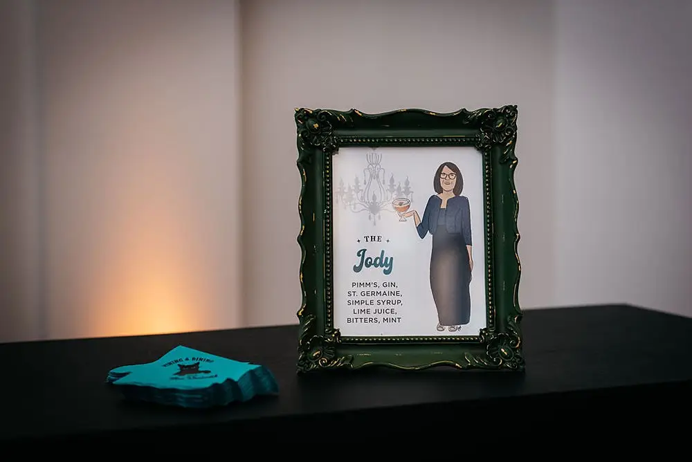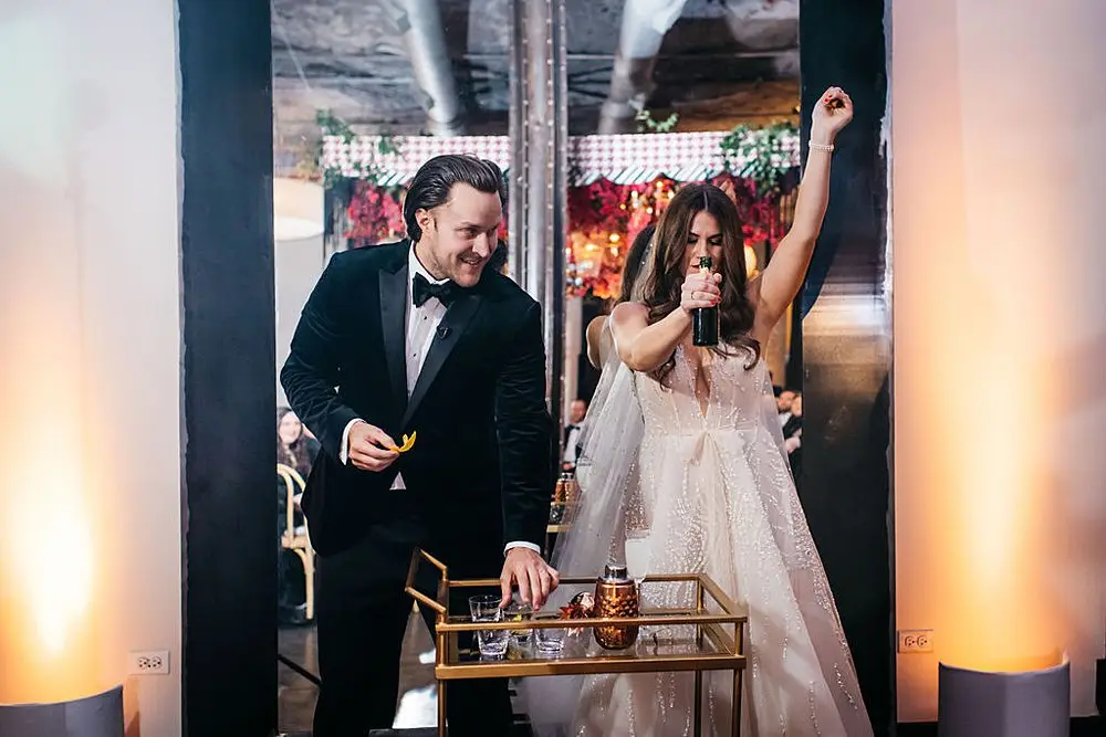 That said, we wanted to make sure to kick off our wedding with a bang, and that’s where we decided it would be a blast to welcome our guests into the venue with a pre-ceremony cocktail hour! Shane and I decided what better way to greet our guests than by mixing up cocktails from behind the bar, just like we would do at home. We each changed into our bartending uniforms – mine was a white midi dress from Mew Mews Fashion featuring feathers on the top and bottom, and Shane’s a glitzy gold tuxedo jacket with black lapel. We each served a signature cocktail inspired by our moms, naming them as such, “The Jeanne” in honor of my mom who is no longer with us, and “The Jody” in honor of his mom who got a kick out of having her own drink and cartoon character, and the cocktail napkins featured the other love of our lives, Tikka, our little black cat who unfortunately couldn’t be in attendance. Our guests were floored by the idea of bride and groom bartenders, and everyone had so much fun taking selfies with us as we whipped up their drinks. It was the perfect way to see all our guests in an engaging way, and a great way to rid some of the ceremony nerves.