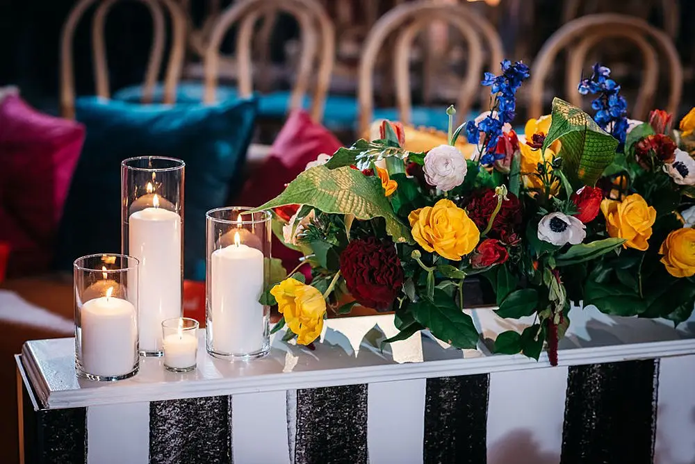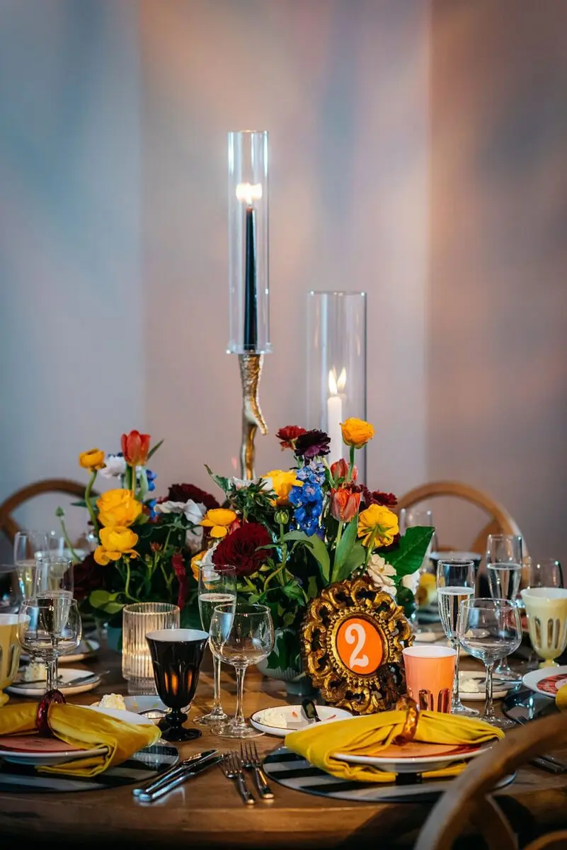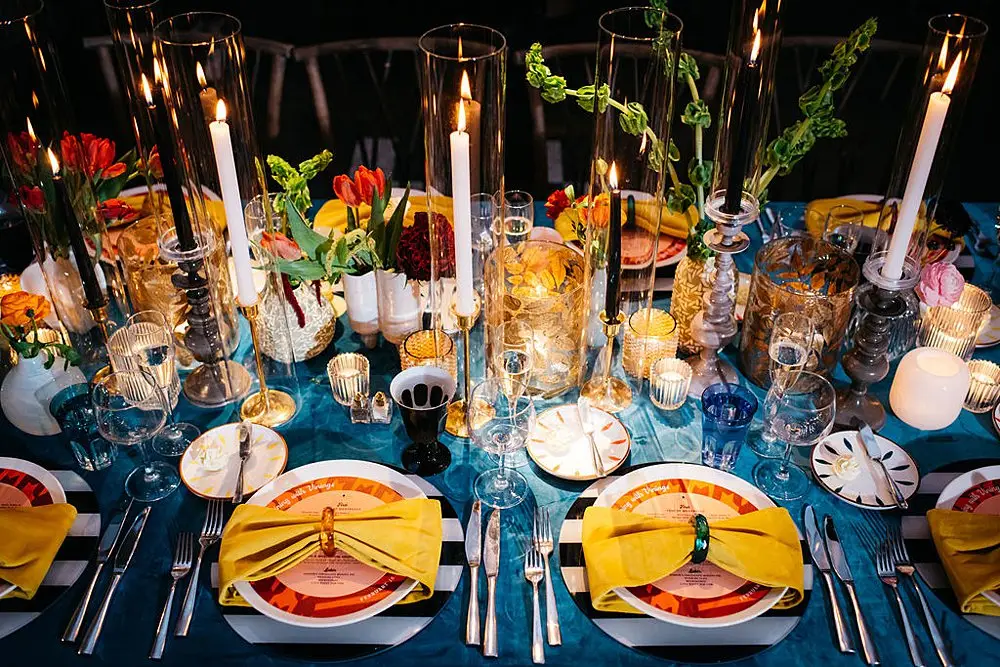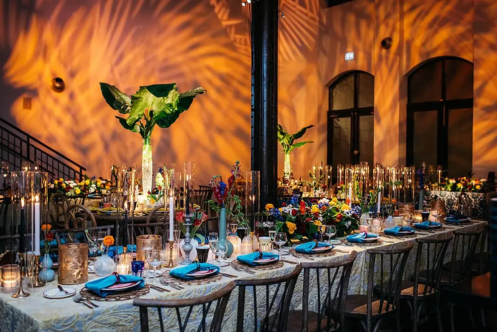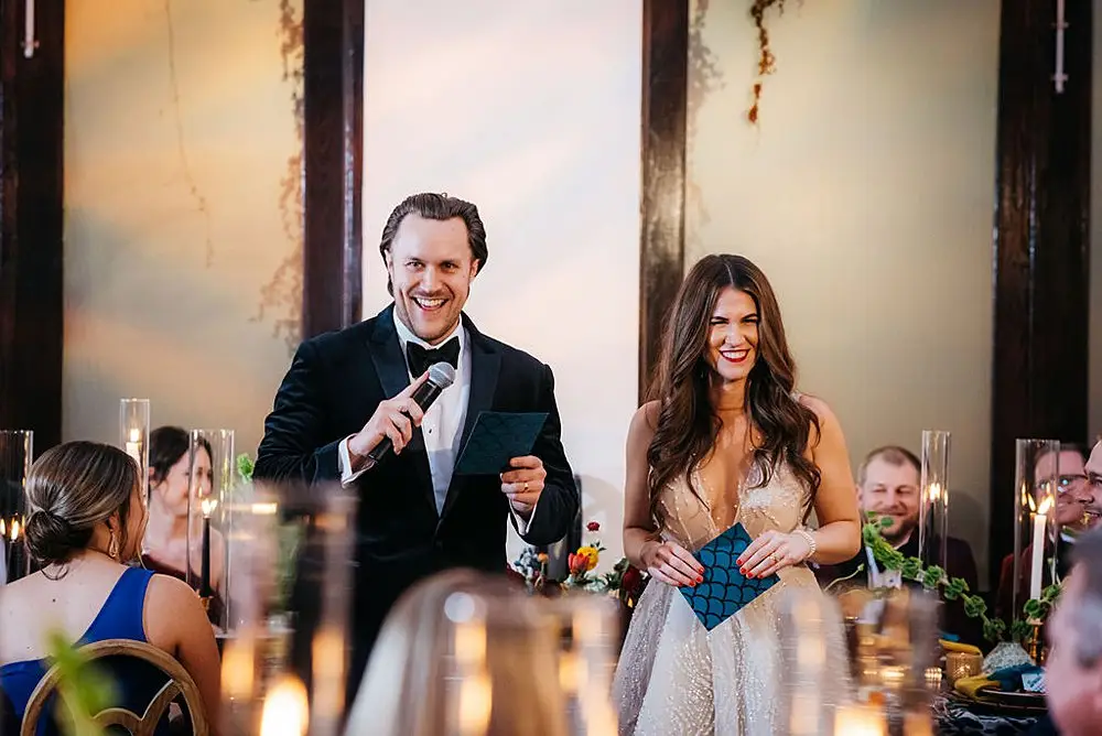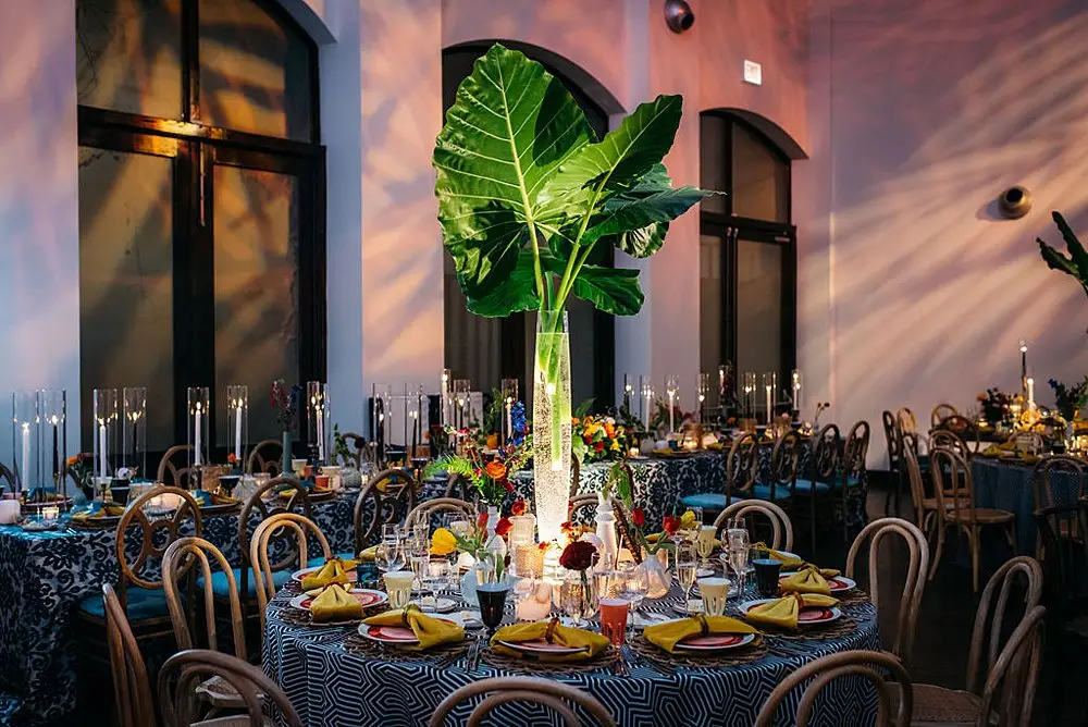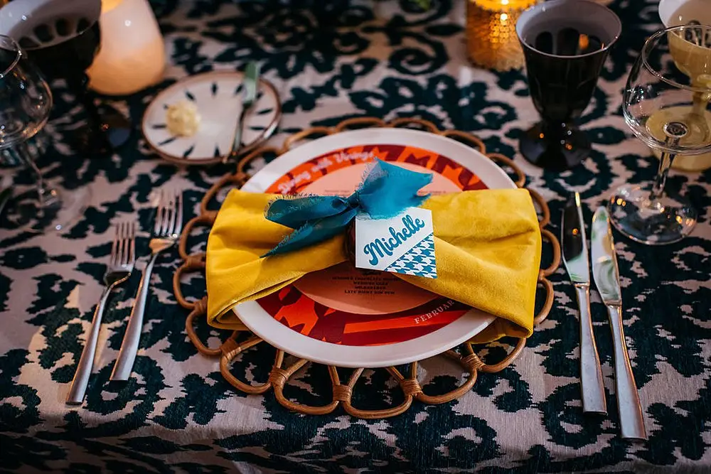 After another round of cocktail hour (because can you ever have too many cocktail hours?!) it was finally time for our guests to sit down and indulge in our perfectly curated menu provided by Food for Thought Catering and our meticulously adorned dinner space featuring colorful and patterned linens from Nuage Designs, rattan chargers from BBJ La Tavola and black and white striped placemats from LOLA Valentina. The goal for this space was to make it seem as though we were inviting guests into our home, which has been our labor of love over the past year, splashed with color, pattern, texture and an abundance of plant life, mimicked by the palm projections on the walls and the elevated tabletop centerpieces. Guests found their seats via their escort cards, which featured a hand written note by Shane or myself reminiscing on a favorite memory or sentiment we wanted to share with each guest that made the time to attend our big day.