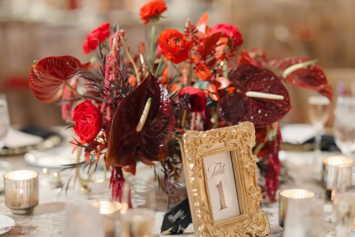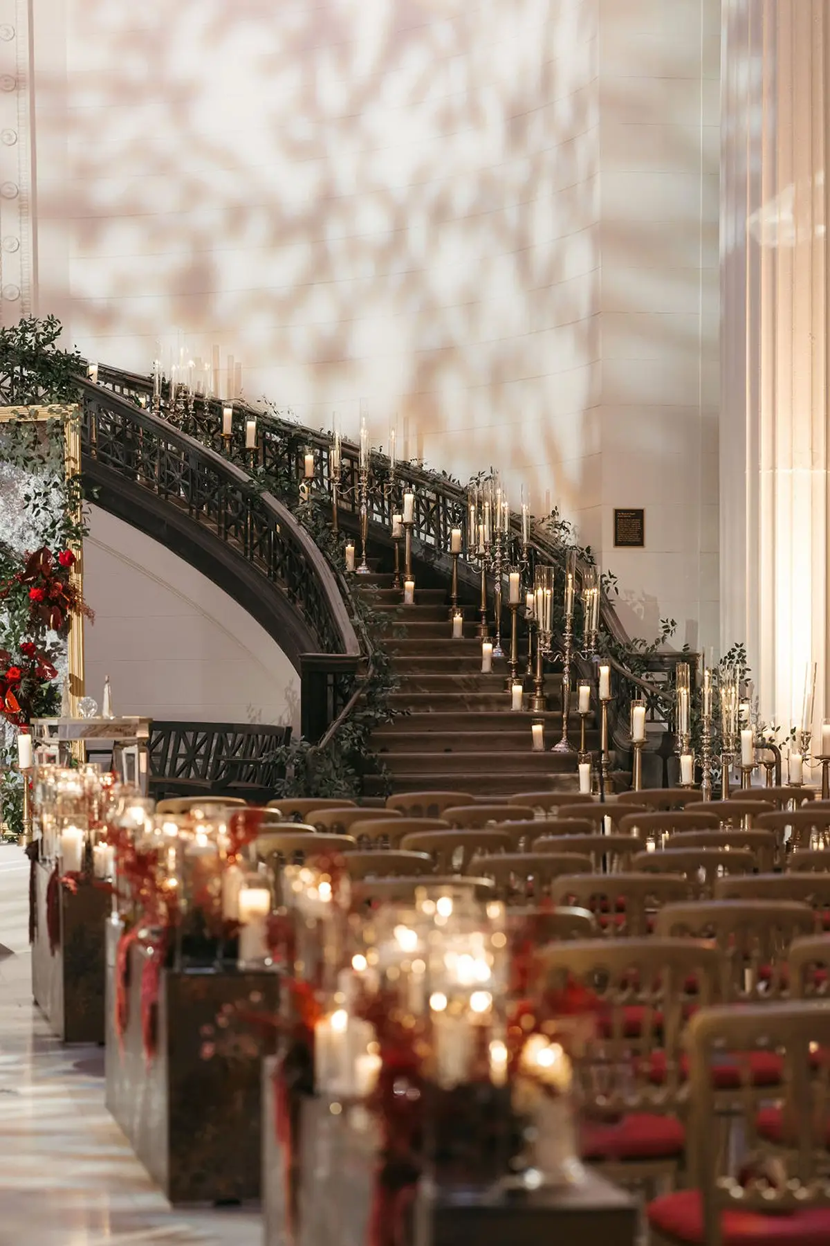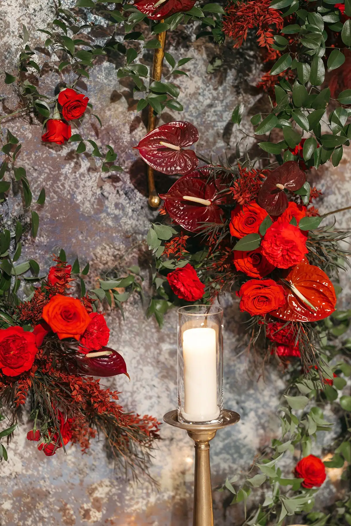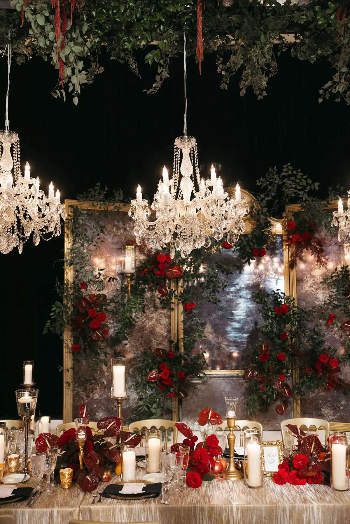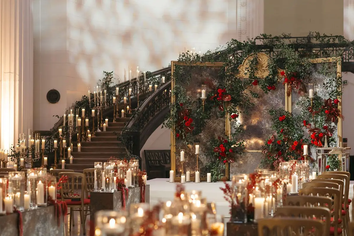 To bring that dream to life, we partnered with Mathey Lahey for Kehoe Designs. Together, we designed a ceremony space glowing with candlelight, framed with vintage-inspired florals in rich tones of red and burgundy. The focal point was a stunning antique-style mirror installation that looked like it had been borrowed from a forgotten manor garden.