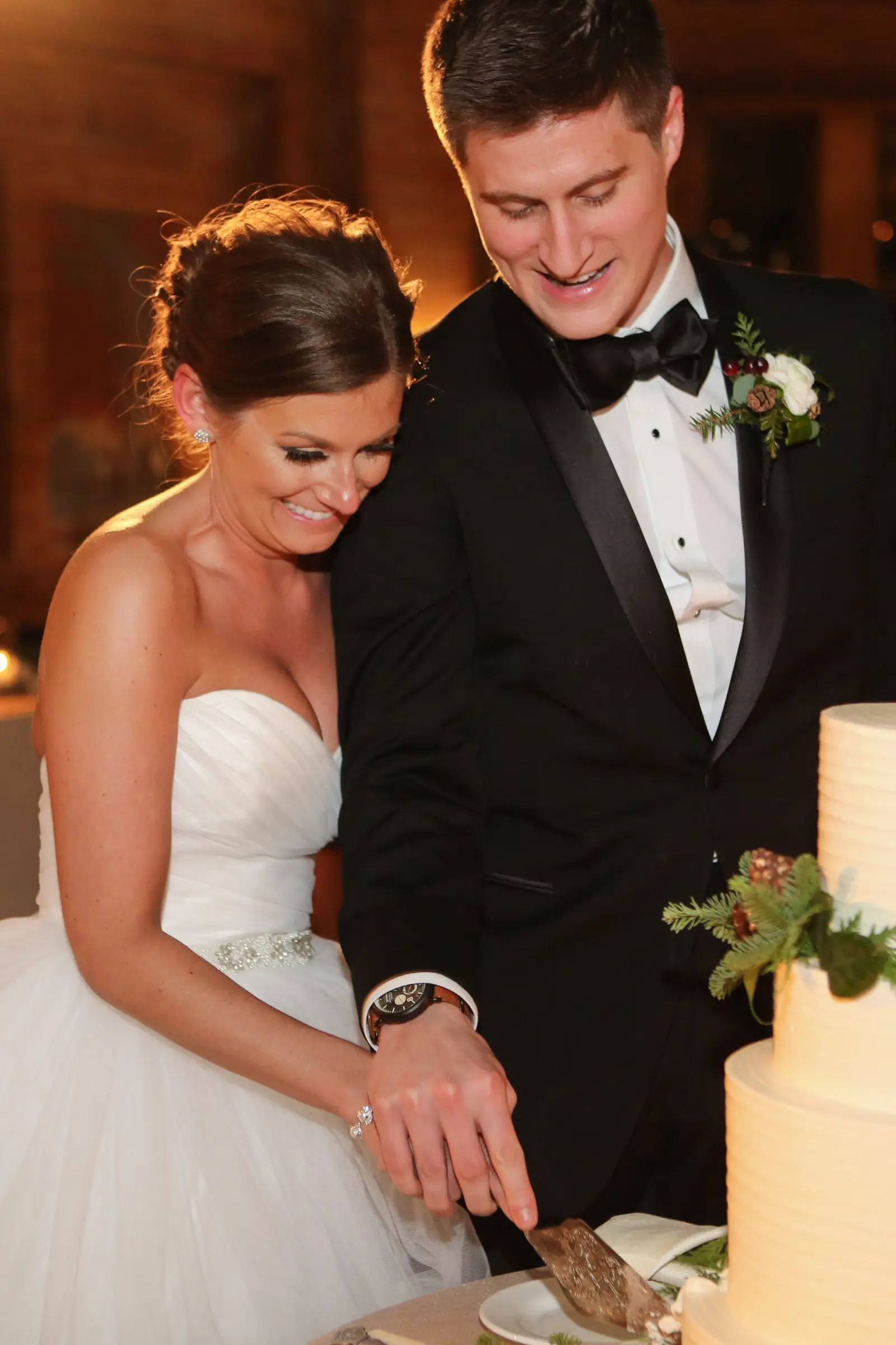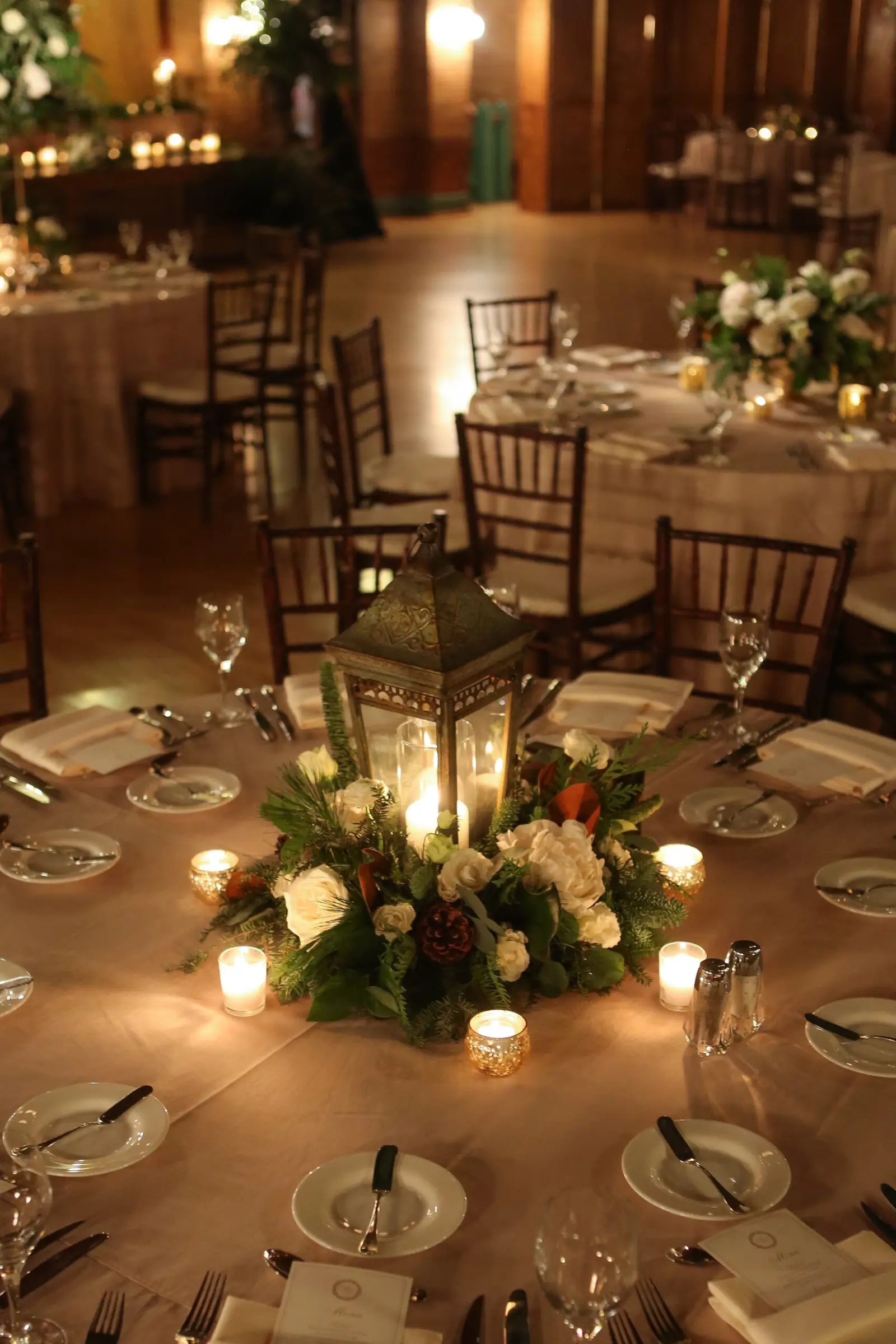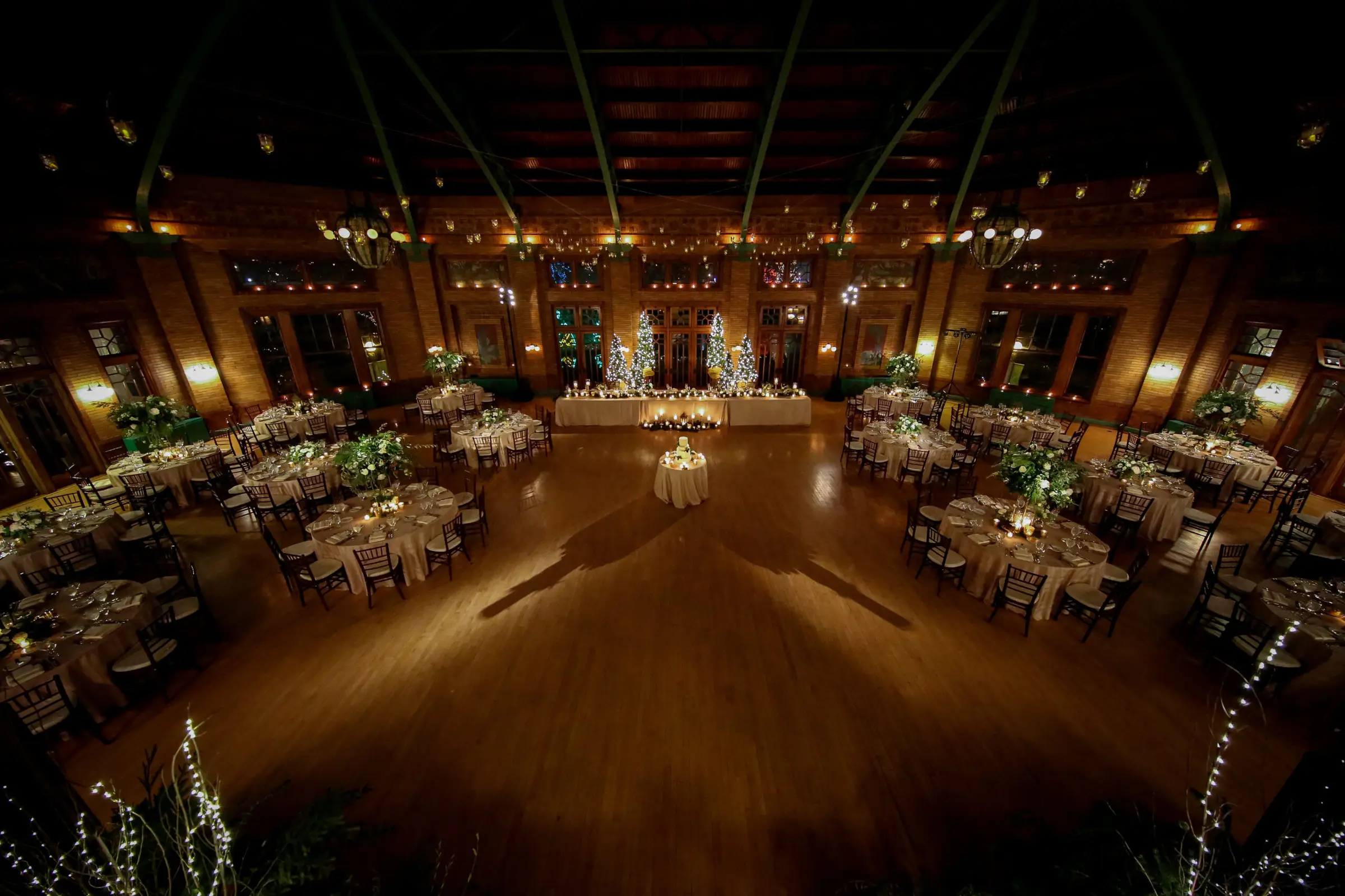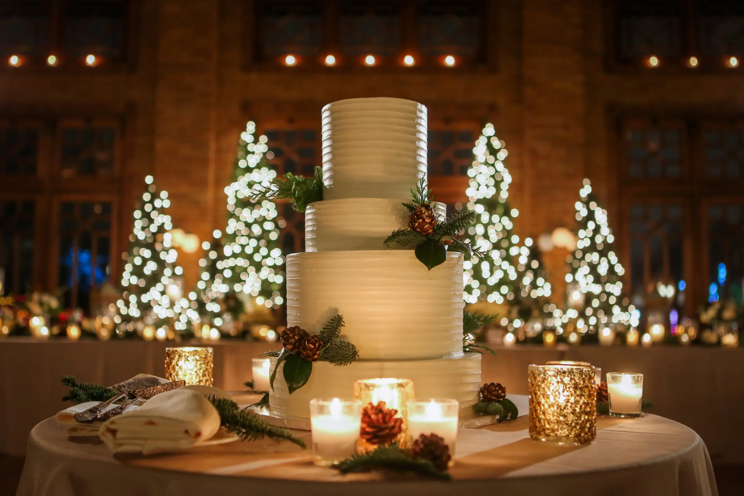 From there, everyone made their way to Great Hall of Café Brauer. The smells of delicious bites from Tiger Lily Catering made the mouth’s of guests water. The twinkling lights from above and below provided by Sound Investment truly gave life to that Hogwarts experience, and the winter foliage and candlelight provided by Stems Chicago gave life to not only tabletop, but in beautiful room focals including the magnificent Christmas trees strategically placed behind the head table. The cake by Flourish Cake Design featured bite size, edible pine cones which were ALMOST too cute to eat, and Okyne Media Lab kept the dance floor going until the very last moment – guests only to leave for a late-night slice of Domino’s Pizza – a non-negotiable piece of the wedding for Houston!