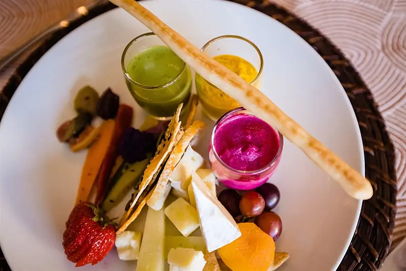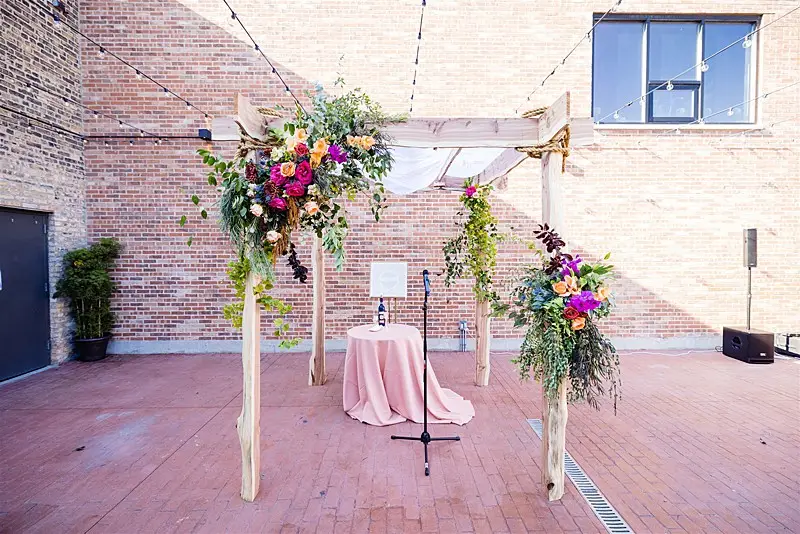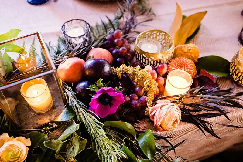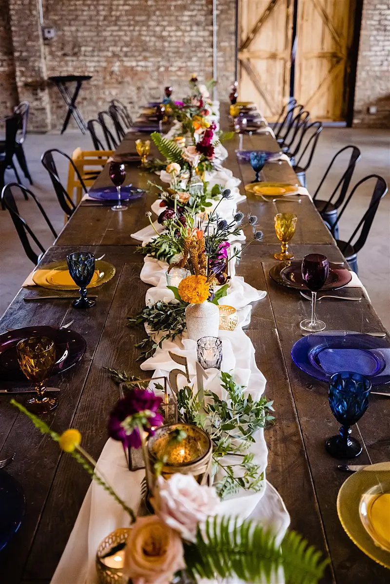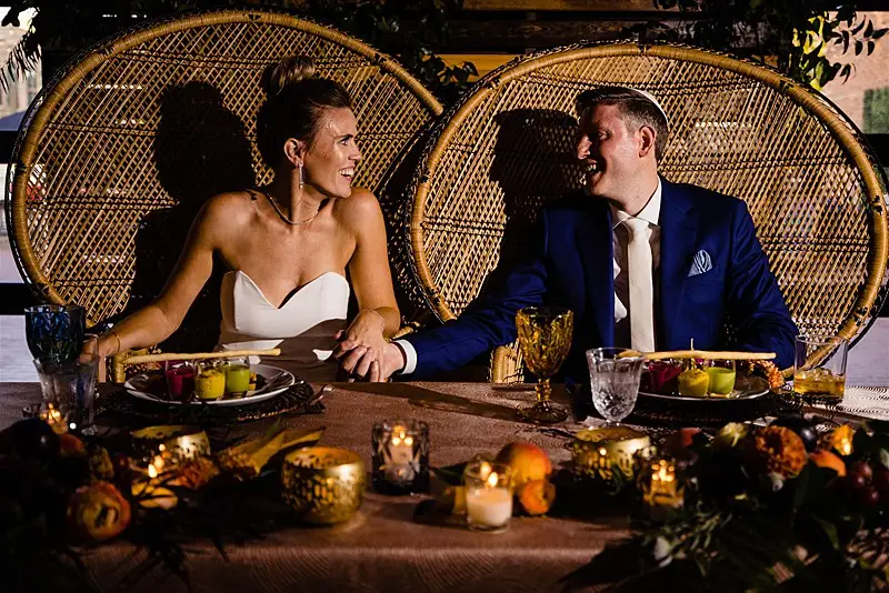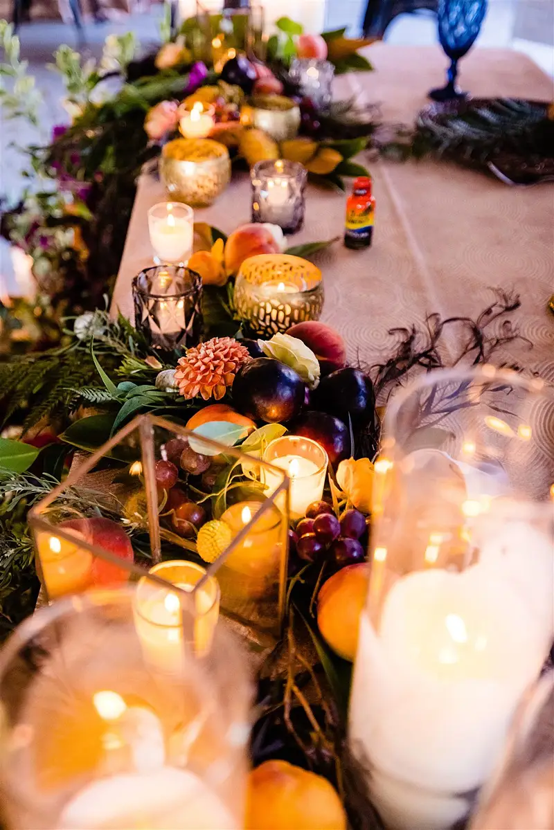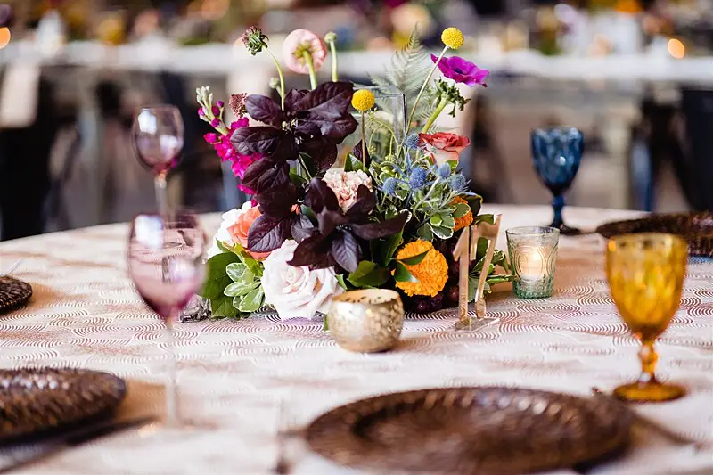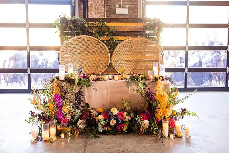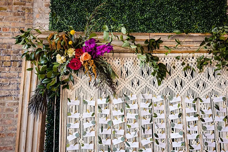 Once inside, guests were led to find their escort card on a stunning macrame hand crafted by Megan’s mom for the occasion. At their seats, they were greeted by colorful floral by Stems Chicago accented by fun touches of fresh fruit and produce to keep our tablescapes interesting and eclectic. Table settings were mismatched with various hues of glassware and chargers, and to top of the lively atmosphere, each guest had a personal charcuterie display at their seats that perfectly matched our color story. Megan and Colin had the most magical and bohemian setup for their sweetheart table – an explosion of vibrant blooms and candlelight, and fantastic Peacock Chair thrones to sit in provided by Bowery and Bash.