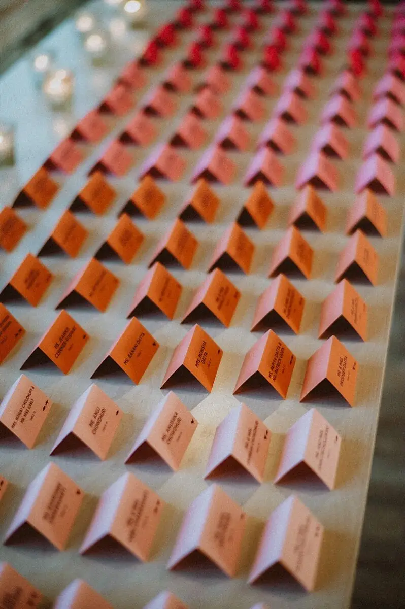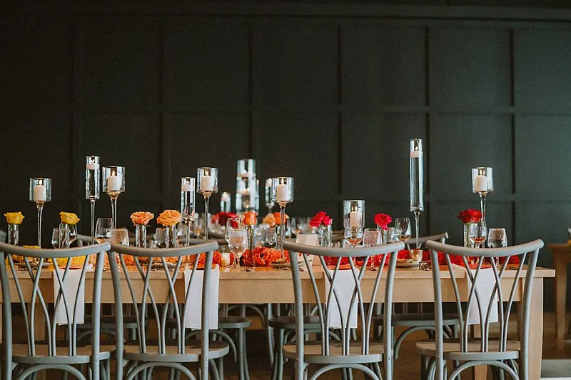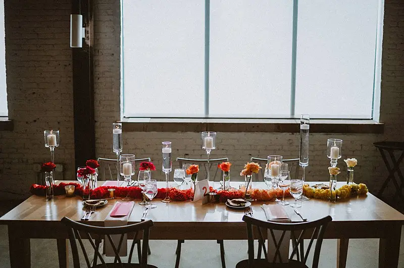 As is a LOLA signature, making the most of our décor is always top of mind. To make the color and vibrancy as modern as the space we were in, we chose to create an ombre effect with the colorful mandap, and the team at Yanni Designs did a wonderful job with that design. It would ultimately translate into a dance floor feature for our reception guests could enjoy all evening. Table décor was simple linear clear glass compotes of colorful blooms and tons and tons of candlelight. Ombre was also a strong element in the invitation, escort cards, and menus at each place setting. Color and clean lines can be incredibly impactful and cost-effective!