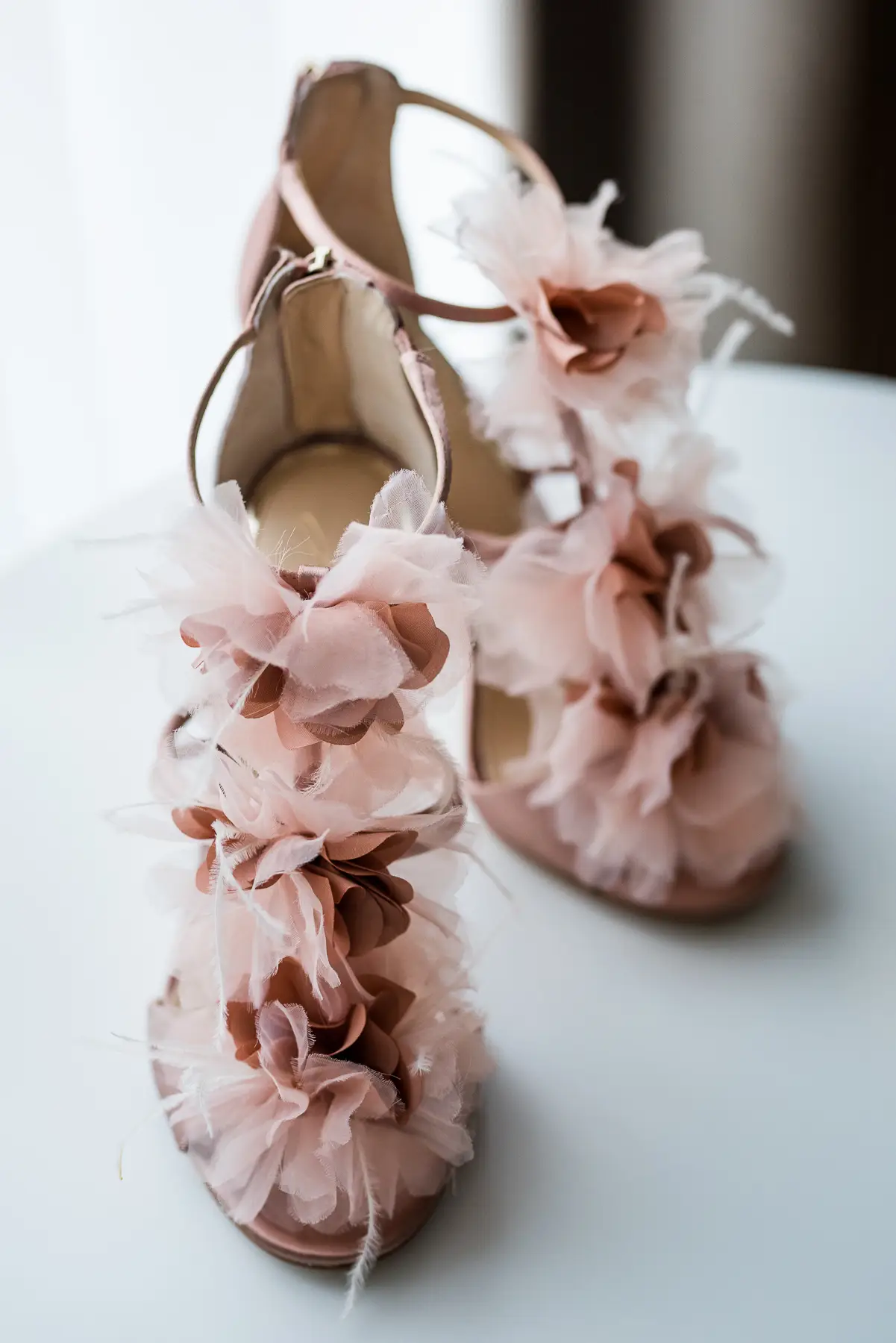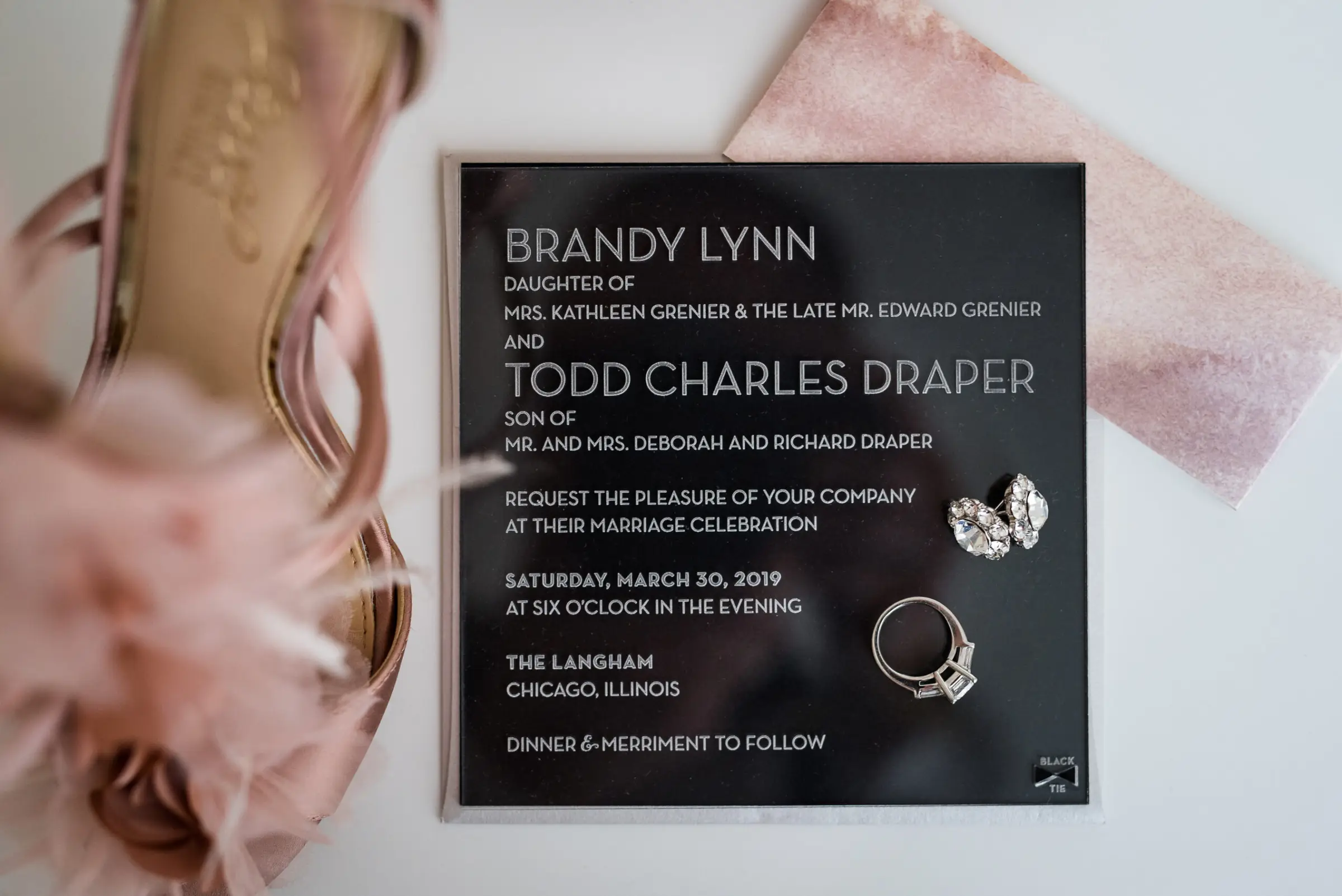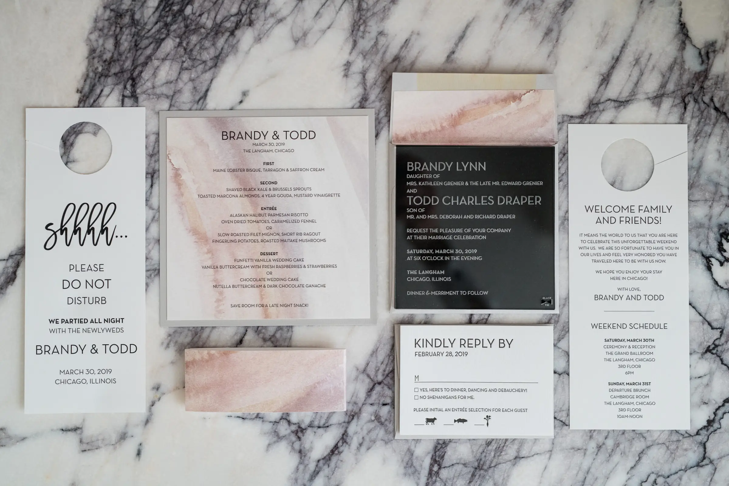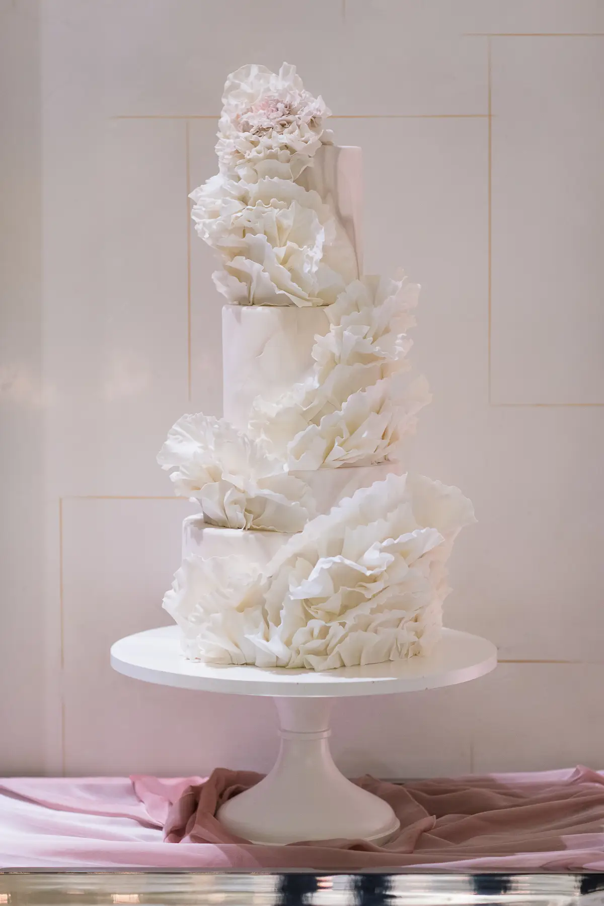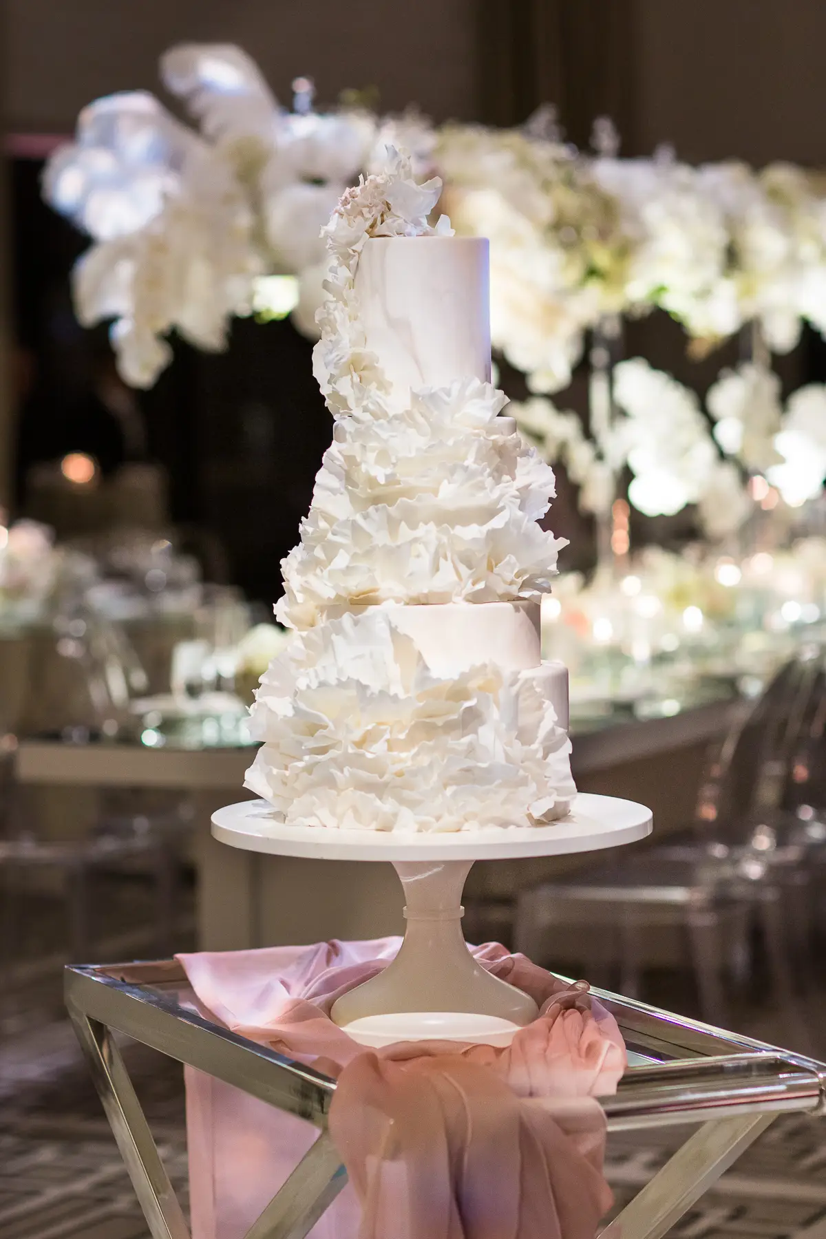 The first peek of our design was in the formally engraved Lucite invitation by Steracle Press that arrived in the mail. It was such a small touch, but we were OBSESSED with the small tie cut out in the corner for “black tie” – the invitation was backed with a black card stock so the images really popped when the envelope was opened. A soft marbled liner in taupe and sand tones softened the look and brought in our “barely there” ethereal palette. The marble look tied into our day of event stationery through the escort cards, menus and the absolutely stunning ruffled cake by Flourish Cake Studio.