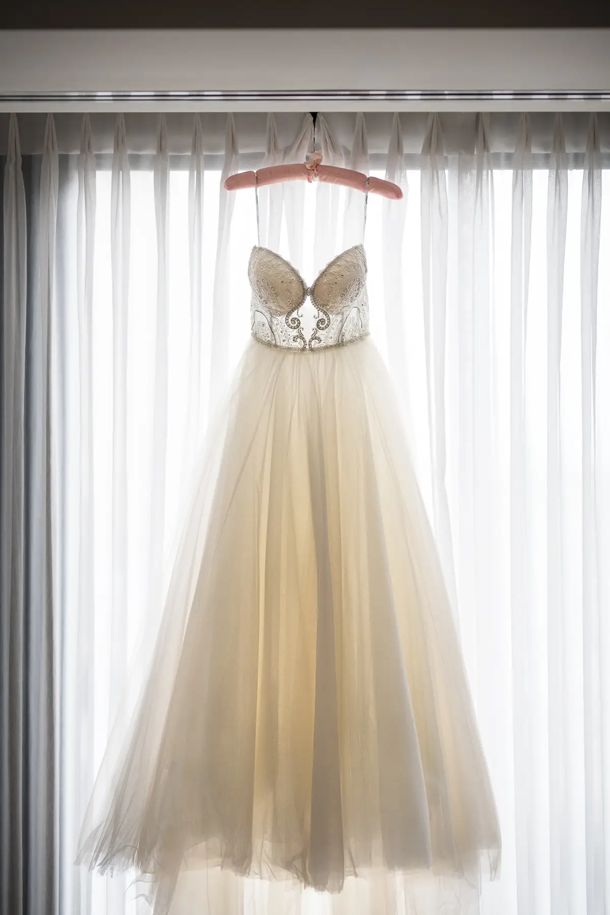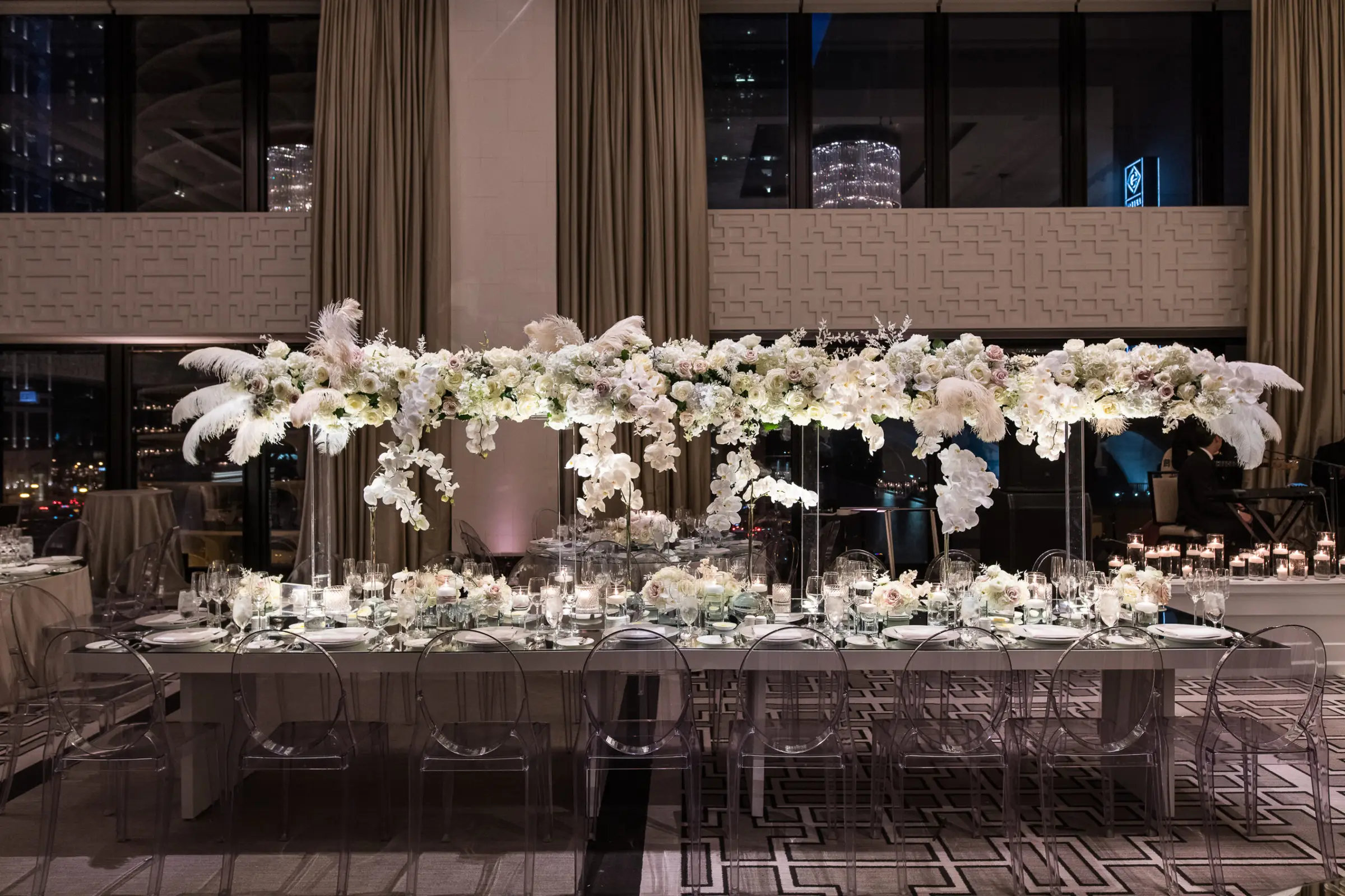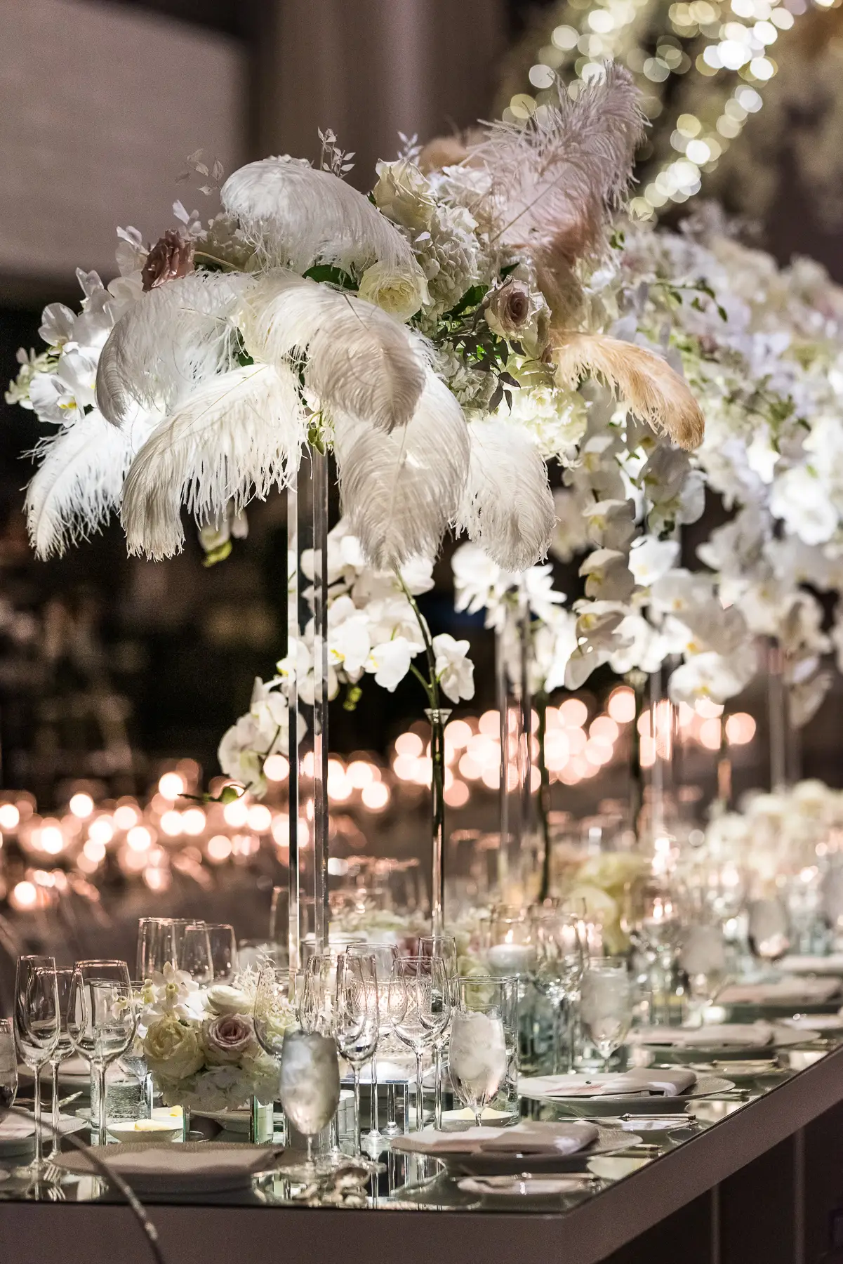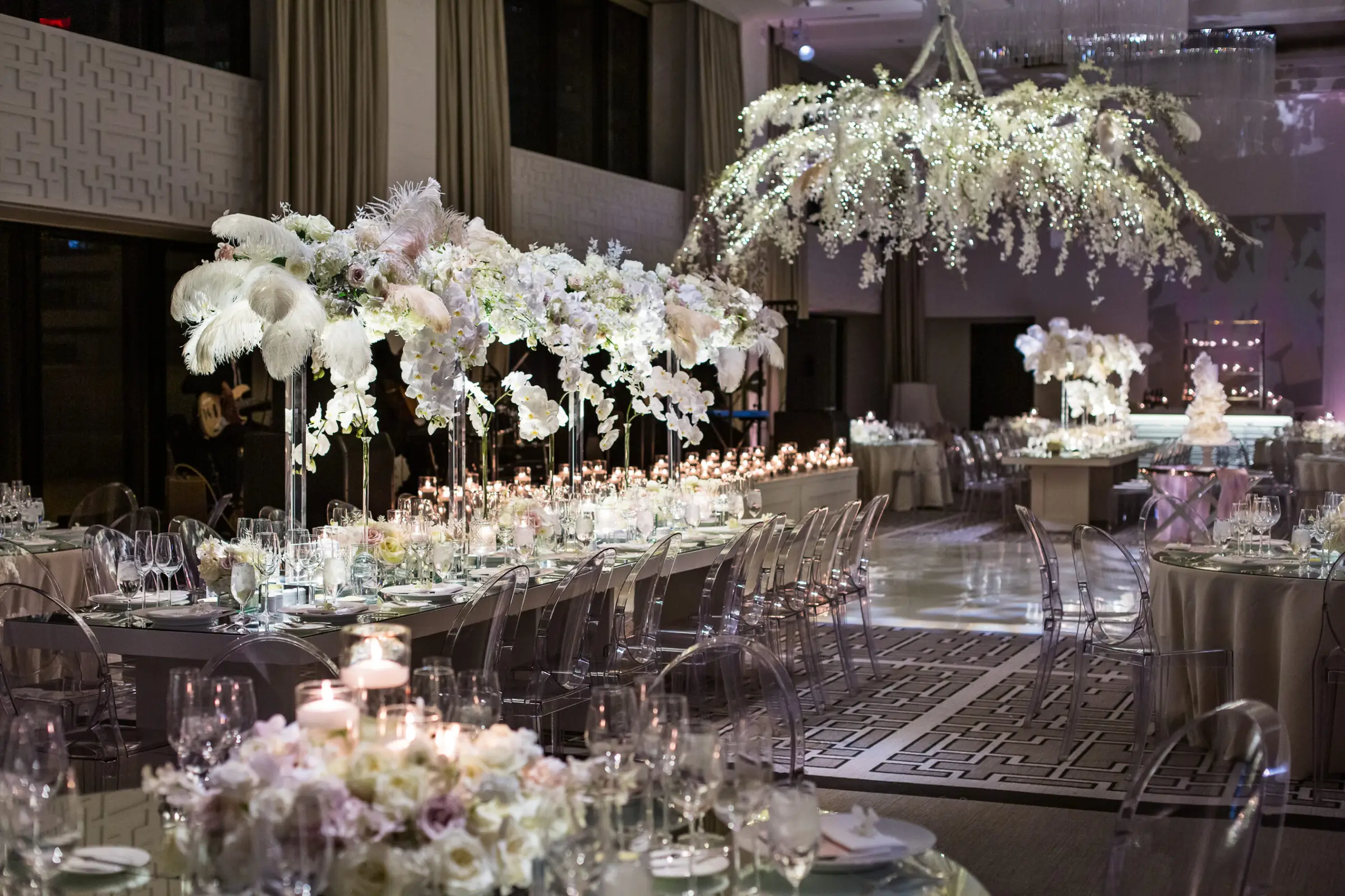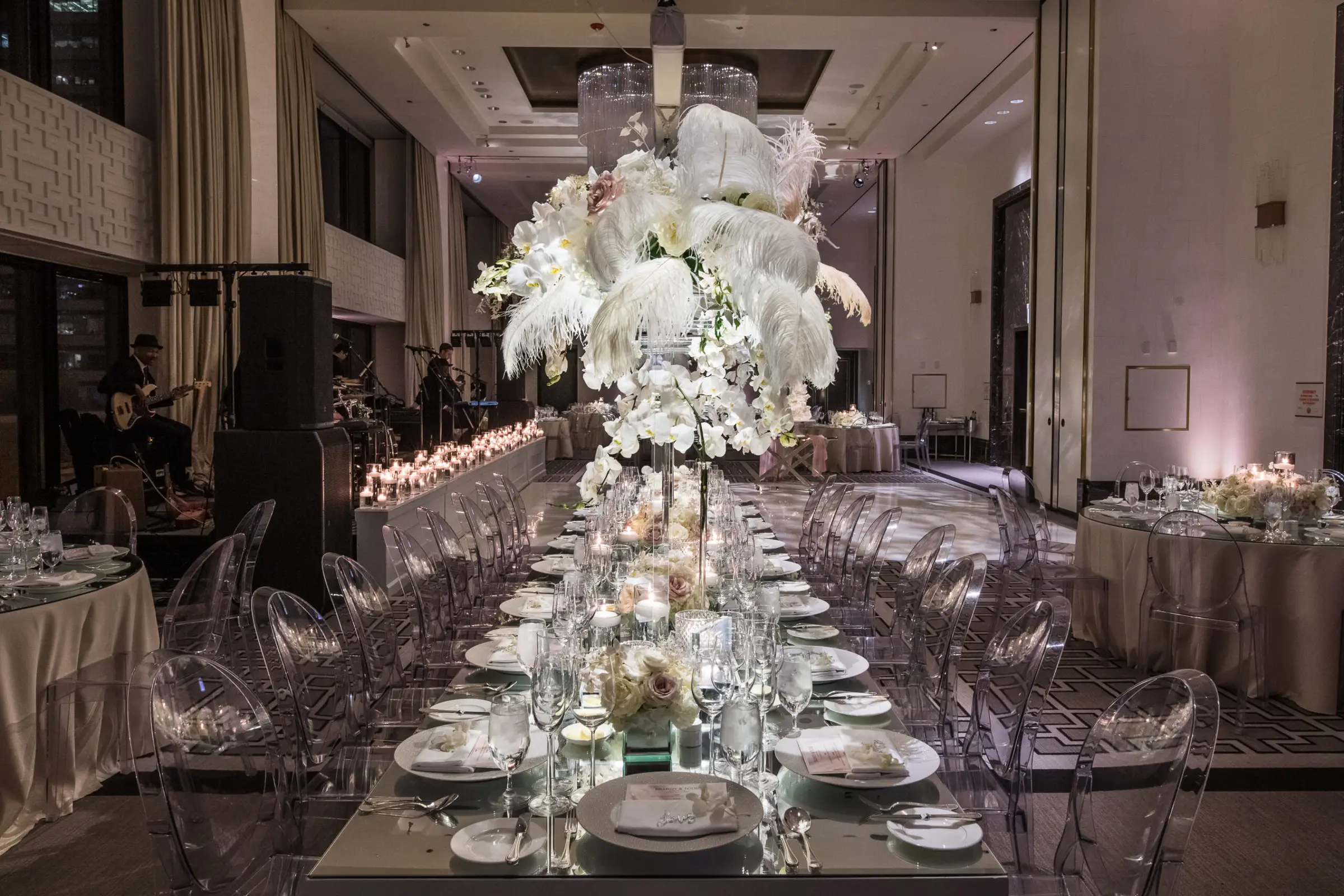 Our ceremony feature was a dreamy cloud-like creation of lights, feathers, orchids and a touch of magic. It played double duty in our reception as a gorgeous dance floor focal. Flanking the dance floor to either side of the room, long feasting tables of elevated orchids, feathers and roses accentuated the gorgeous rows of windows and beautiful architecture of the ballroom. Mirrored tabletops, custom bars and tons of candlelight finished the look of the room. Mirage ‘ghost’ chairs by Tablescapes Rentals created an unfettered look at the clean lines of the tables… not that guests were seated long when you had the Gold Coast All Stars rocking the dance floor!