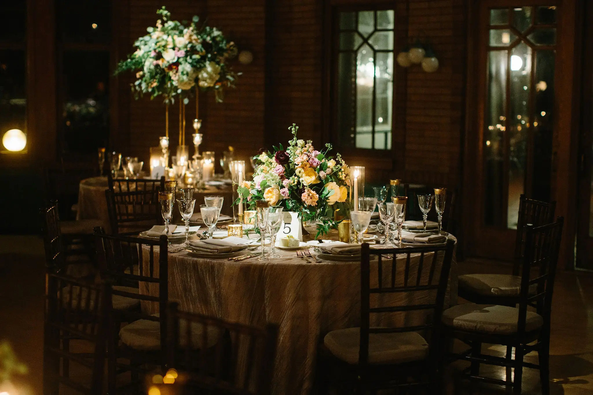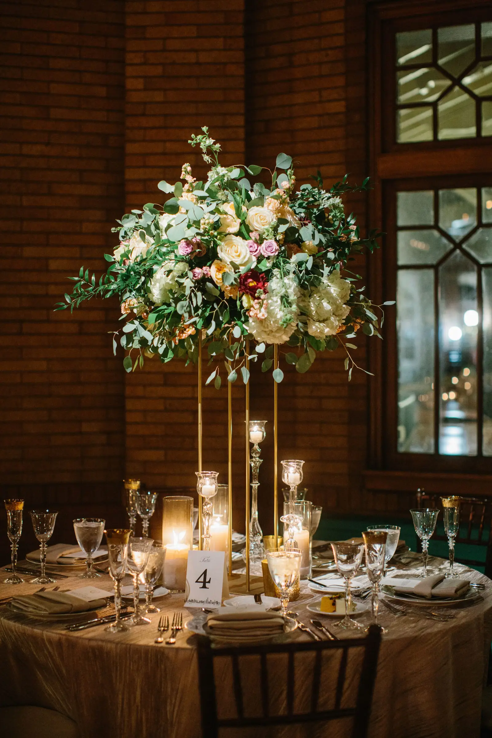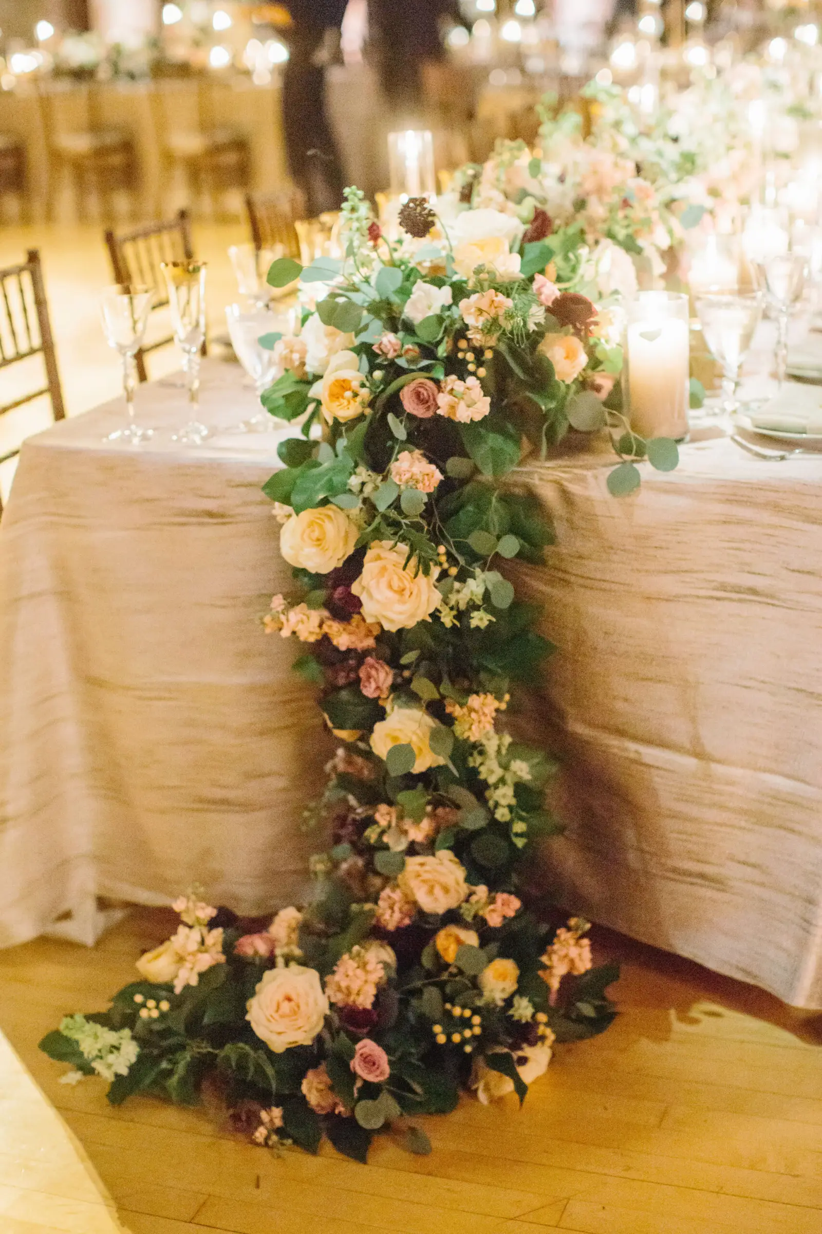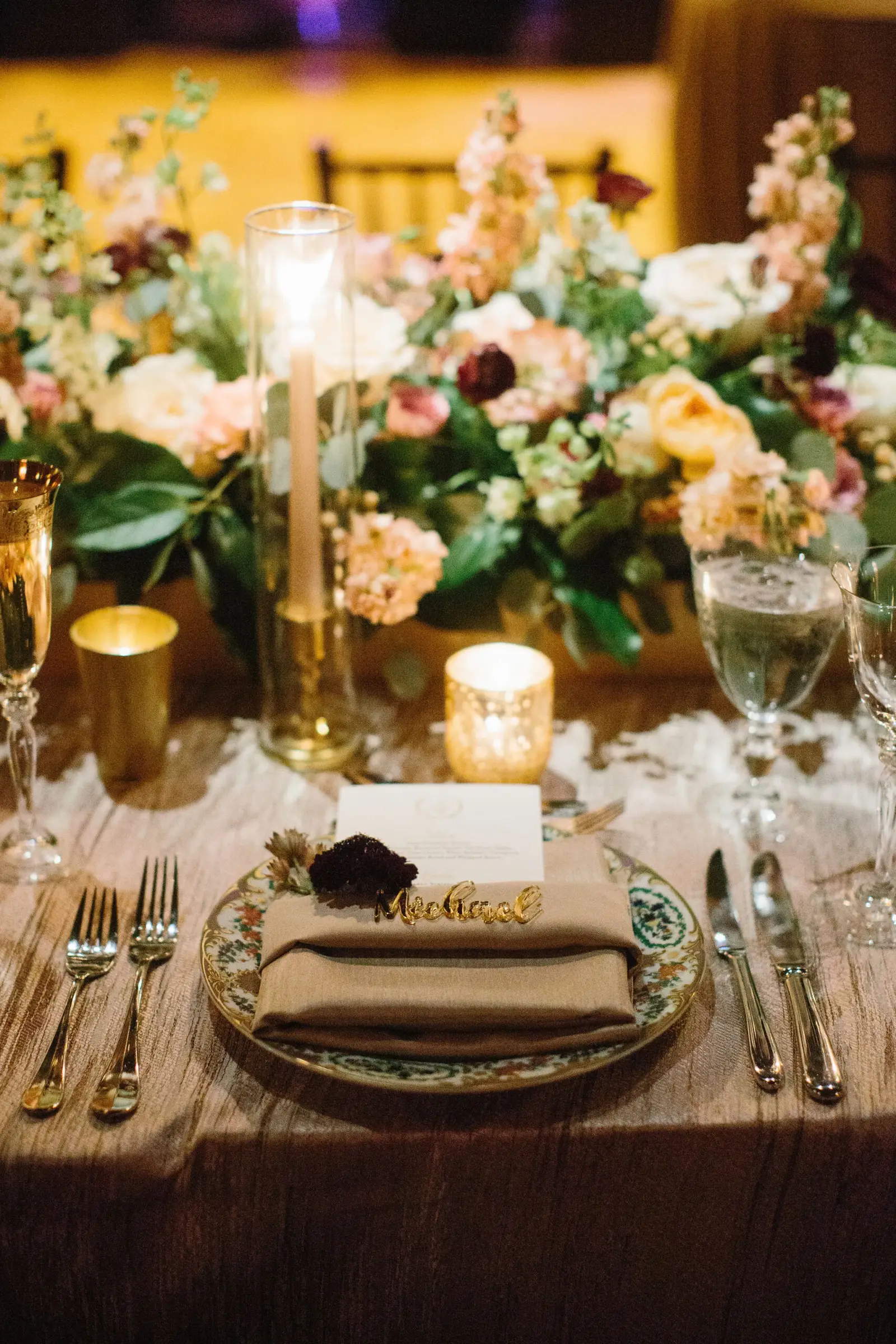 Every wedding we plan in Café Brauer is so unique and Jen and Michael’s was no exception. In the summer, this venue is light and bright and green, but in the fall it becomes sexy and moody and we capitalize on lighting through Frost Chicago within every level of the room. For Jen and Michael, we flooded the room with candlelight hanging from the ceiling, placed in all the windows, on the tabletops and more… and the floral by Exquisite Designs in a fall palette of ivory, champagne, plum, lavender, peach and taupe along with glittering metallic votives was lush, elegant and timeless. Jen LOVES flowers and they were cascading off every surface in the room. It was absolutely DREAMY! Textural linen from BBJ Linen and carefully selected tabletop appointments from Halls Rentals completed the look at each table.