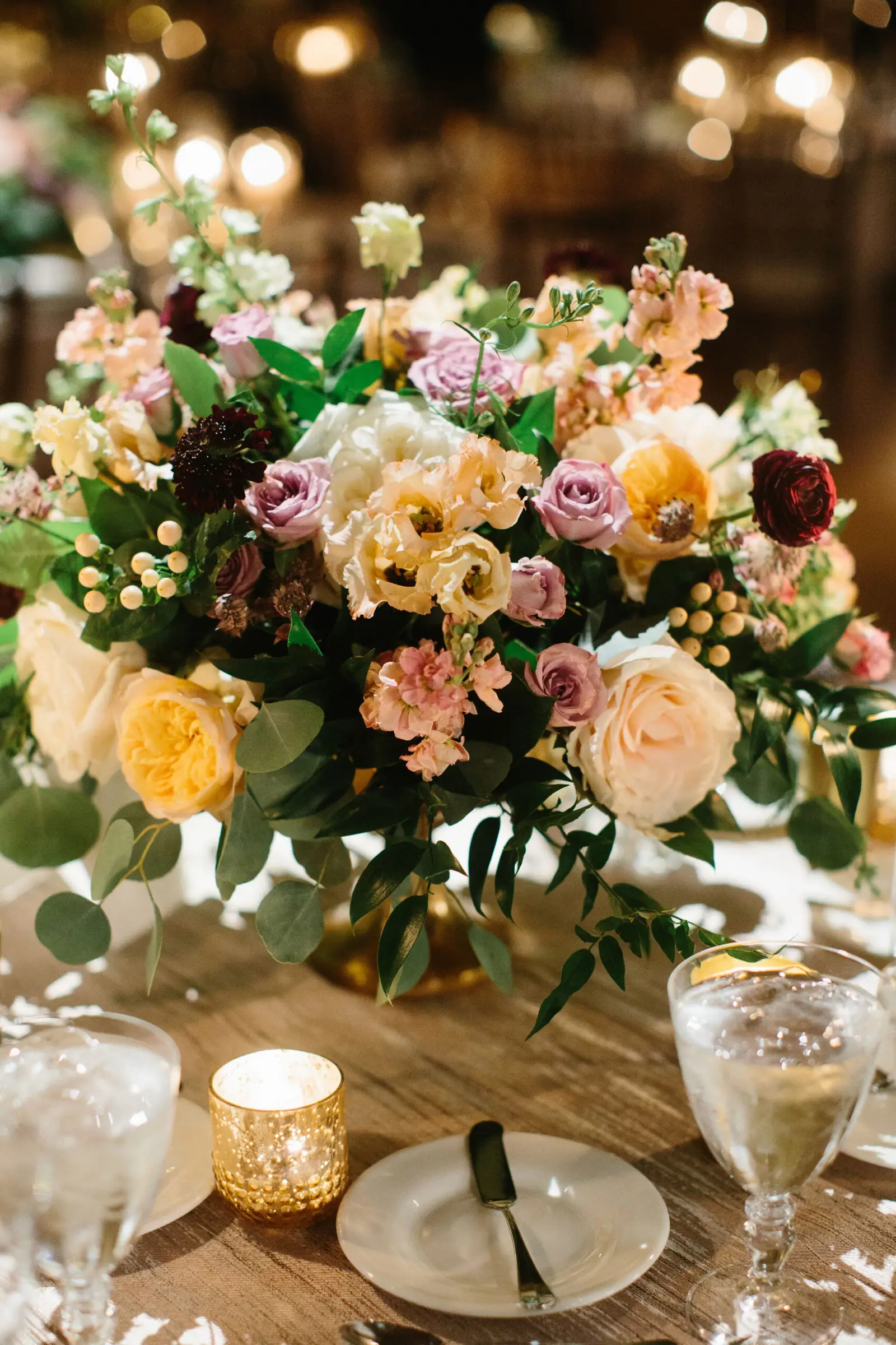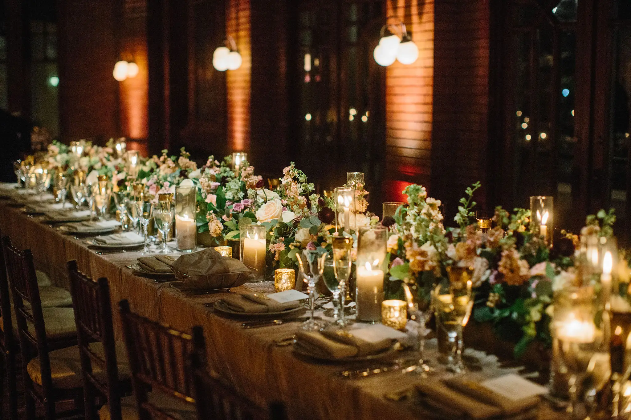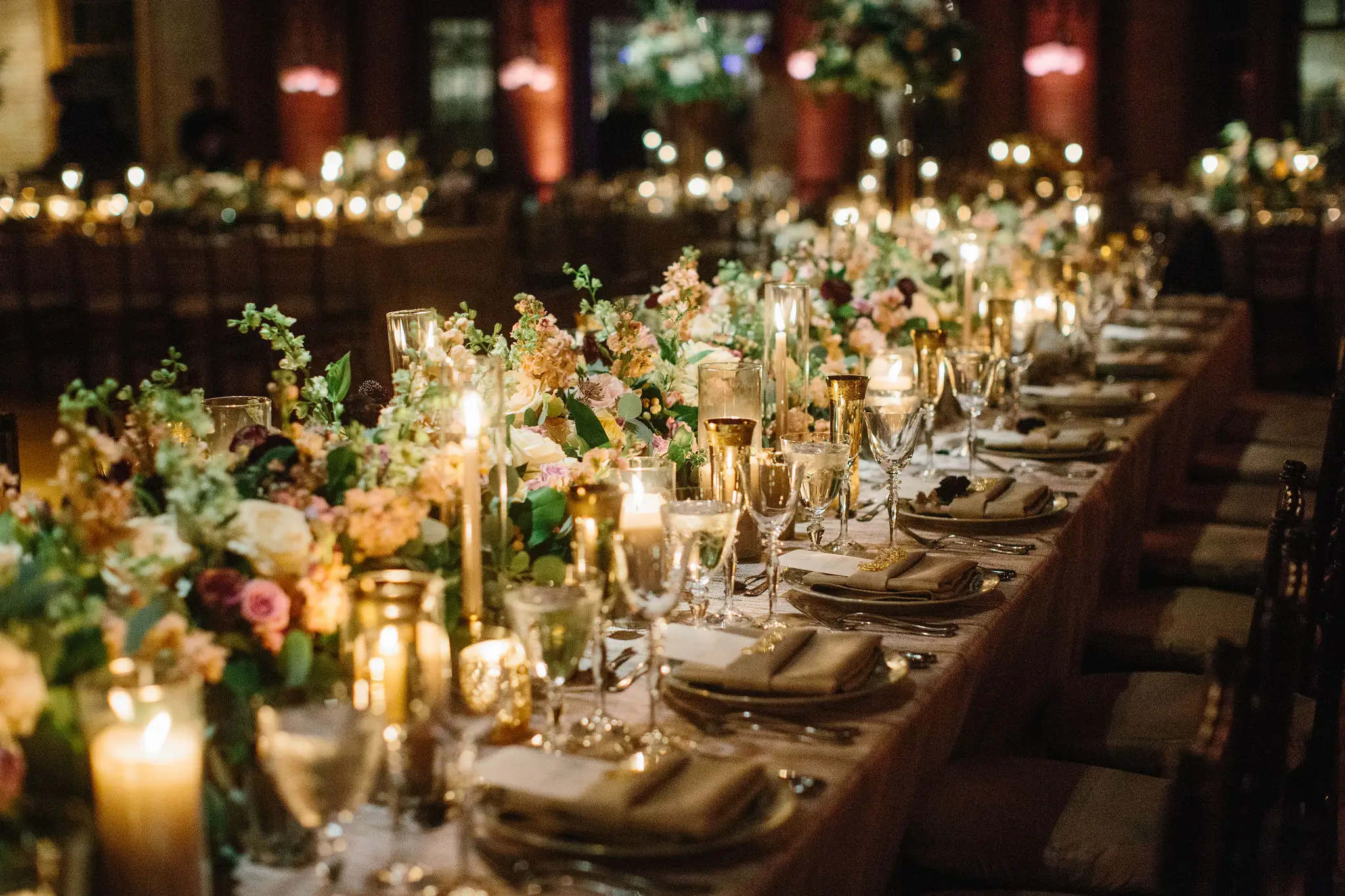 Every wedding we plan in Café Brauer is so unique and Jen and Michael’s was no exception. In the summer, this venue is light and bright and green, but in the fall it becomes sexy and moody and we capitalize on lighting through Frost Chicago within every level of the room. For Jen and Michael, we flooded the room with candlelight hanging from the ceiling, placed in all the windows, on the tabletops and more… and the floral by Exquisite Designs in a fall palette of ivory, champagne, plum, lavender, peach and taupe along with glittering metallic votives was lush, elegant and timeless. Jen LOVES flowers and they were cascading off every surface in the room. It was absolutely DREAMY! Textural linen from BBJ Linen and carefully selected tabletop appointments from Halls Rentals completed the look at each table.