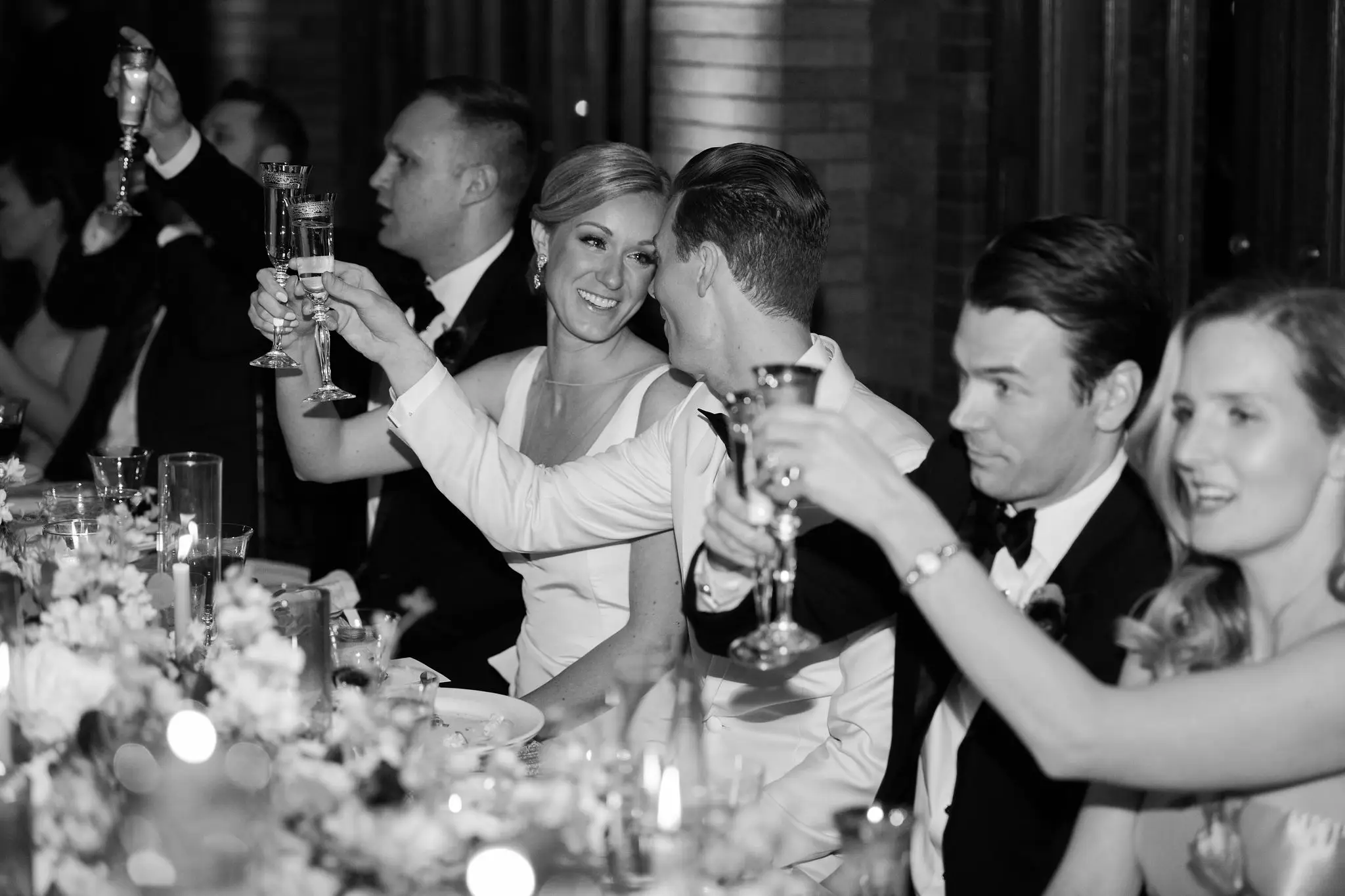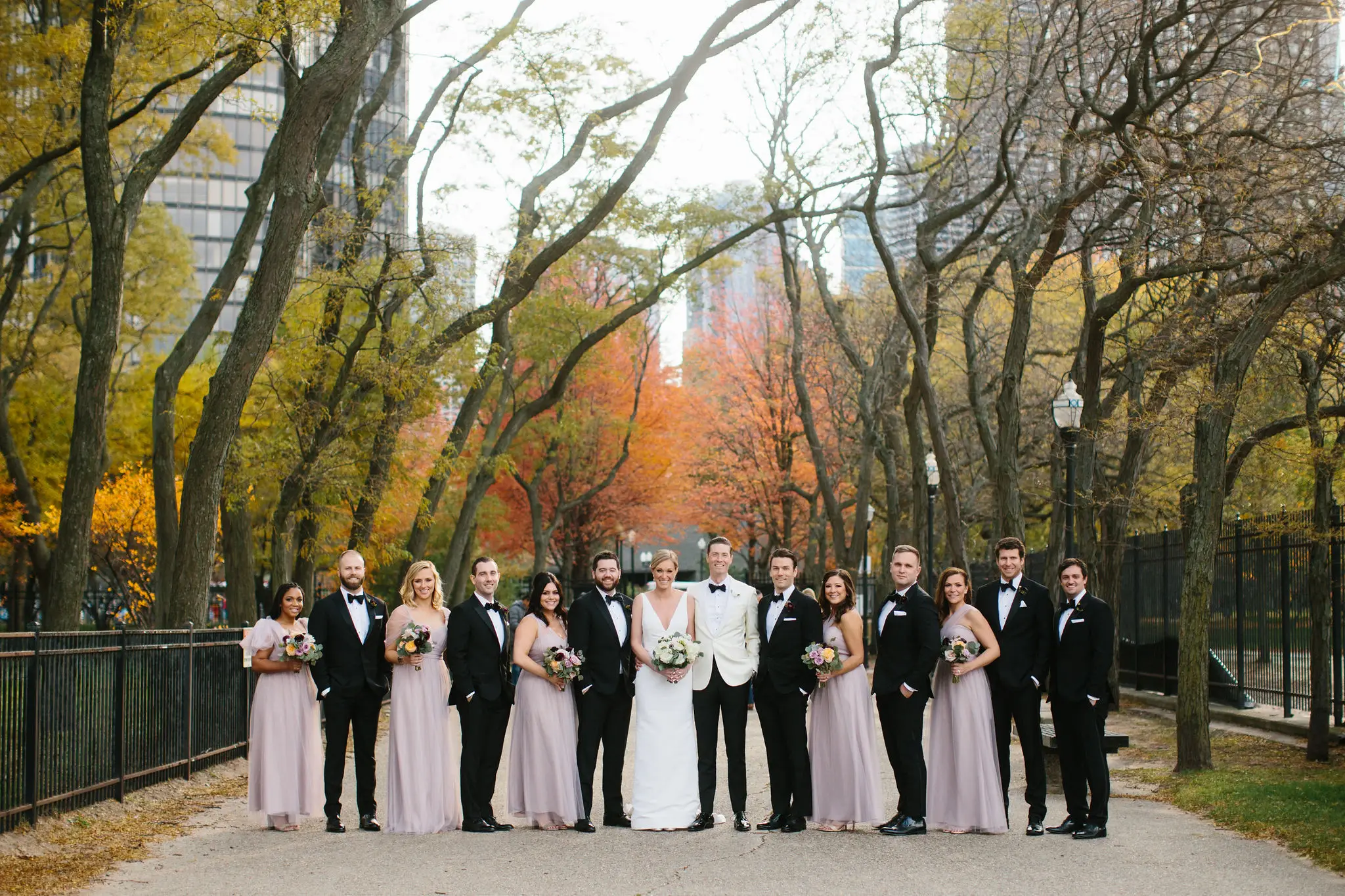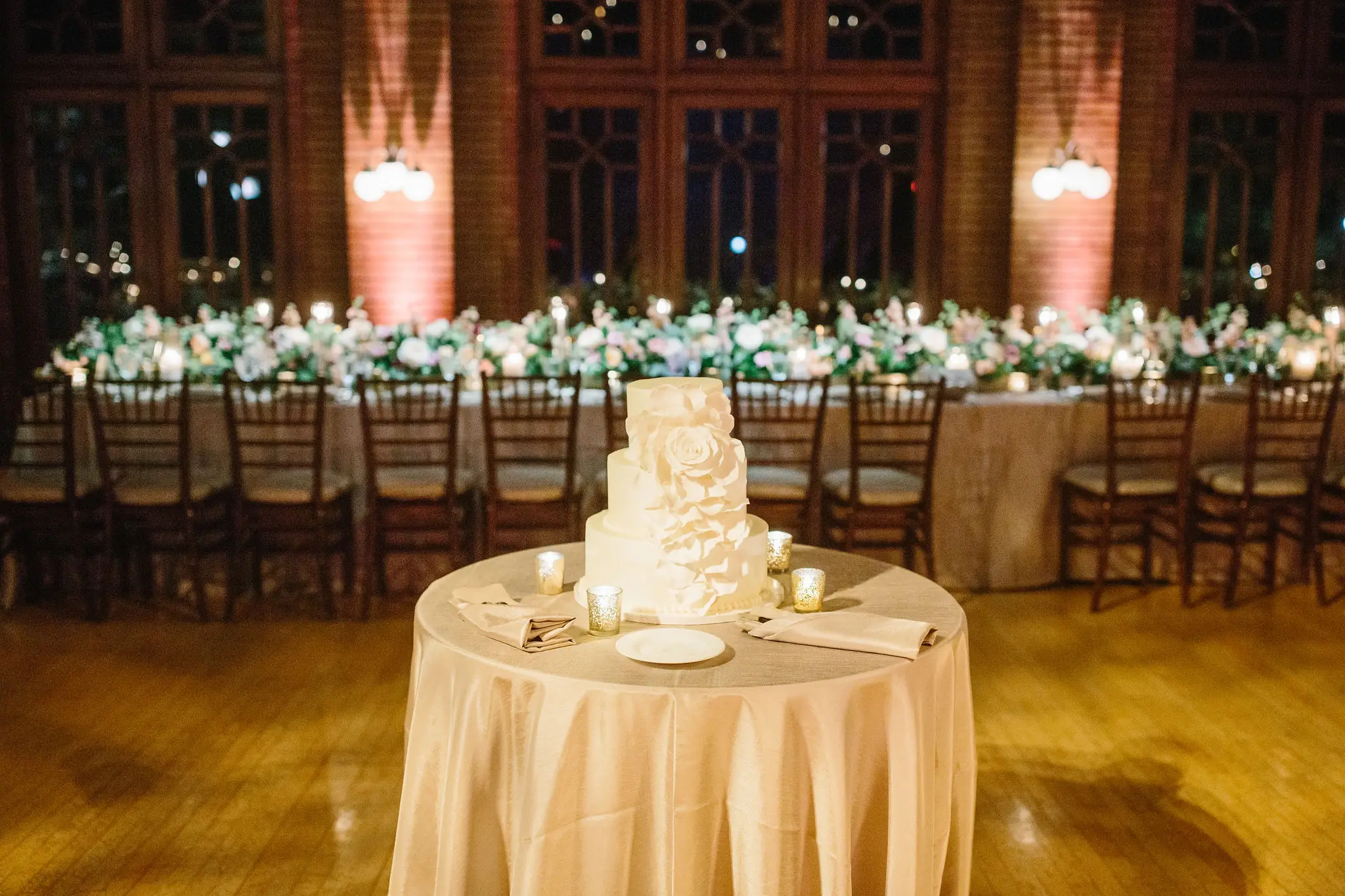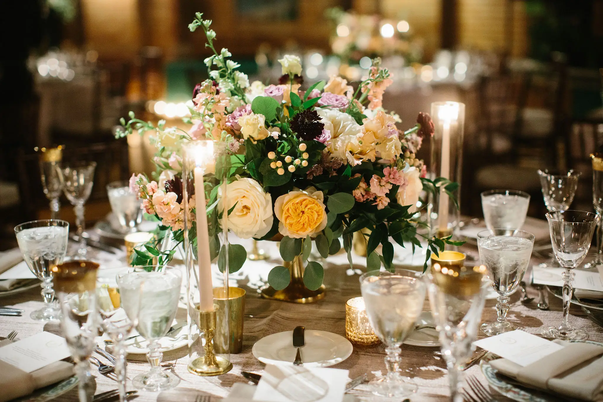 Every wedding we plan in Café Brauer is so unique and Jen and Michael’s was no exception. In the summer, this venue is light and bright and green, but in the fall it becomes sexy and moody and we capitalize on lighting through Frost Chicago within every level of the room. For Jen and Michael, we flooded the room with candlelight hanging from the ceiling, placed in all the windows, on the tabletops and more… and the floral by Exquisite Designs in a fall palette of ivory, champagne, plum, lavender, peach and taupe along with glittering metallic votives was lush, elegant and timeless. Jen LOVES flowers and they were cascading off every surface in the room. It was absolutely DREAMY! Textural linen from BBJ Linen and carefully selected tabletop appointments from Halls Rentals completed the look at each table.
