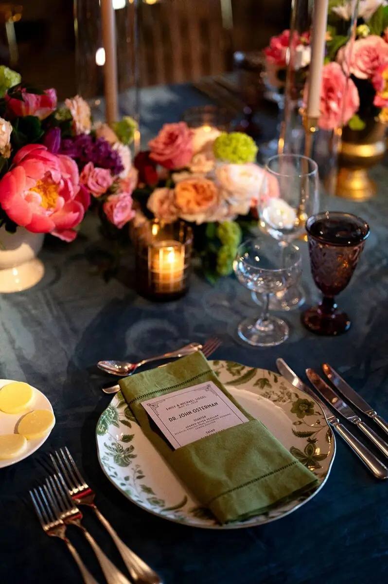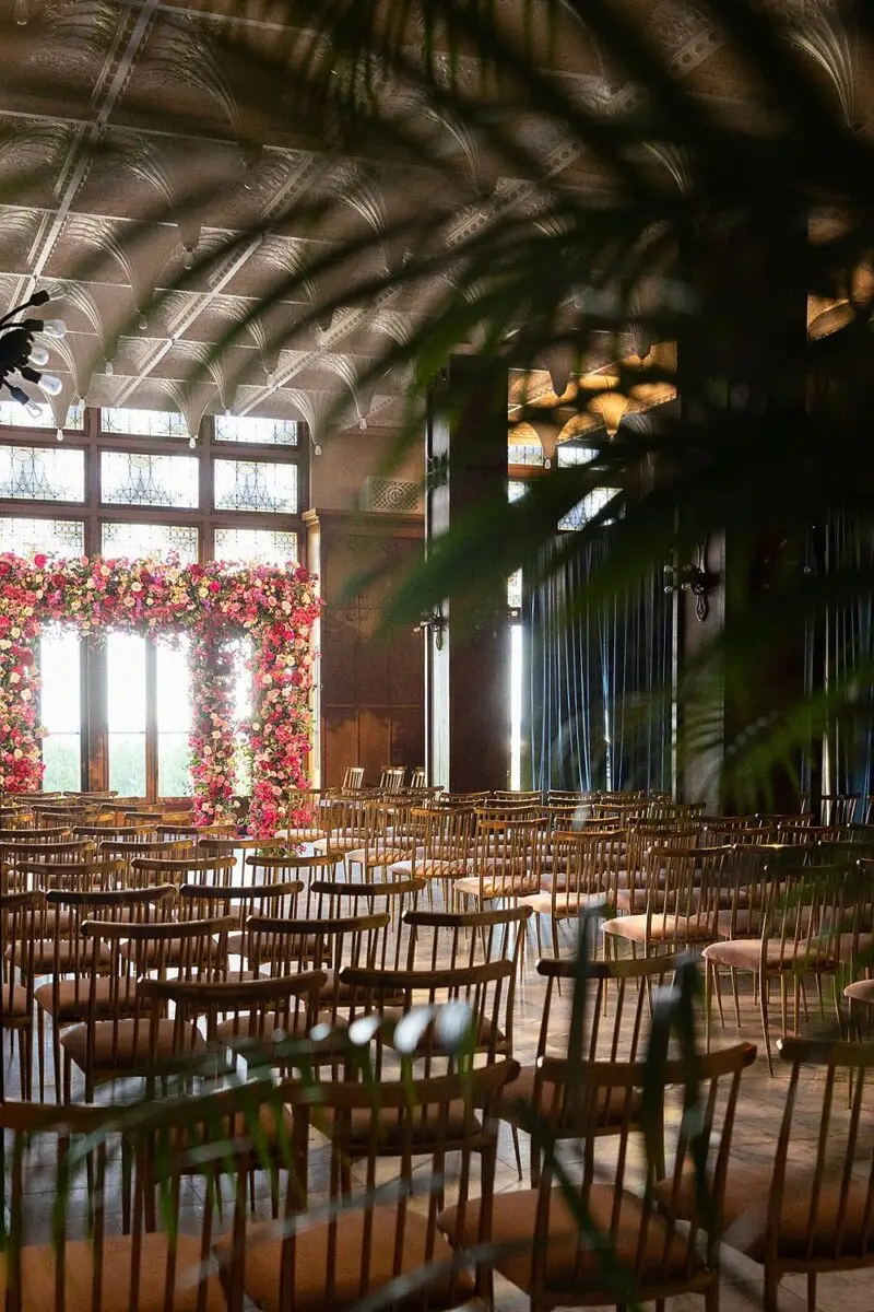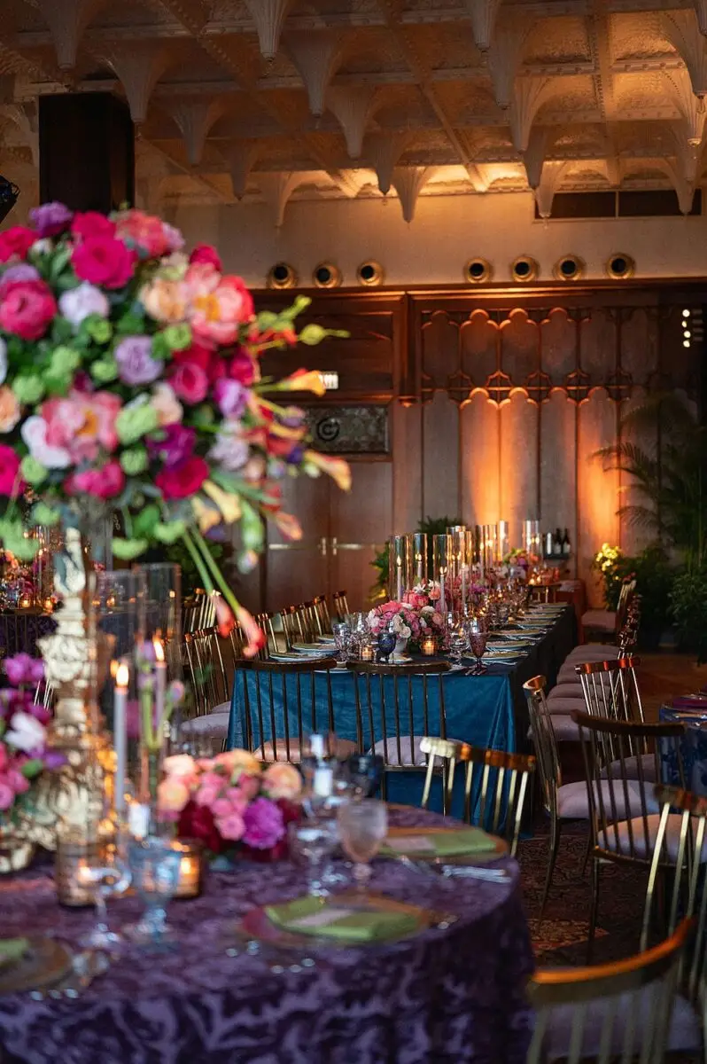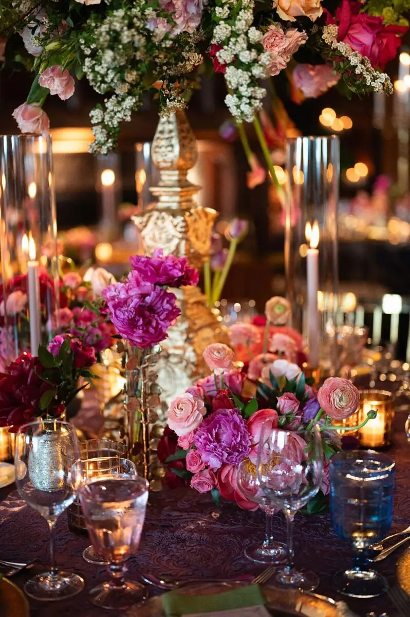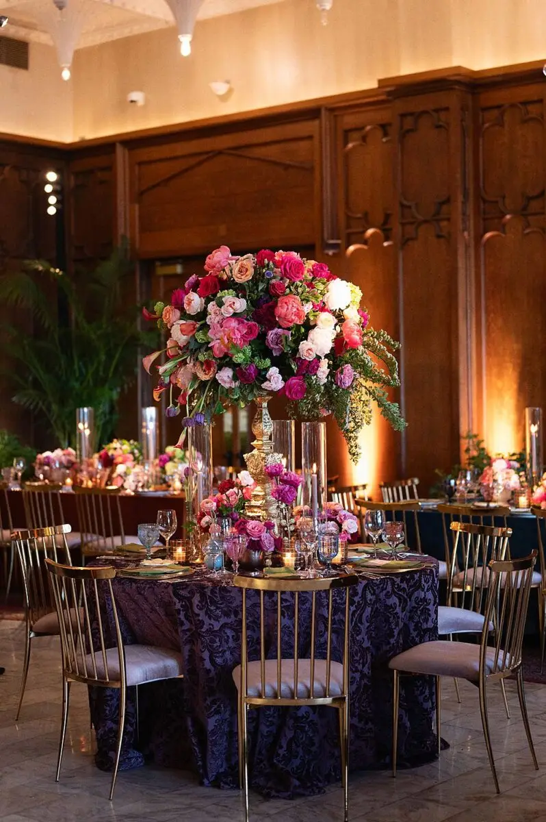 As a wedding planner in Chicago, I have really love how couples have embraced COLOR for their wedding design this year. I’m a huge fan of a big fat white wedding, but there is something about the vibrancy of the full spectrum of color that gets me really excited from a design perspective. Thankfully for me, Emily and Michael were fully on board too! Our inspo boards were pulled from the runways of Gucci and Dior in the way they mix color, pattern and texture, and the full embrace of floral and candelabras was pulled right from an episode of Bridgerton. Filling each corner with vintage rugs, romantic candlelight and plants highlighted the architecturally inspiring corners of the Madison and White City Ballrooms at the Chicago Athletic Association Hotel and completed the design. HMR pulled the look off effortlessly and finished the design with linen and chairs from Nuage Designs and stationery from Steracle Press.