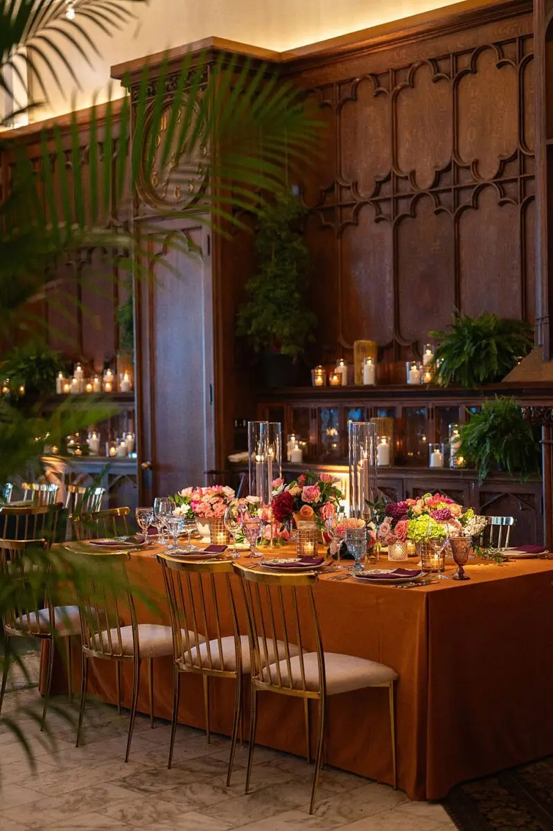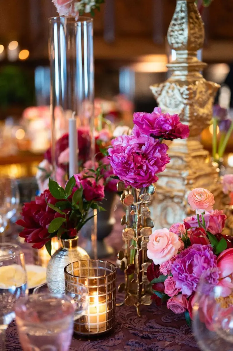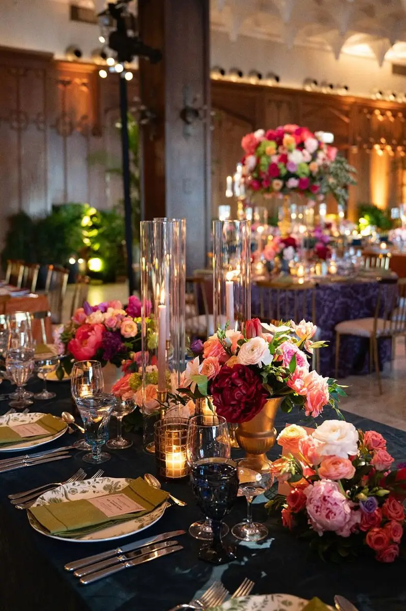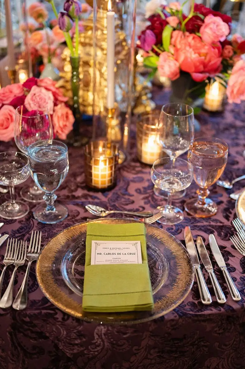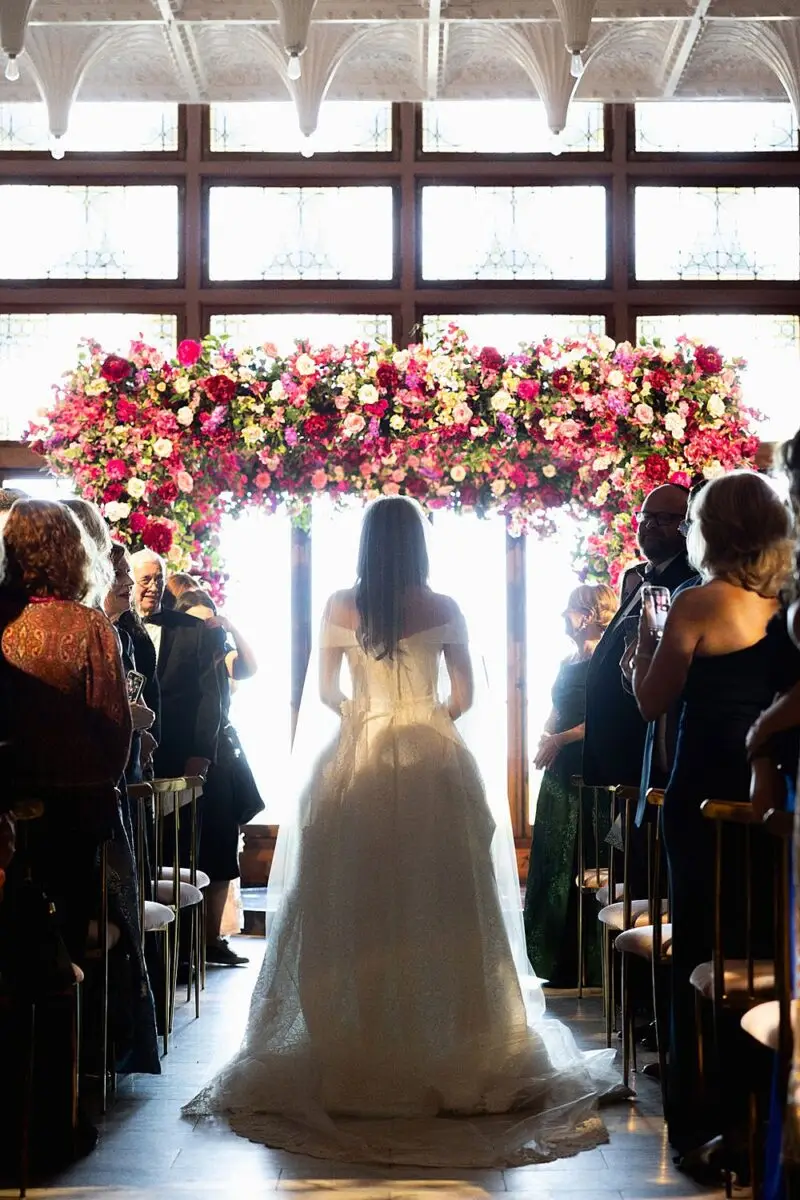 As a wedding planner in Chicago, I have really love how couples have embraced COLOR for their wedding design this year. I’m a huge fan of a big fat white wedding, but there is something about the vibrancy of the full spectrum of color that gets me really excited from a design perspective. Thankfully for me, Emily and Michael were fully on board too! Our inspo boards were pulled from the runways of Gucci and Dior in the way they mix color, pattern and texture, and the full embrace of floral and candelabras was pulled right from an episode of Bridgerton. Filling each corner with vintage rugs, romantic candlelight and plants highlighted the architecturally inspiring corners of the Madison and White City Ballrooms at the Chicago Athletic Association Hotel and completed the design. HMR pulled the look off effortlessly and finished the design with linen and chairs from Nuage Designs and stationery from Steracle Press.
