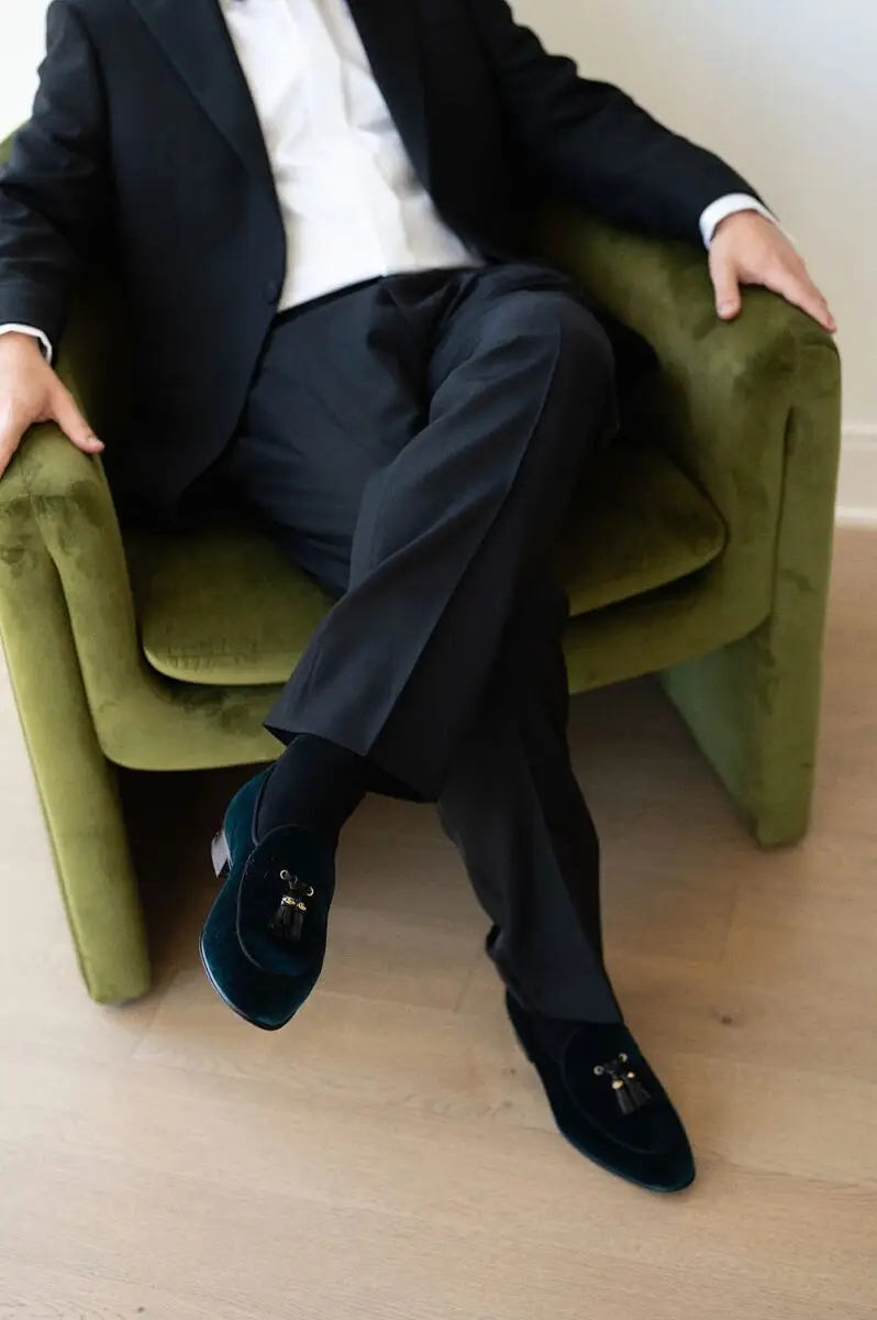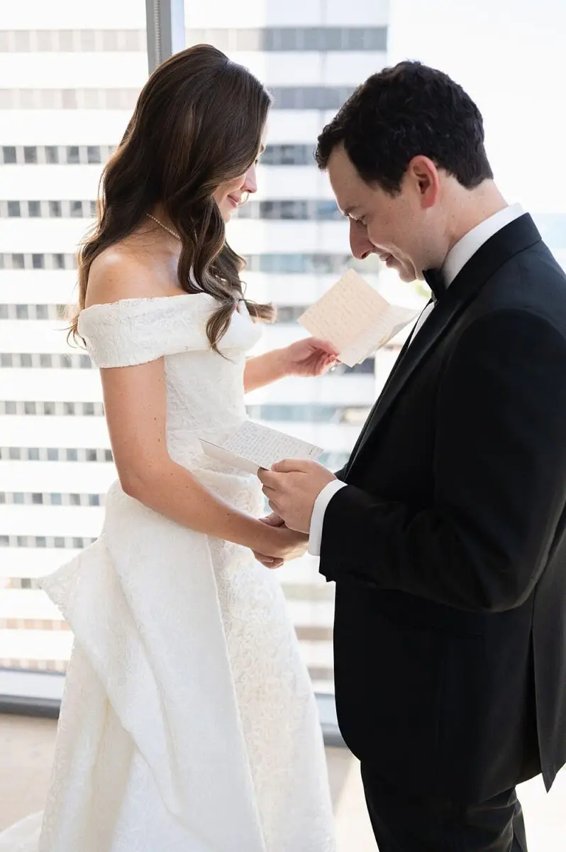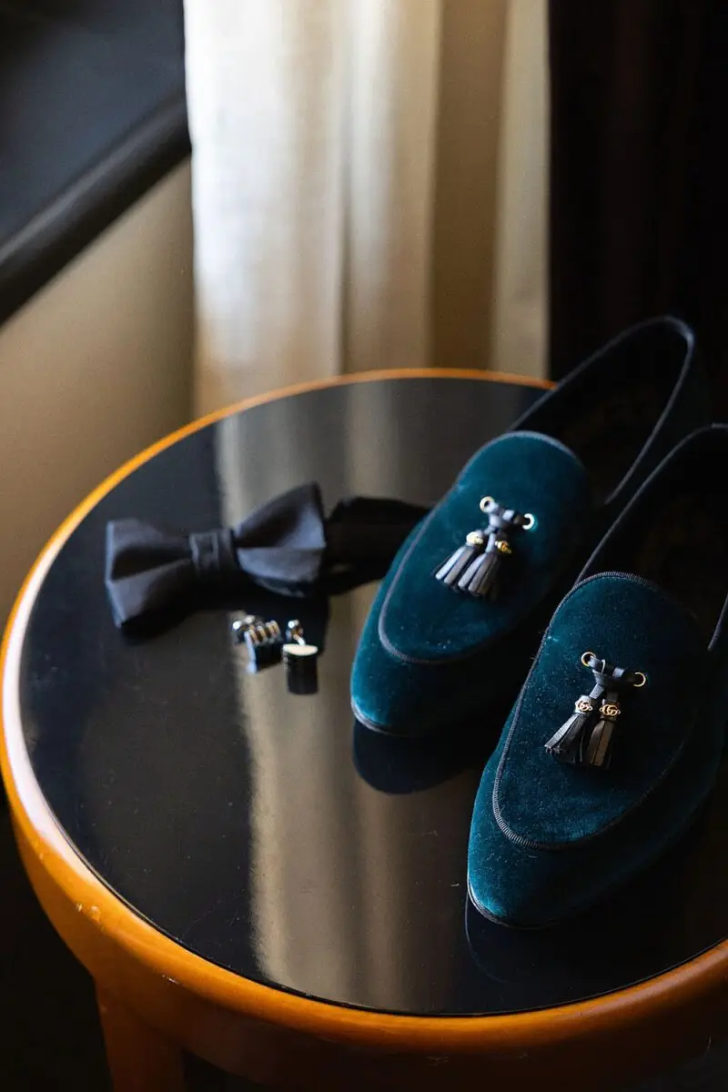Emily wore a Vivienne Westwood gown that perfectly reflected the architecture of the venue with its clean lines and gorgeous textural lace and the groom wore his favorite black Prada tuxedo (the guys really made the most of their morning prep using the golf sim at the hotel for some hijinks before photos started!). Of course, they were both rocking Gucci shoes (I mean, the green boxes were literally part of our inspo!). The wedding party complimented the bride and groom in their mixed attire from Anthropologie Weddings creating an effortless style for photos. Rare Bird Beauties completed their looks with gorgeous glam.