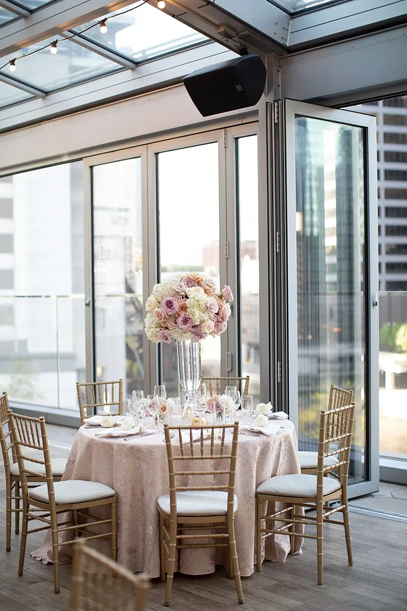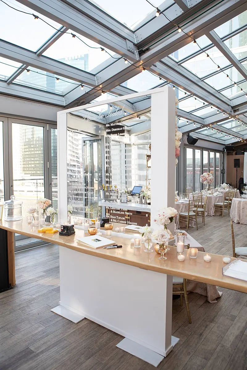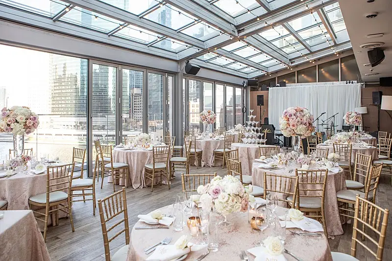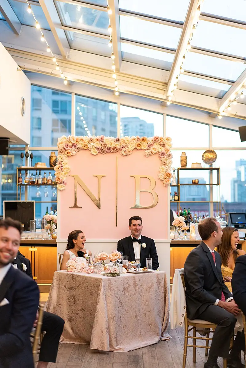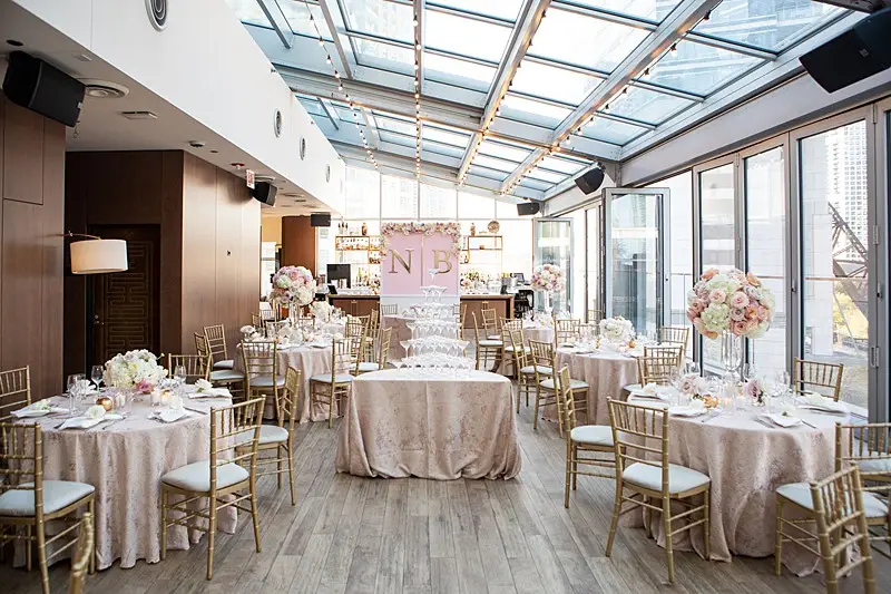 When Nora and Brian started planning their Spring 2021 wedding, “covid-19” was a word none of us had ever heard before. Soon after we got started, the pandemic hit and took the wind out of our sails. We quickly realized that the best way for the clients (and their planner) to sleep at night and be able to look forward to the wedding, was to plan something intimate and safe so there would be no need to pivot if things didn’t clear up by spring. When everyone else was taking their plans from 200 guests to 50 or less, we had already made the move to a small wedding and we were getting excited about the possibilities. Outdoor weddings were gaining popularity as more ‘pandemic-proof’ venues, and Gibson’s Italia was the perfect choice with its floor-to-ceiling windows that opened up to the Chicago skyline and even a retractable roof if it was a perfect day. NO worries about the weather for N&B!