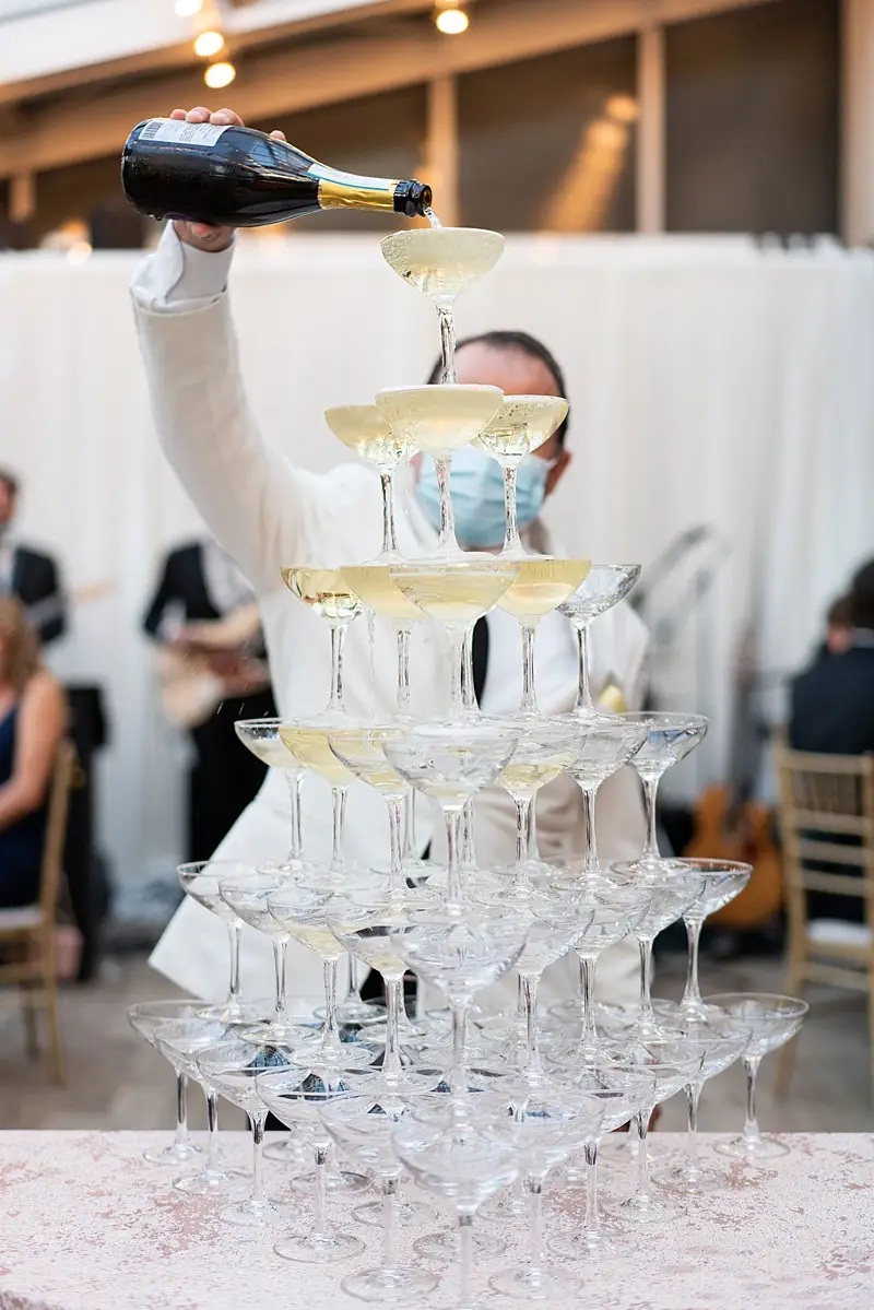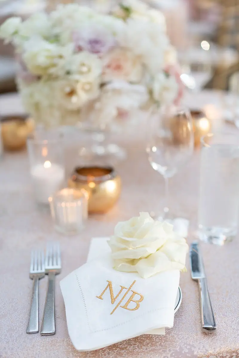 Creating this intimate affair gave us so many opportunities to change things up from the normal 3-courses tableside and dancing reception. Nora and Brian had an elaborate champagne tower instead of a cake-cutting ceremony, and guests enjoyed a 5-course meal and the couple’s favorite dessert in lieu of cake; a hot-out-of-the-oven skillet chocolate chip cookie topped with gelato! Each guest’s place setting was designed with an ivory garden rose and the custom monogrammed napkin that will become a client keepsake reminding them of their wedding day whenever they set the table for their friends and family.