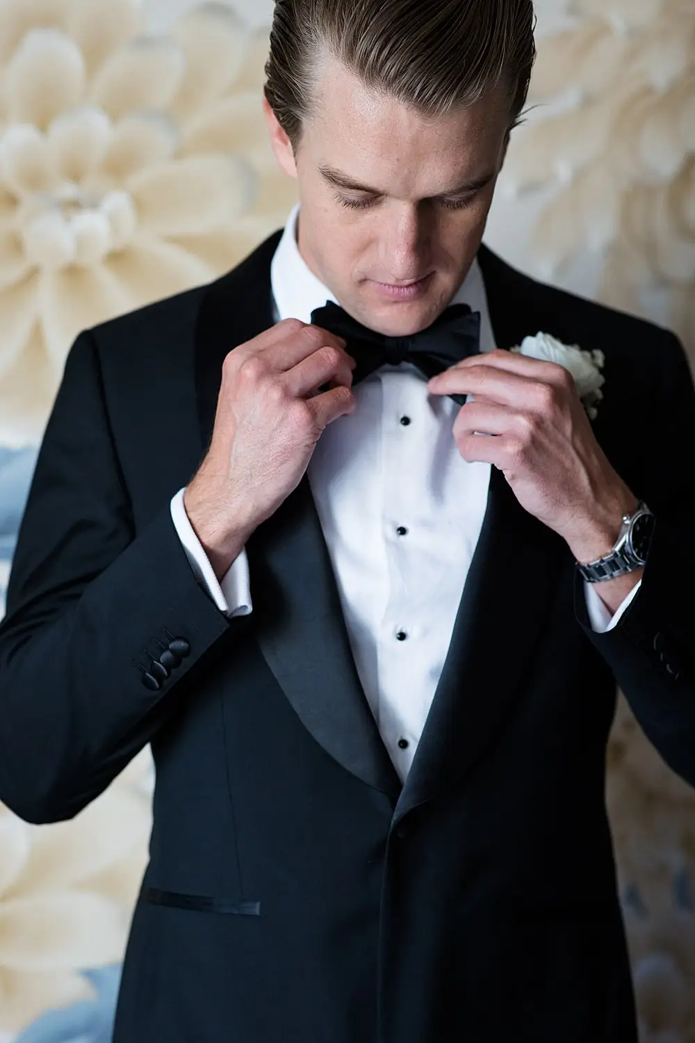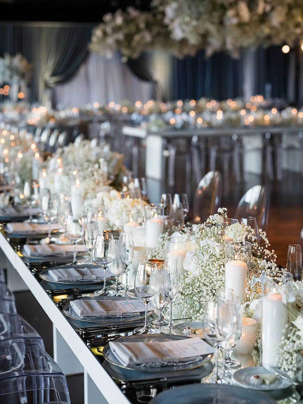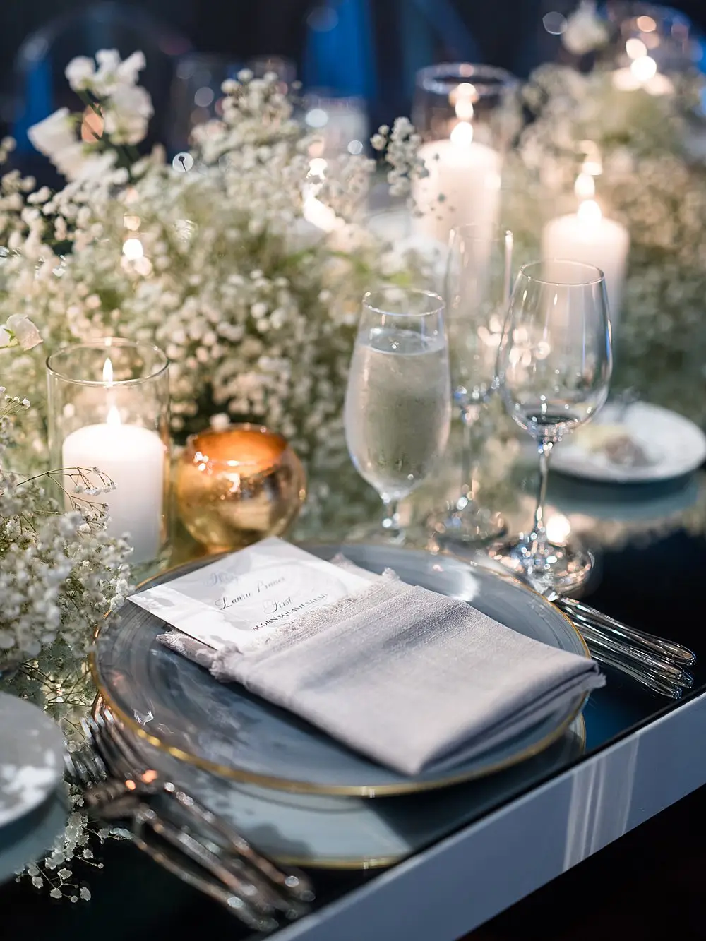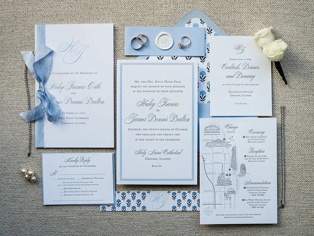 Guests were welcomed with signature cocktails and sunshine without a cloud in the sky… but when they entered Theater on the Lake for dinner and dancing, the most gorgeous floral clouds by HMR Designs floated effortlessly over the room drawing ooohhs and ahhhs from guests and setting the perfect stage for the most romantic dinner by Entertaining Company. Soft shades of blue and textural white linen and tons of candlelight completed the look of the room. The pattern was carried over from our save-the-date and invitations by Steracle Press to add personal touches to the design. The bride even designed her own monogram crest that was used from the save the date to the welcome amenities for out-of-town guests and the cocktail napkins at the reception.