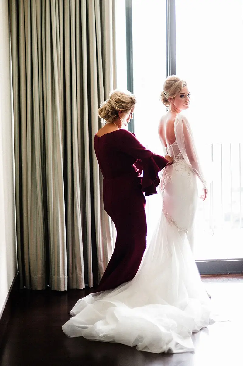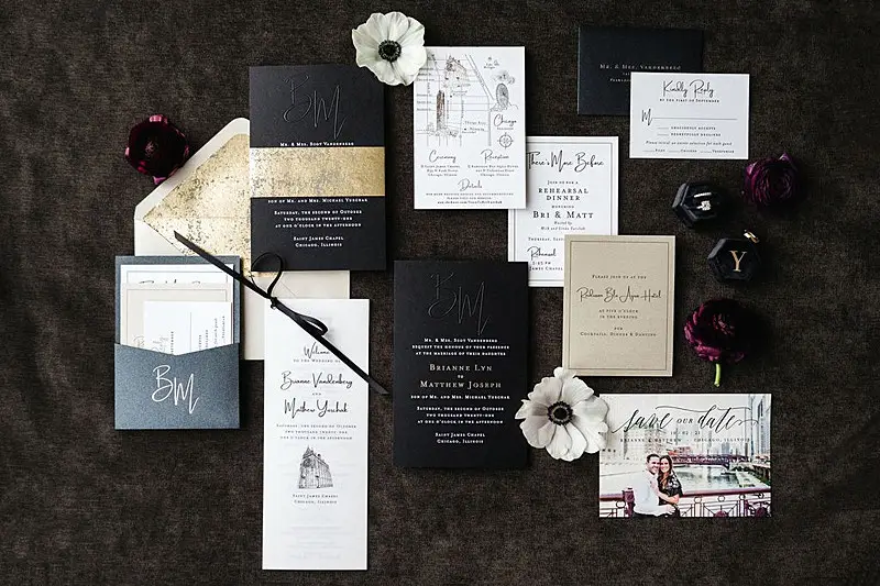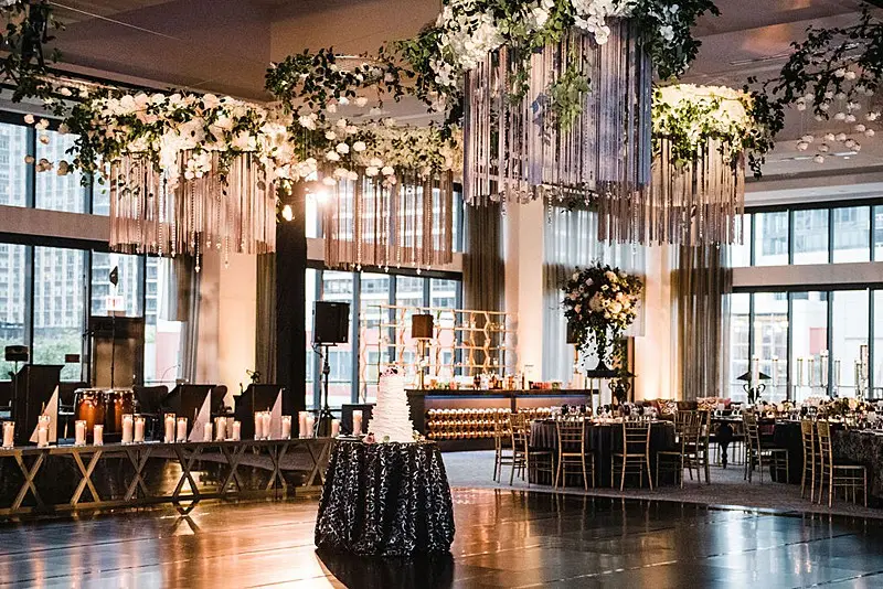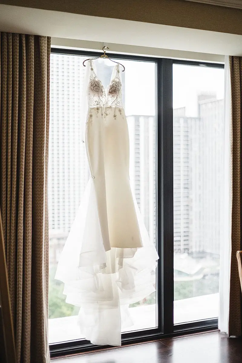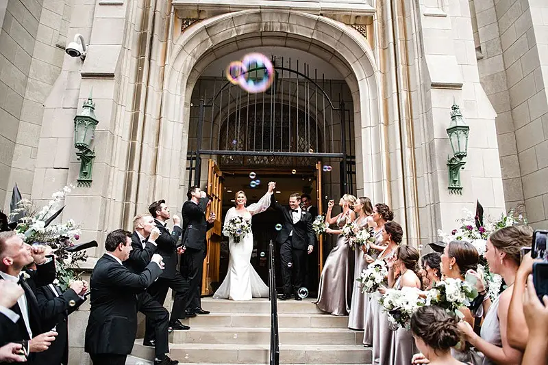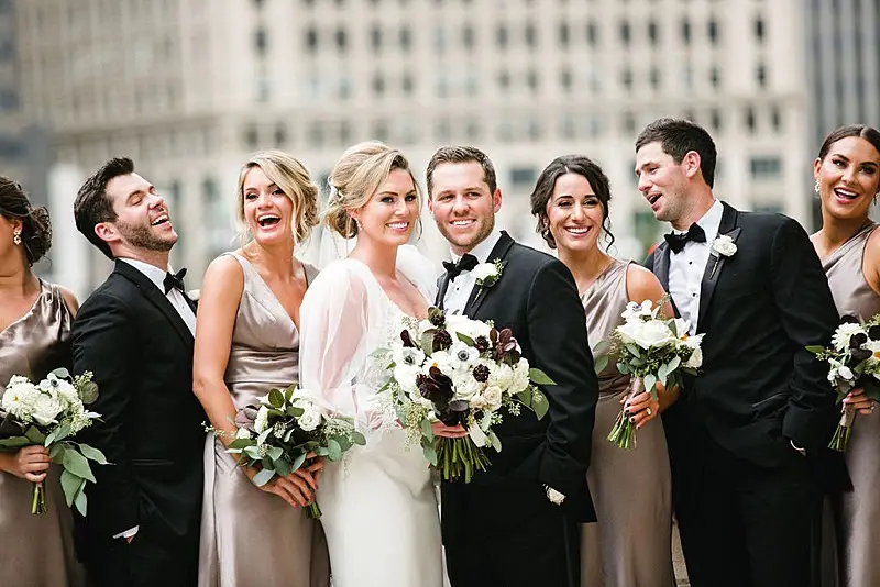 The day started as Bri and her bridesmaids were primped and pampered by the team of Nicole Marie Salon in the Royal Suite at the Radisson Blu Aqua Hotel, where the reception would eventually take place. Once dolled up, Bri put on her jaw-dropping gown with detachable sleeves by Leah Da Gloria purchased from Dimitras Bridal, and her bridesmaids were dripping in quartz satin by Jenny Yoo purchased from Bella Bridesmaids. Matt and the men were just as timeless, dressed to perfection by Emanuele Tuxedo in black tie.