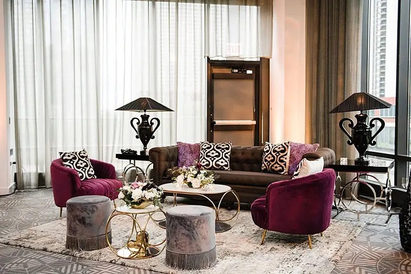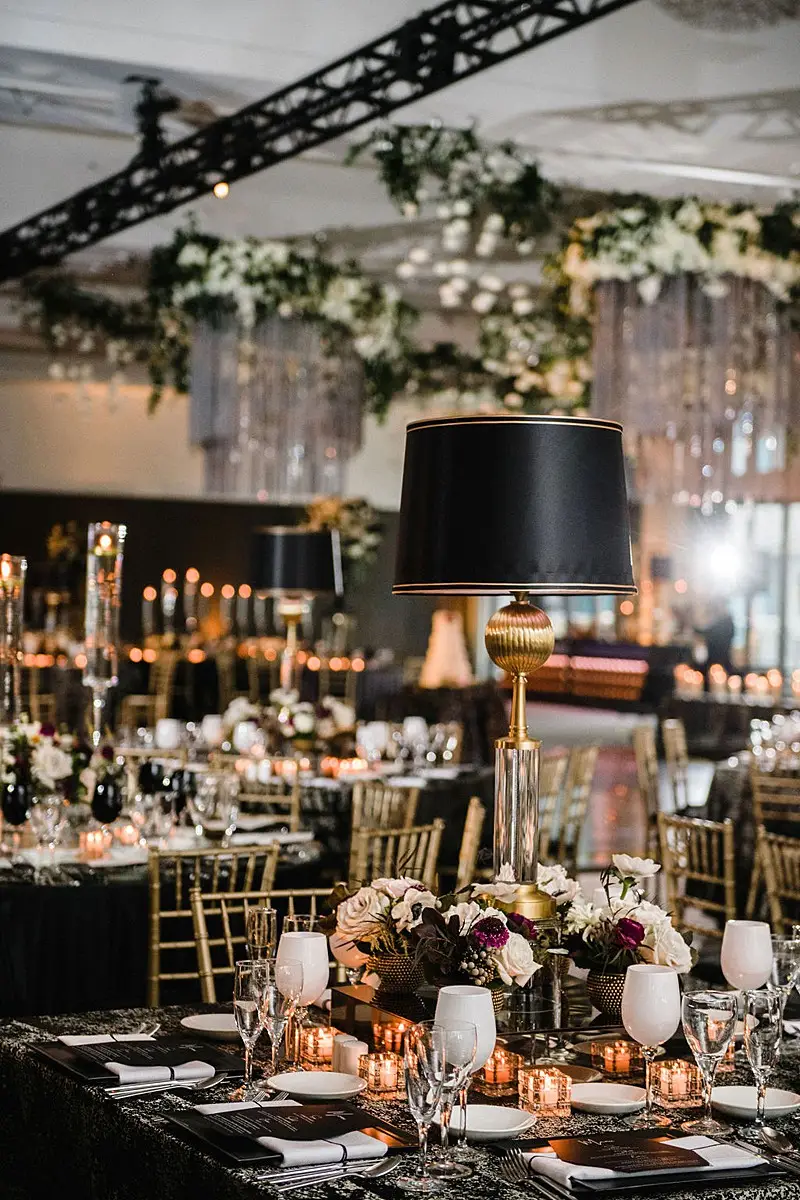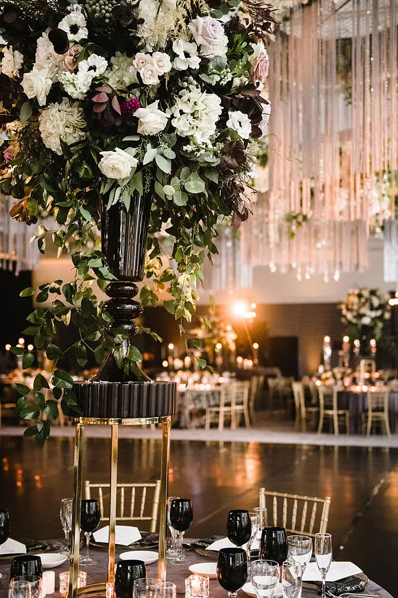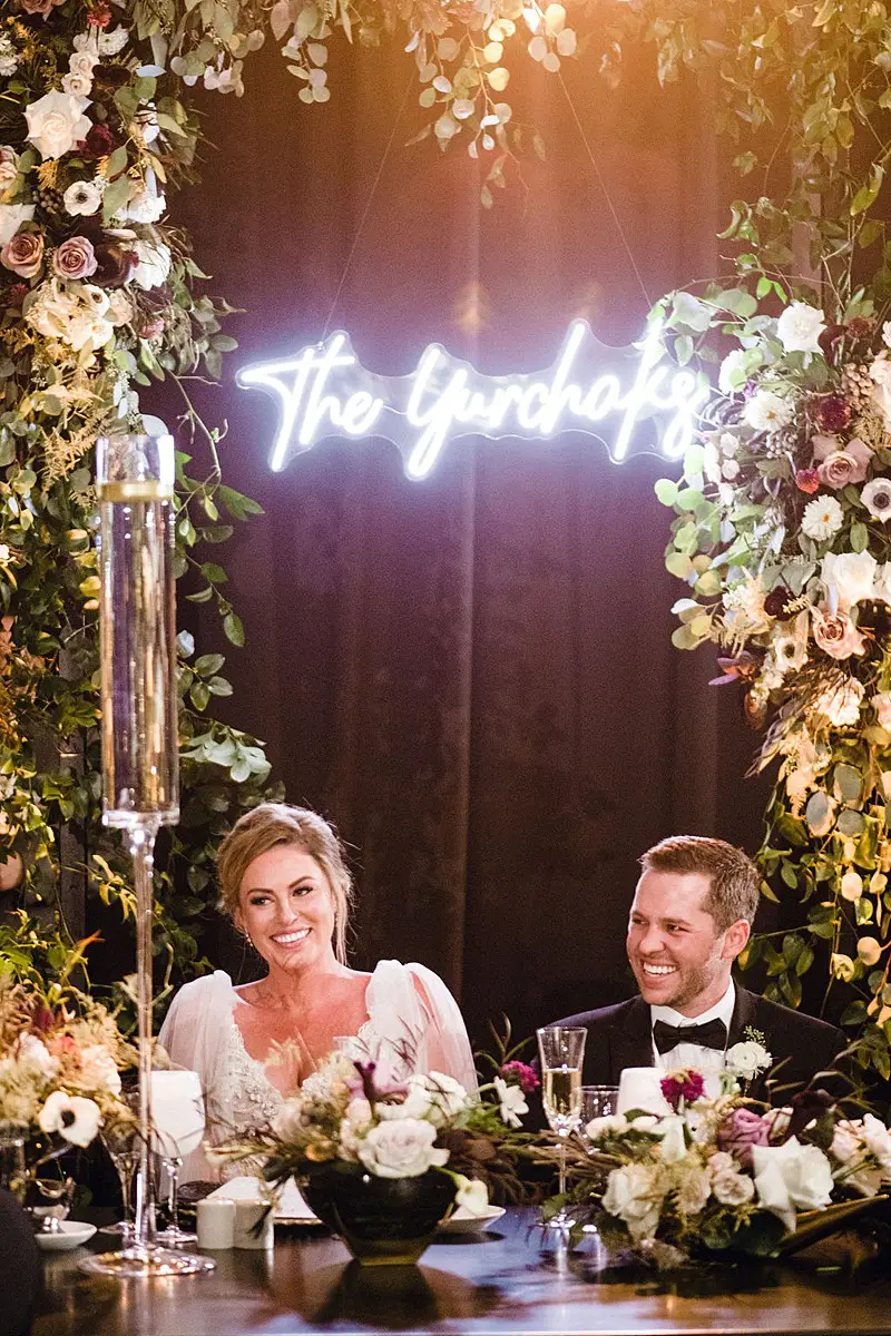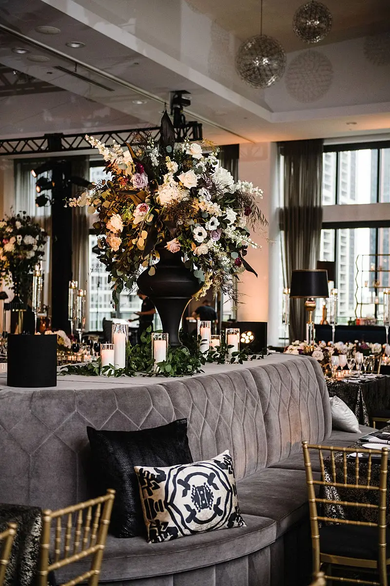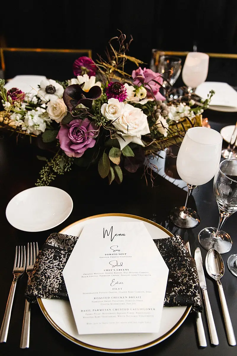 The dinner space was really where we wowed and brought our moody, fall, vintage, vision to life! The floral, lighting, and décor by Kehoe design was something only dreams are made of. White, blacks, golds, and plum tones accented by subtle touches of foliage danced throughout the room along with unique residential touches like lamps, pillows, and knick-knacks. My absolute favorite detail of the evening was the 2 large, oval banquets that served as seating for the 4 tables that surrounded them. Tabletop décor was not forgotten – the perfect hues of linen were brought to life by BBJ linen, chargers and glassware from Hall’s Rentals, mismatched chairs from Nuage Designs, and alternating black and white menus from Steracle Press were the perfect touch to keep the design interesting.