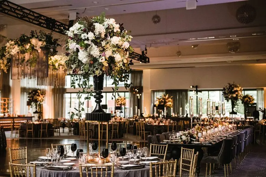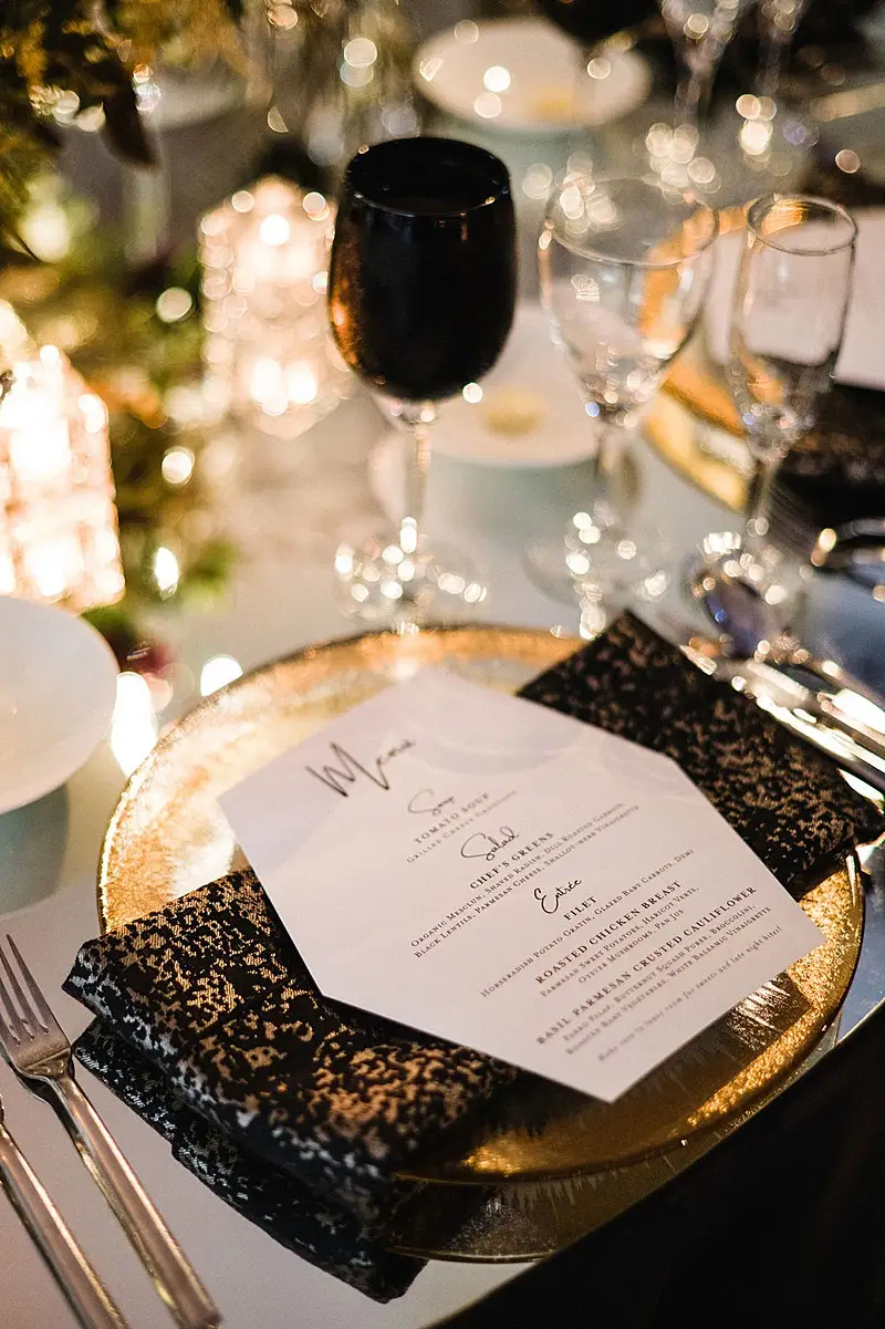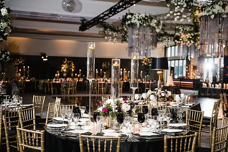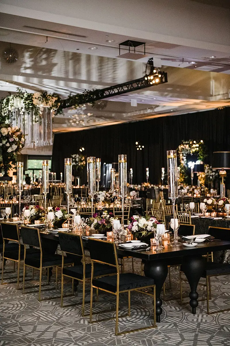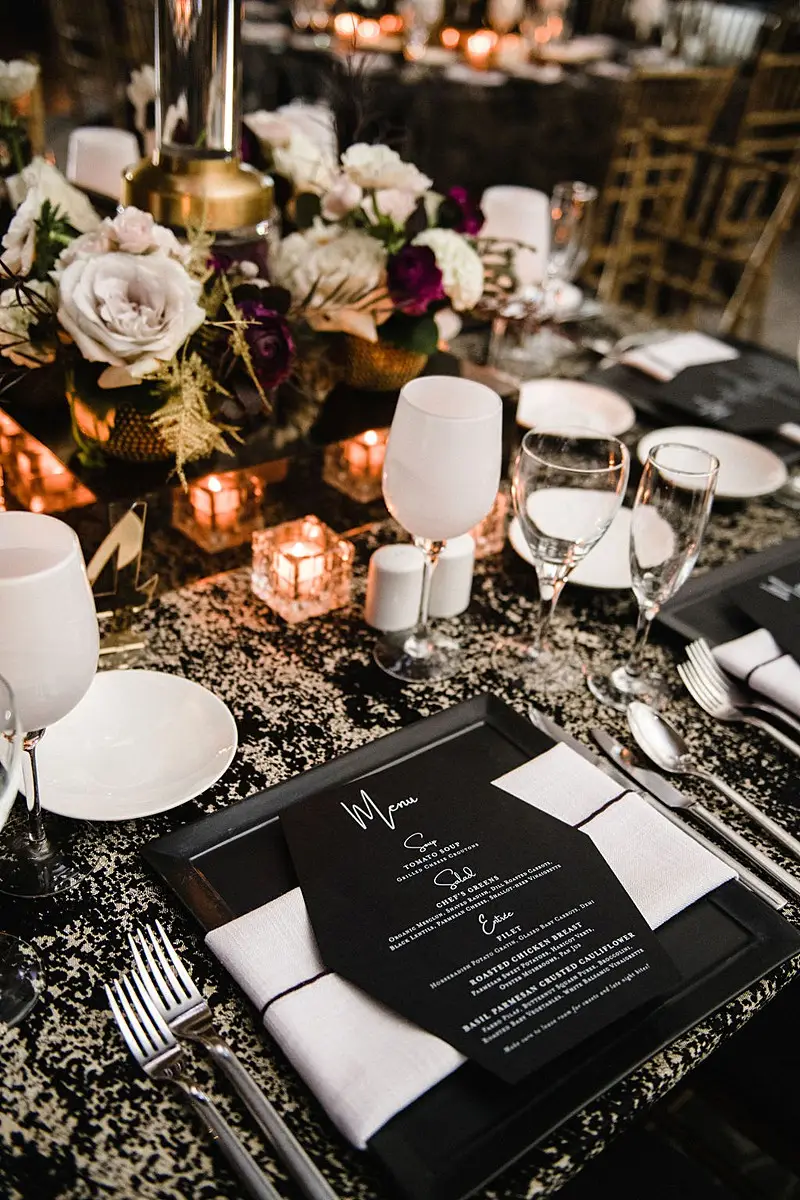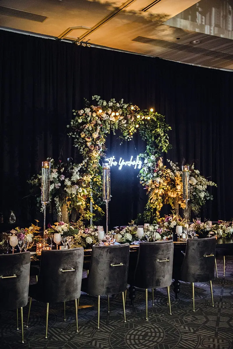 The dinner space was really where we wowed and brought our moody, fall, vintage, vision to life! The floral, lighting, and décor by Kehoe design was something only dreams are made of. White, blacks, golds, and plum tones accented by subtle touches of foliage danced throughout the room along with unique residential touches like lamps, pillows, and knick-knacks. My absolute favorite detail of the evening was the 2 large, oval banquets that served as seating for the 4 tables that surrounded them. Tabletop décor was not forgotten – the perfect hues of linen were brought to life by BBJ linen, chargers and glassware from Hall’s Rentals, mismatched chairs from Nuage Designs, and alternating black and white menus from Steracle Press were the perfect touch to keep the design interesting.
