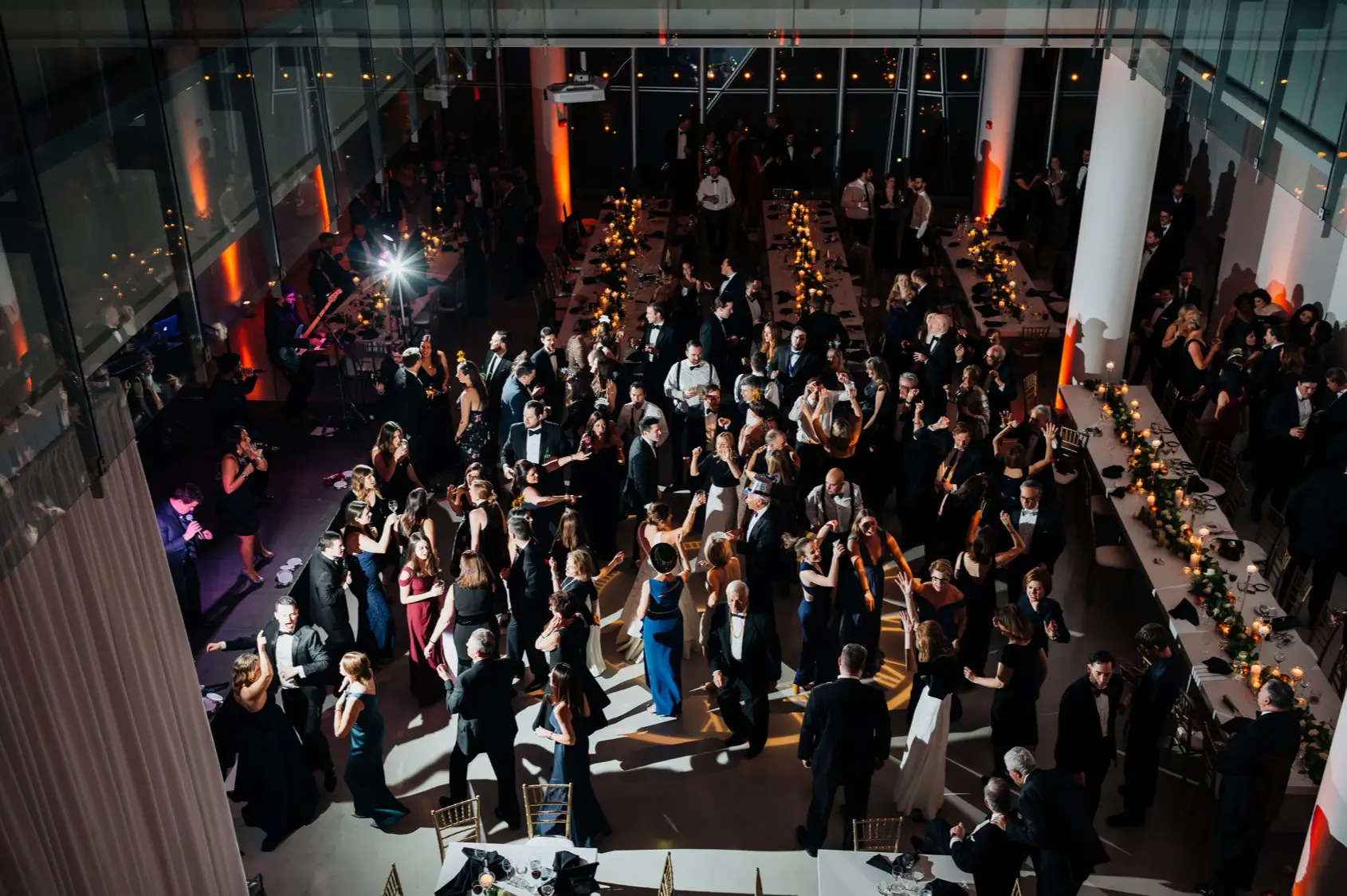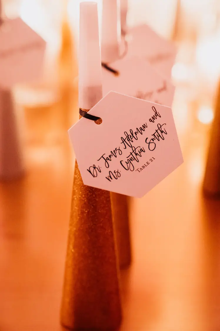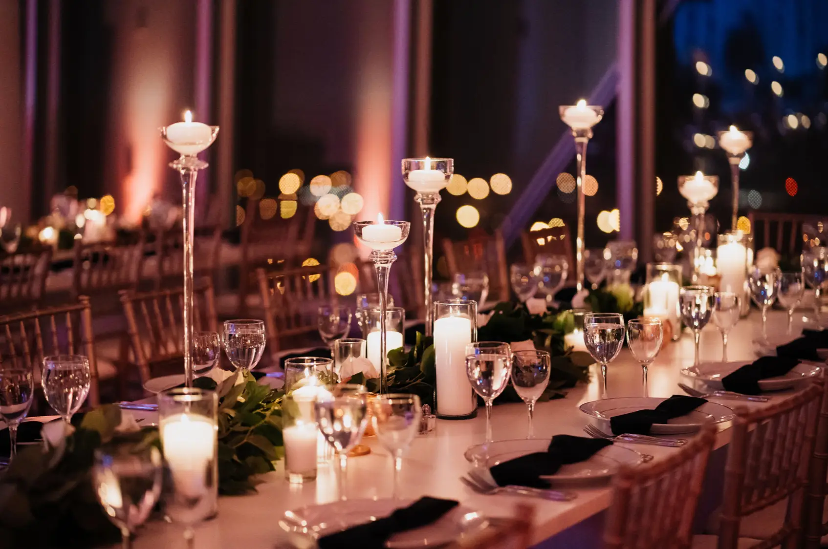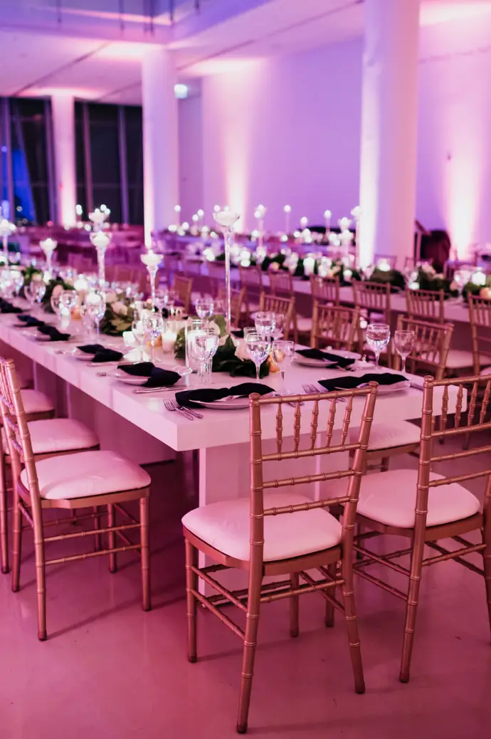 When it came time for design, Mara came armed with inspiration from Instagram and Pinterest. The goal was to create something a little more visually interesting than your standard round tables covered in linen. Based on Mara’s inspiration photos, I knew HMR would be a perfect match for her style. Mara and Pat were particularly inspired by a design that includes white rectangular tables that created a “zig-zag”or “snake” pattern through the reception space. We played off of this to fit within Venue Six10 and it created a wonderful dinner party vibe with guests gathered around long feasting tables. The tables were adorned with a rich green garland, lots of candlelight in various heights, and chargers with “bow tie” napkins for a nod to the traditional black tie attire for New Year’s Eve. From the atrium above, it looked like the candles were floating and just had the most magical vibe. To give another nod to the holiday, Frost projected a large clock on the dance floor about to strike midnight. This was definitely one of the most popular design aspect of the night!