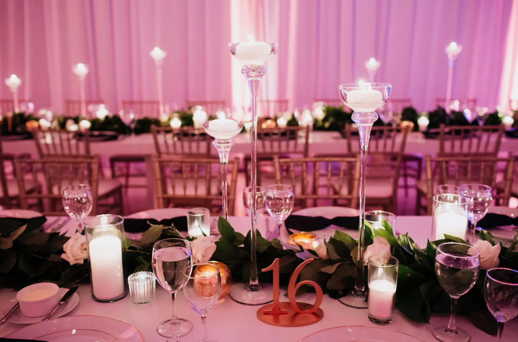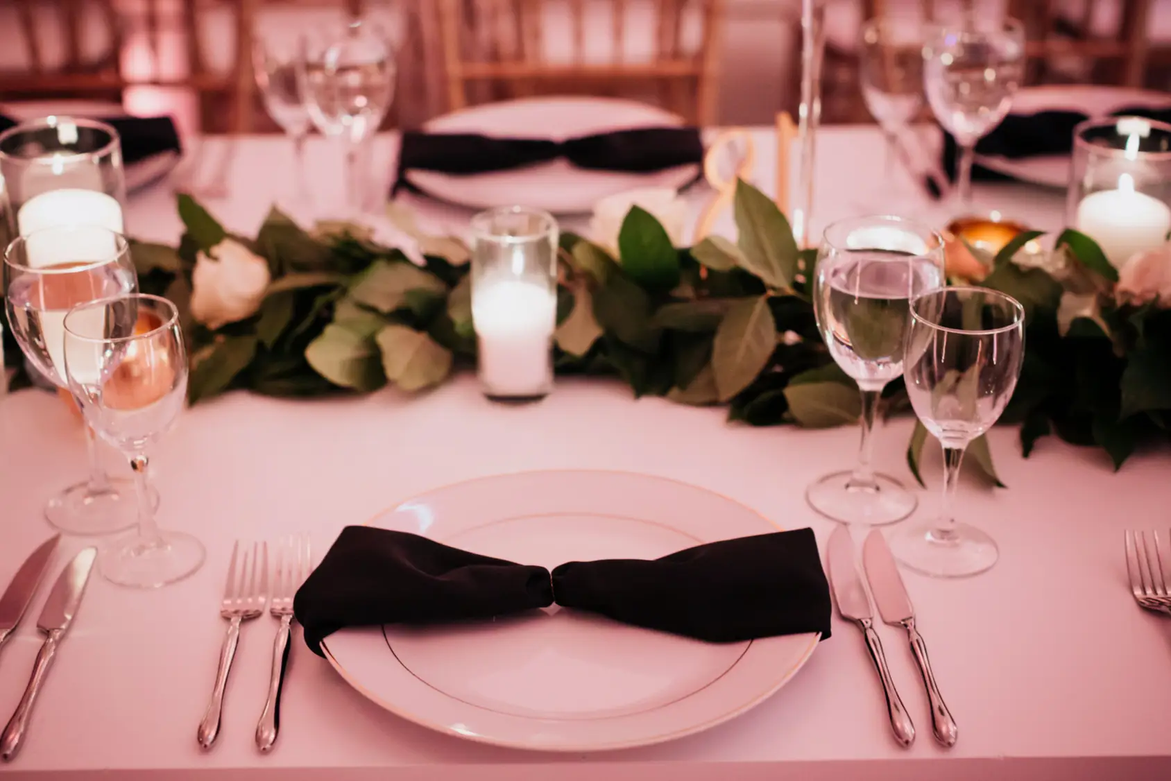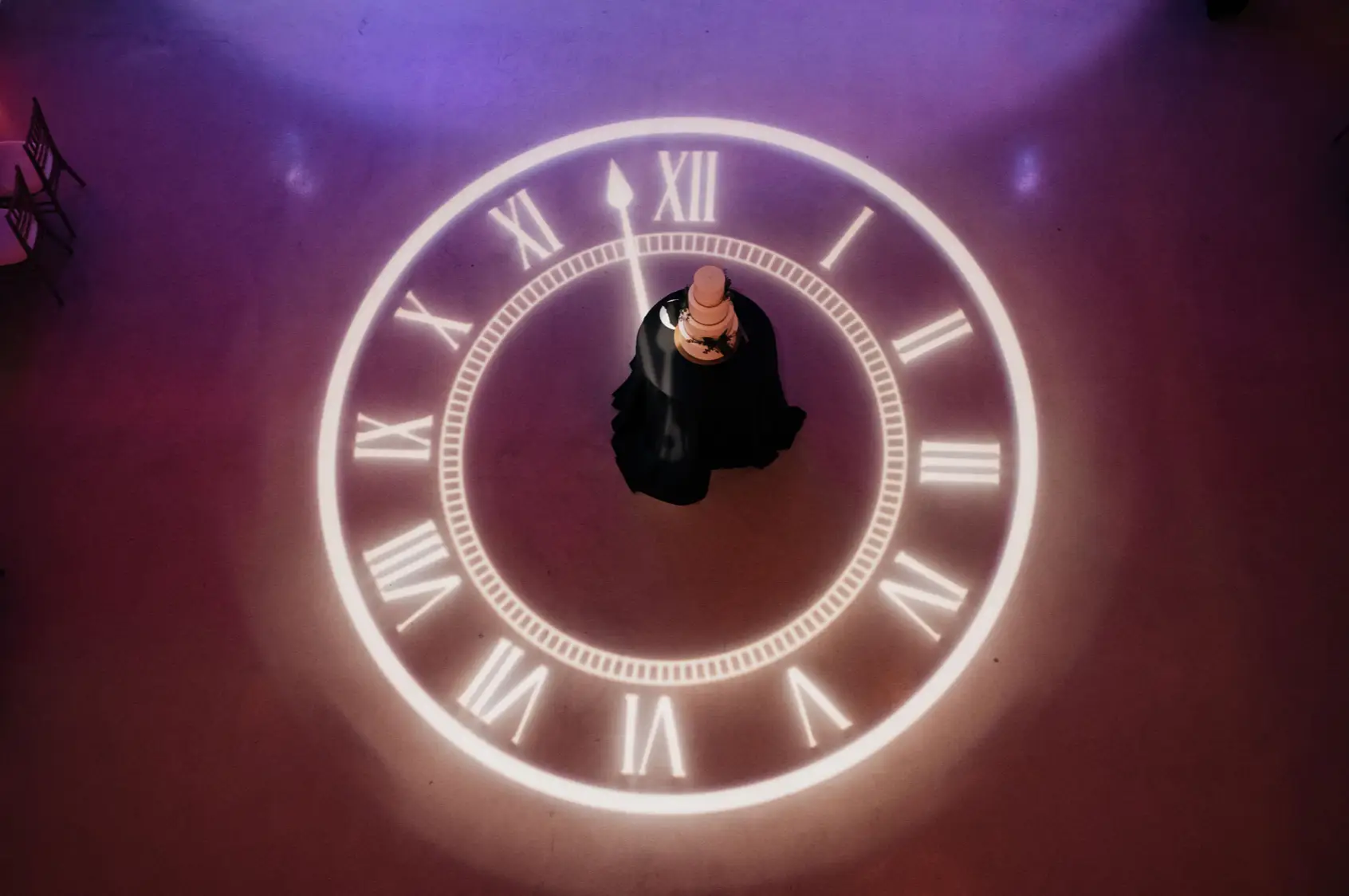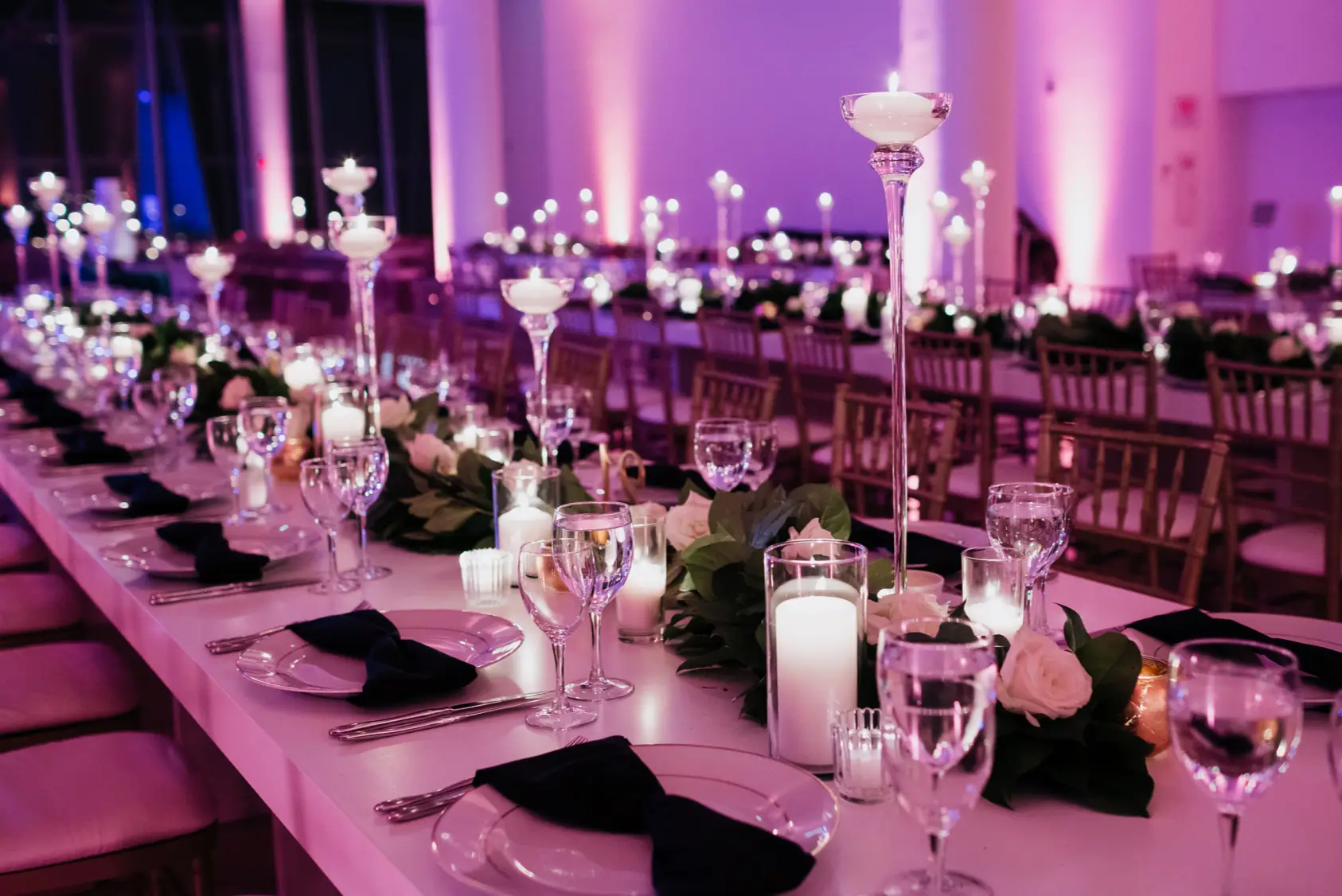 When it came time for design, Mara came armed with inspiration from Instagram and Pinterest. The goal was to create something a little more visually interesting than your standard round tables covered in linen. Based on Mara’s inspiration photos, I knew HMR would be a perfect match for her style. Mara and Pat were particularly inspired by a design that includes white rectangular tables that created a “zig-zag”or “snake” pattern through the reception space. We played off of this to fit within Venue Six10 and it created a wonderful dinner party vibe with guests gathered around long feasting tables. The tables were adorned with a rich green garland, lots of candlelight in various heights, and chargers with “bow tie” napkins for a nod to the traditional black tie attire for New Year’s Eve. From the atrium above, it looked like the candles were floating and just had the most magical vibe. To give another nod to the holiday, Frost projected a large clock on the dance floor about to strike midnight. This was definitely one of the most popular design aspect of the night!