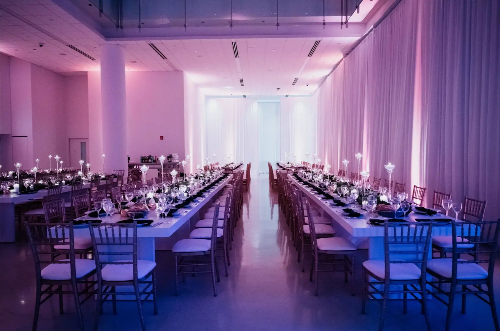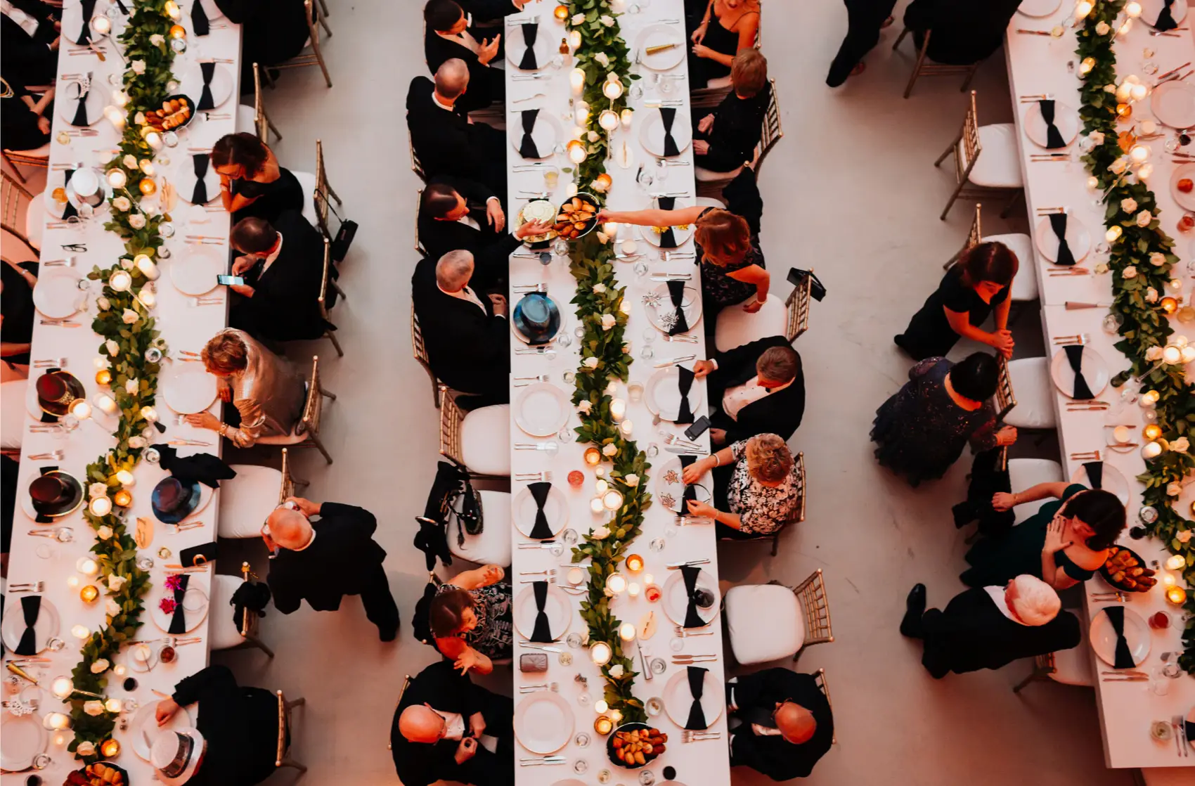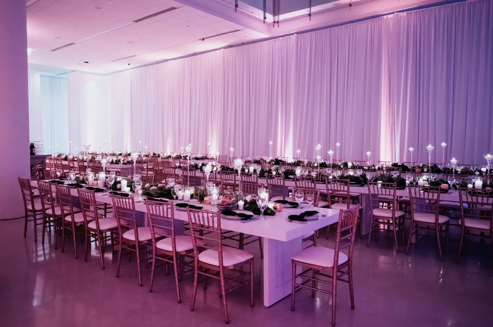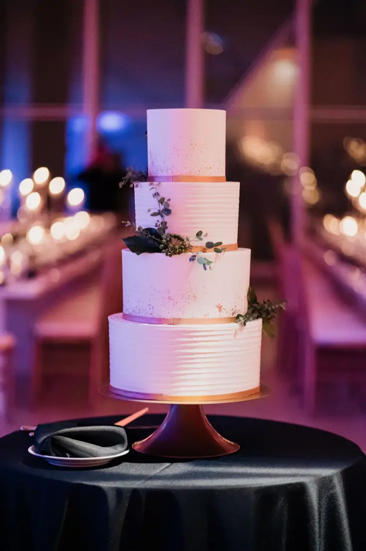 When it came time for design, Mara came armed with inspiration from Instagram and Pinterest. The goal was to create something a little more visually interesting than your standard round tables covered in linen. Based on Mara’s inspiration photos, I knew HMR would be a perfect match for her style. Mara and Pat were particularly inspired by a design that includes white rectangular tables that created a “zig-zag”or “snake” pattern through the reception space. We played off of this to fit within Venue Six10 and it created a wonderful dinner party vibe with guests gathered around long feasting tables. The tables were adorned with a rich green garland, lots of candlelight in various heights, and chargers with “bow tie” napkins for a nod to the traditional black tie attire for New Year’s Eve. From the atrium above, it looked like the candles were floating and just had the most magical vibe. To give another nod to the holiday, Frost projected a large clock on the dance floor about to strike midnight. This was definitely one of the most popular design aspect of the night!