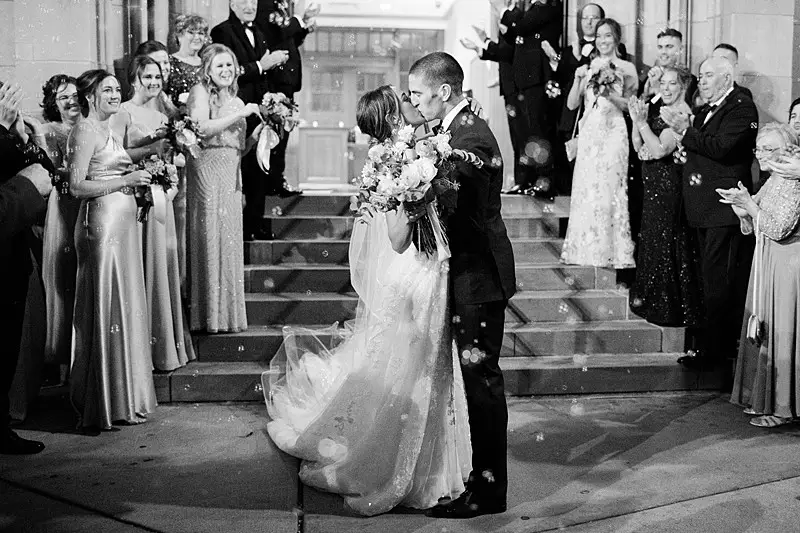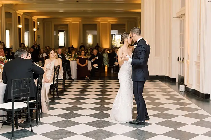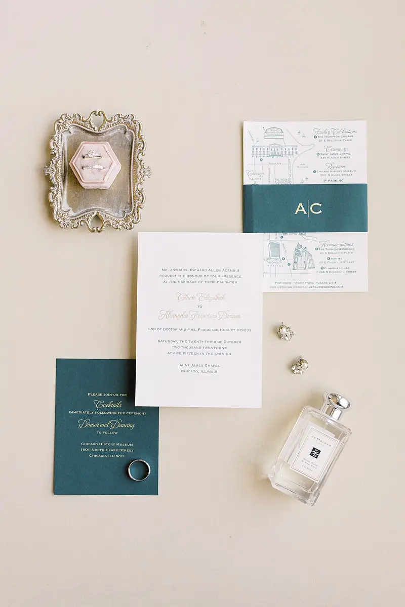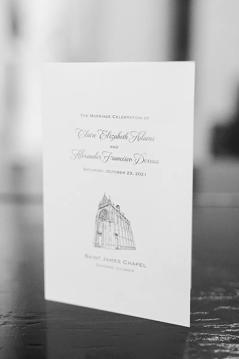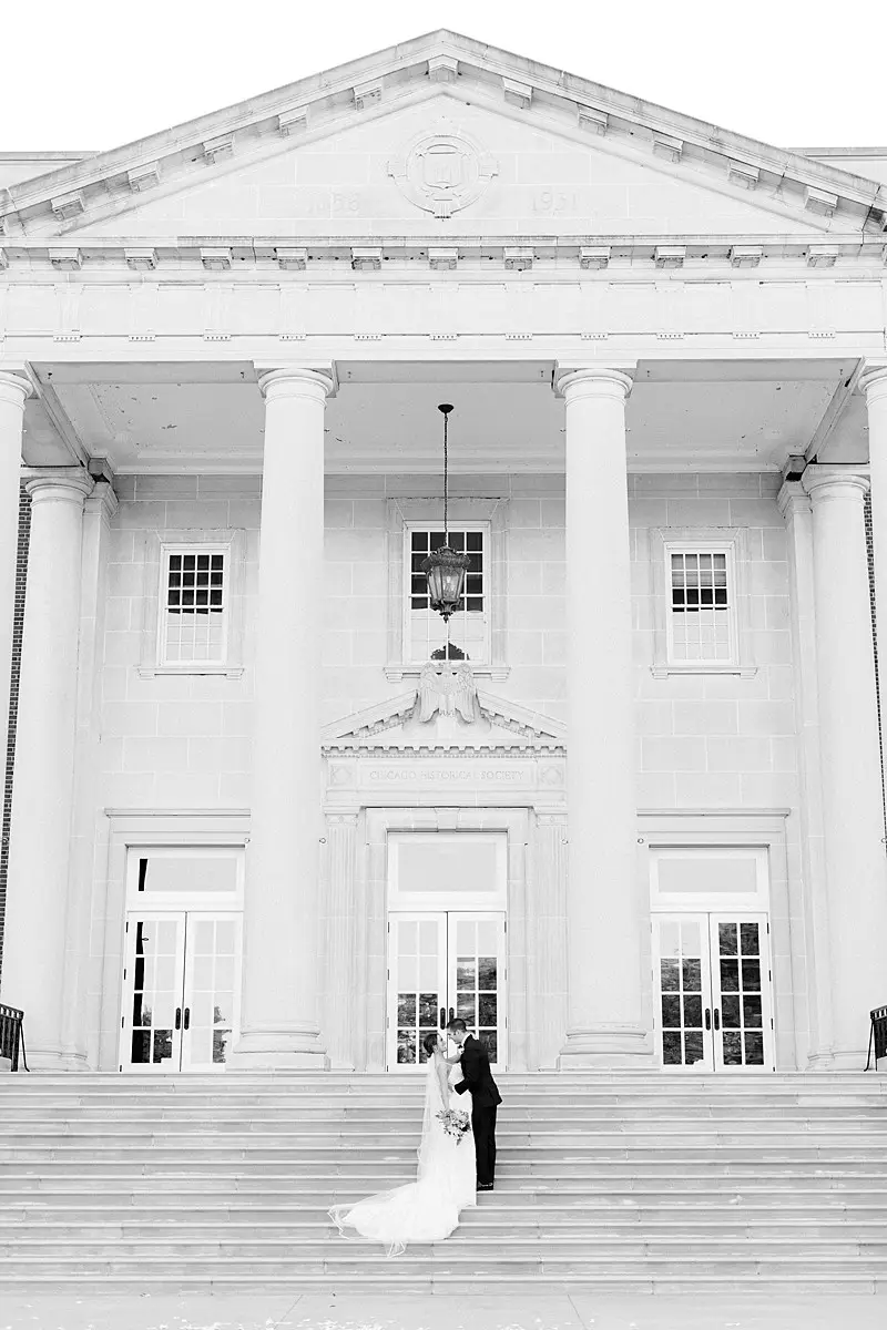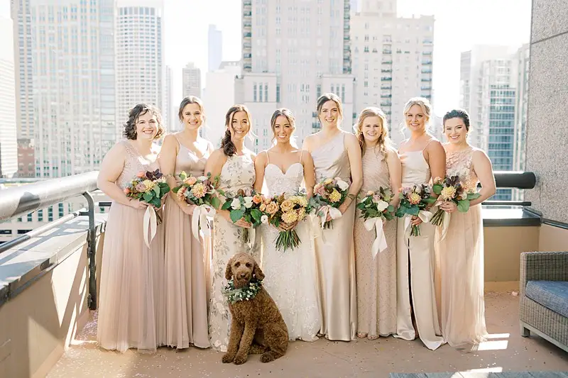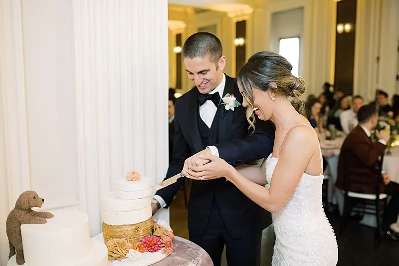 The happy couple exchanged vows in a traditional Catholic ceremony at St James Chapel, and then they headed to the Chicago History Museum for a formal seated meal followed by dancing with our favorite: DJ Chris of Elegant Sound & Lighting Chicago. The meal, provided by Limelight Catering, was as gorgeous as the décor and the happy couple finished the meal with not 1, but 2 non-traditional cakes. The first: a “cheese” cake (did I mention we bonded over our love of all cheese?!). The second: The most adorable groom’s cake with their beloved dog Alba perfectly perched on the side overseeing the activities of the evening.