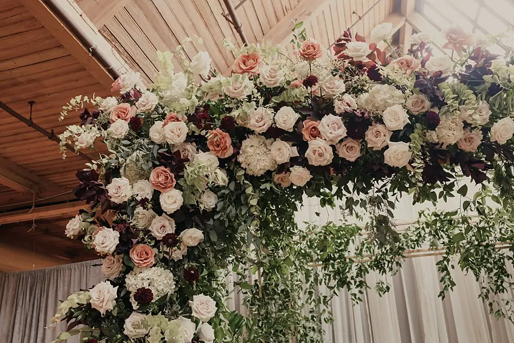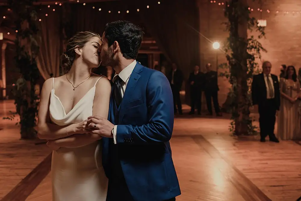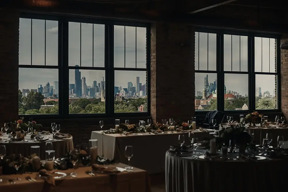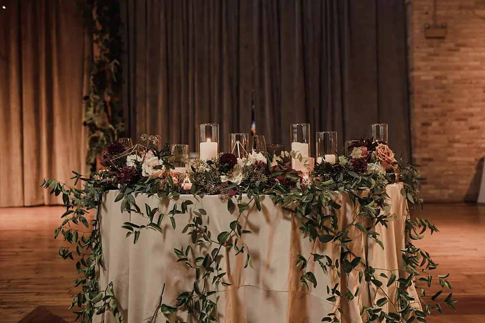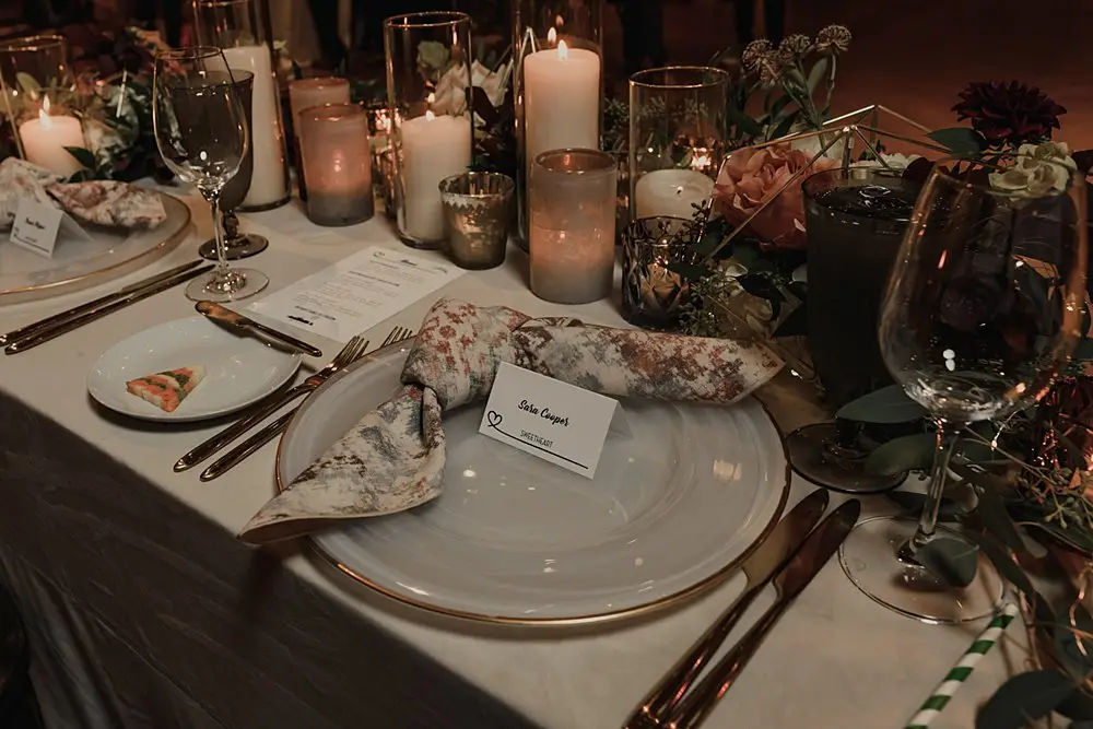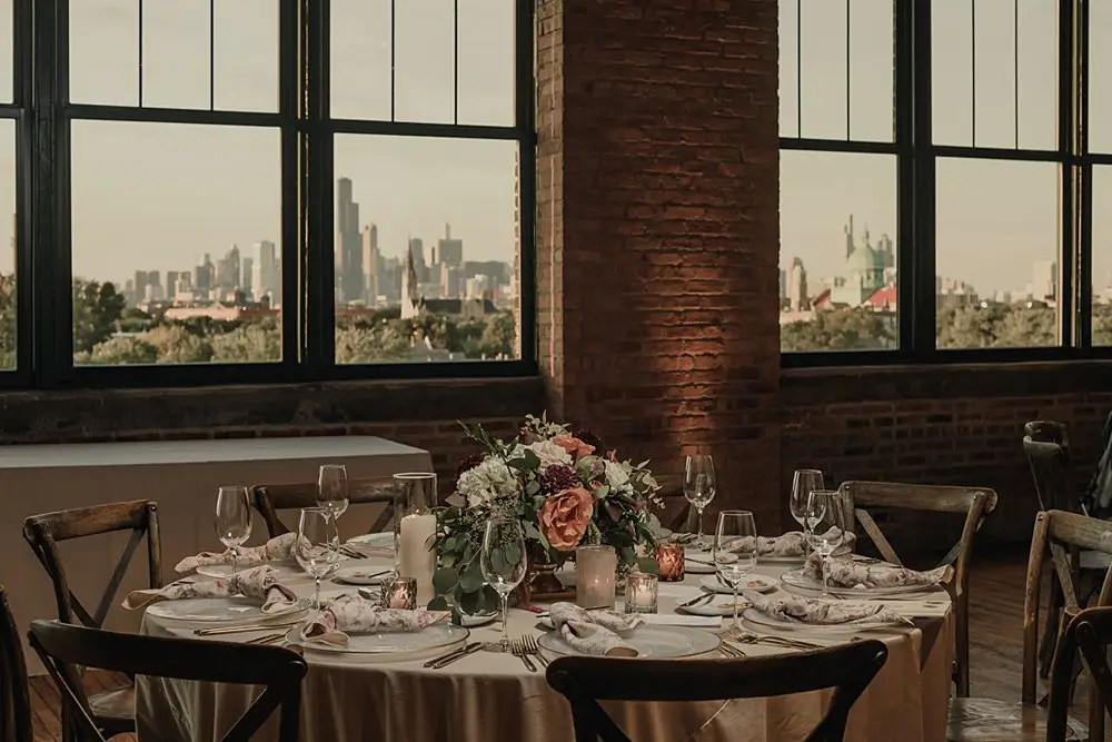 Revel Décor transformed Bridgeport Art Center’s Skyline Loft by bringing the outdoors in. Greenery and fall foliage adorned the rustic wooden beams lining the aisle for the ceremony. It felt fairytale-like as it led to the lush chuppah made up of neutral florals and greenery with pops of burgundy to add some dimension. The rentals were thoughtfully curated to create an eye-catching place setting with a beautiful milky glass charger with a gold rim, smokey gray goblet, patterned napkin, and brushed gold silverware. Café lights, another must have for the couple, added a beautiful glow down the center of the room and provided the perfect twinkle once the dance floor opened.