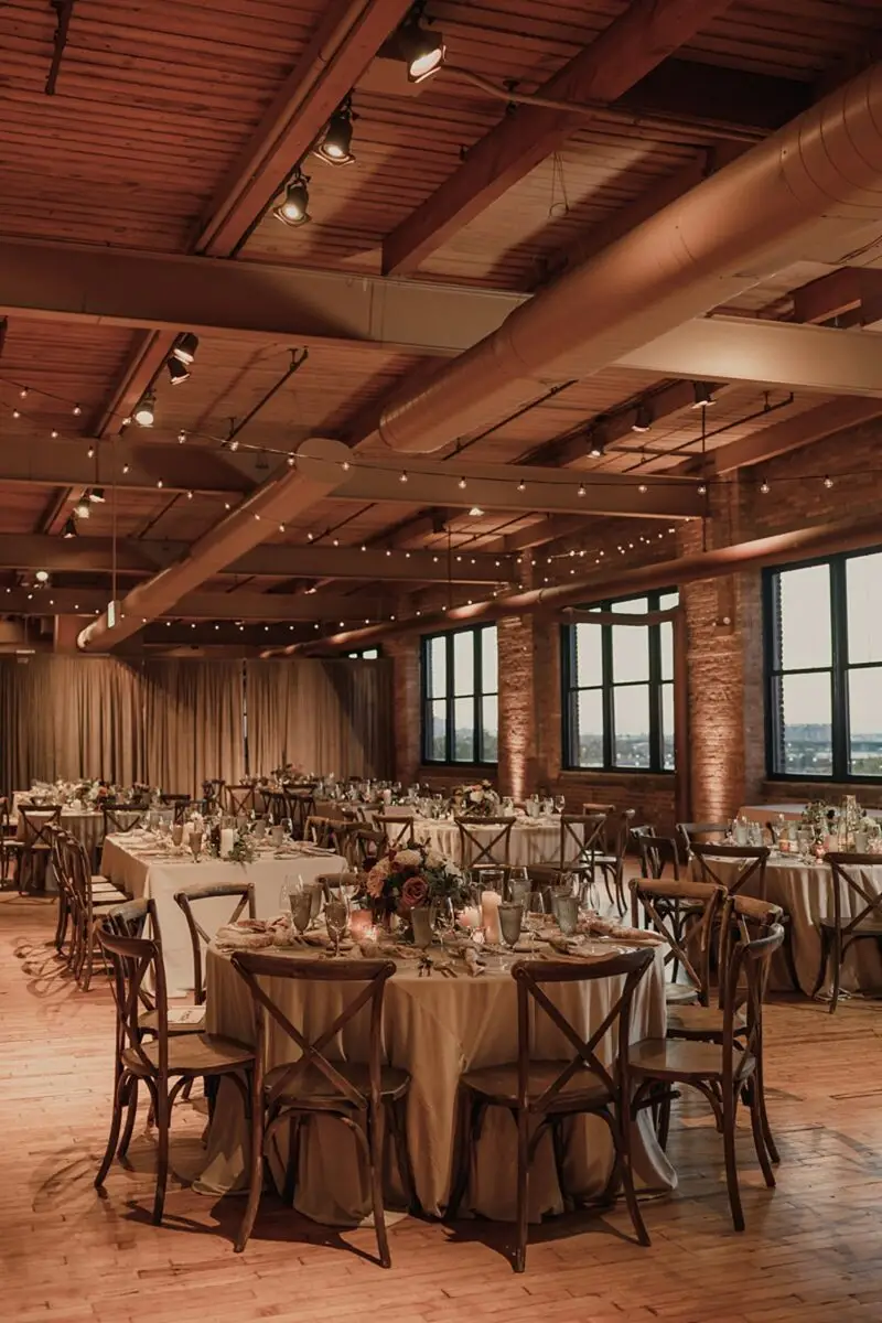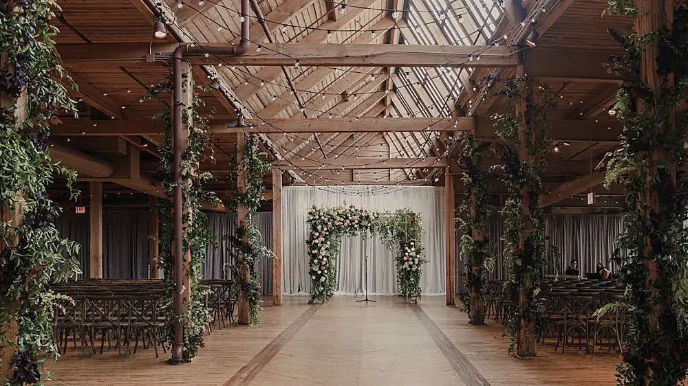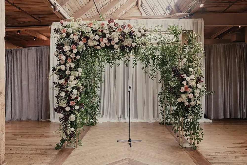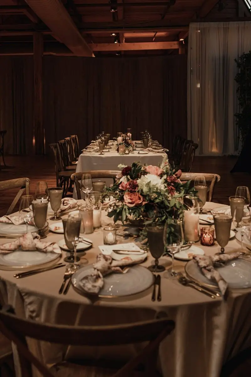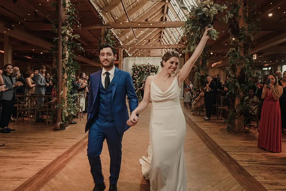 Revel Décor transformed Bridgeport Art Center’s Skyline Loft by bringing the outdoors in. Greenery and fall foliage adorned the rustic wooden beams lining the aisle for the ceremony. It felt fairytale-like as it led to the lush chuppah made up of neutral florals and greenery with pops of burgundy to add some dimension. The rentals were thoughtfully curated to create an eye-catching place setting with a beautiful milky glass charger with a gold rim, smokey gray goblet, patterned napkin, and brushed gold silverware. Café lights, another must have for the couple, added a beautiful glow down the center of the room and provided the perfect twinkle once the dance floor opened.