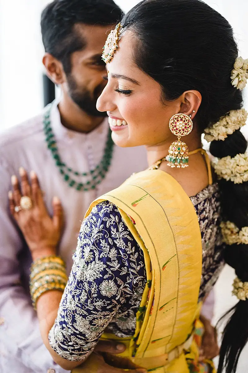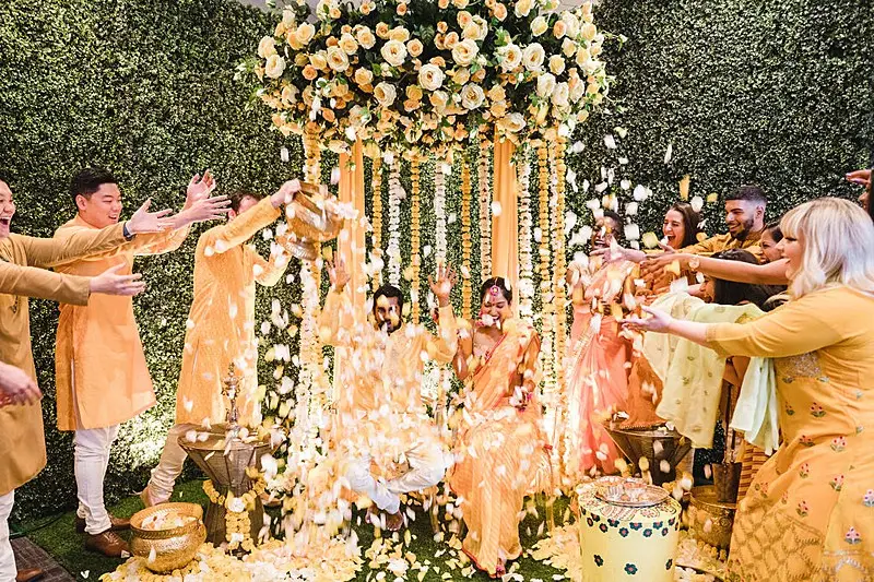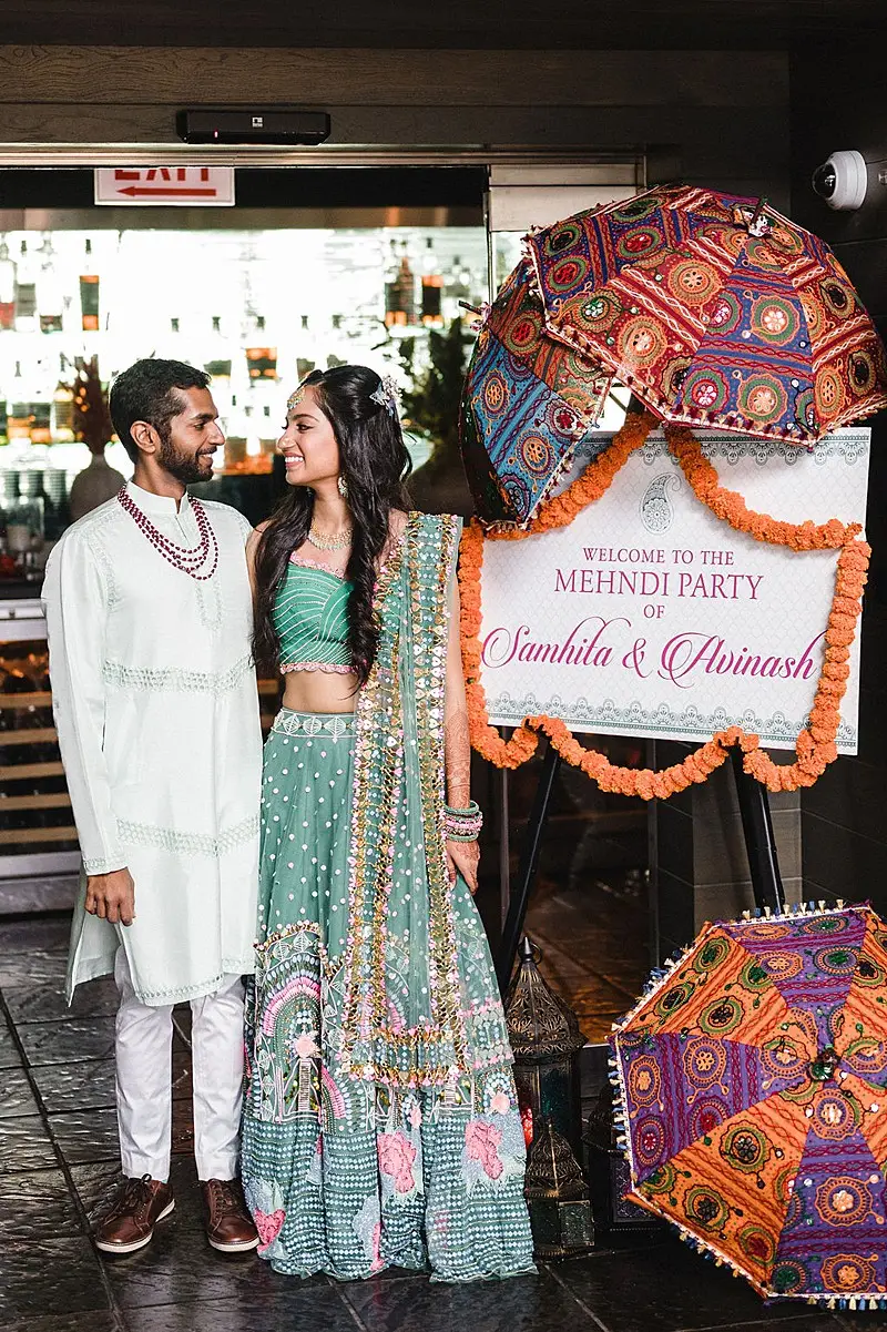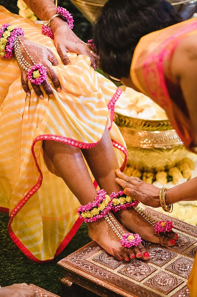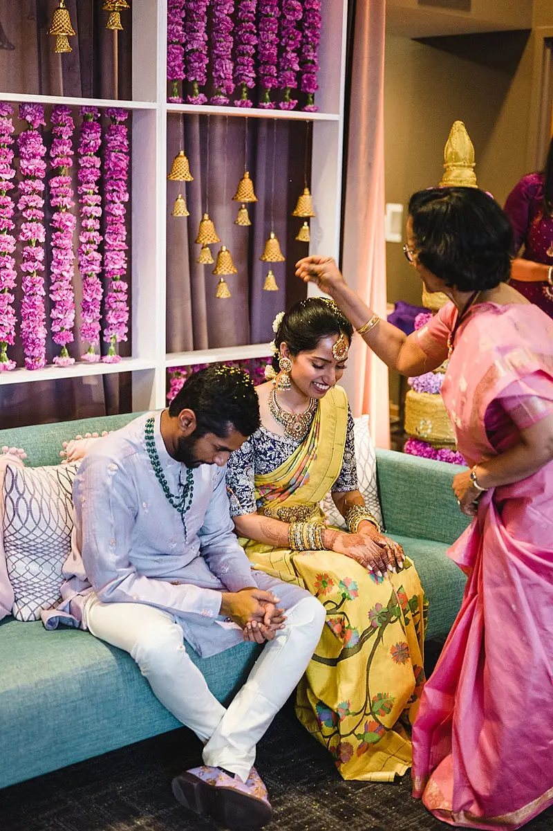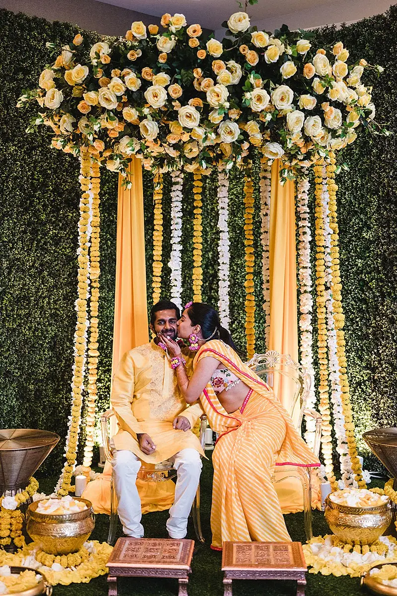 Samhita and Avi were planning a traditional, South Indian wedding, and with that comes a lot of events, which brings along a lot of places to design and execute a colorful, thoughtful, regal experience. The first of four events was the Haldi ceremony which took place in their condo building. For those who don’t know, a Haldi ceremony is where the closest friends and family members come together to rub turmeric paste on the bride and groom as they wish them blessings before their wedding.