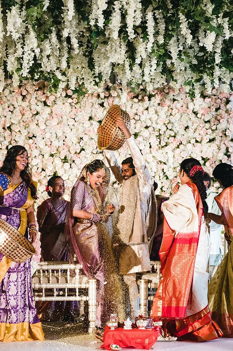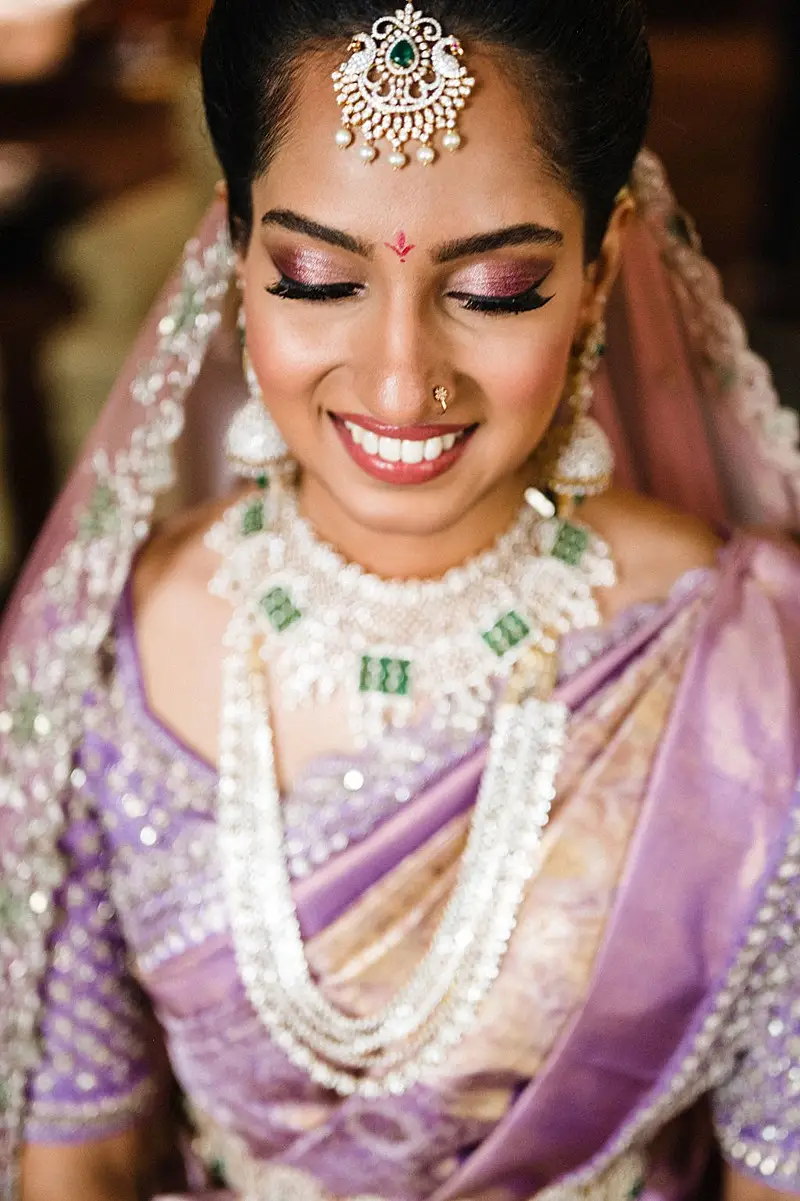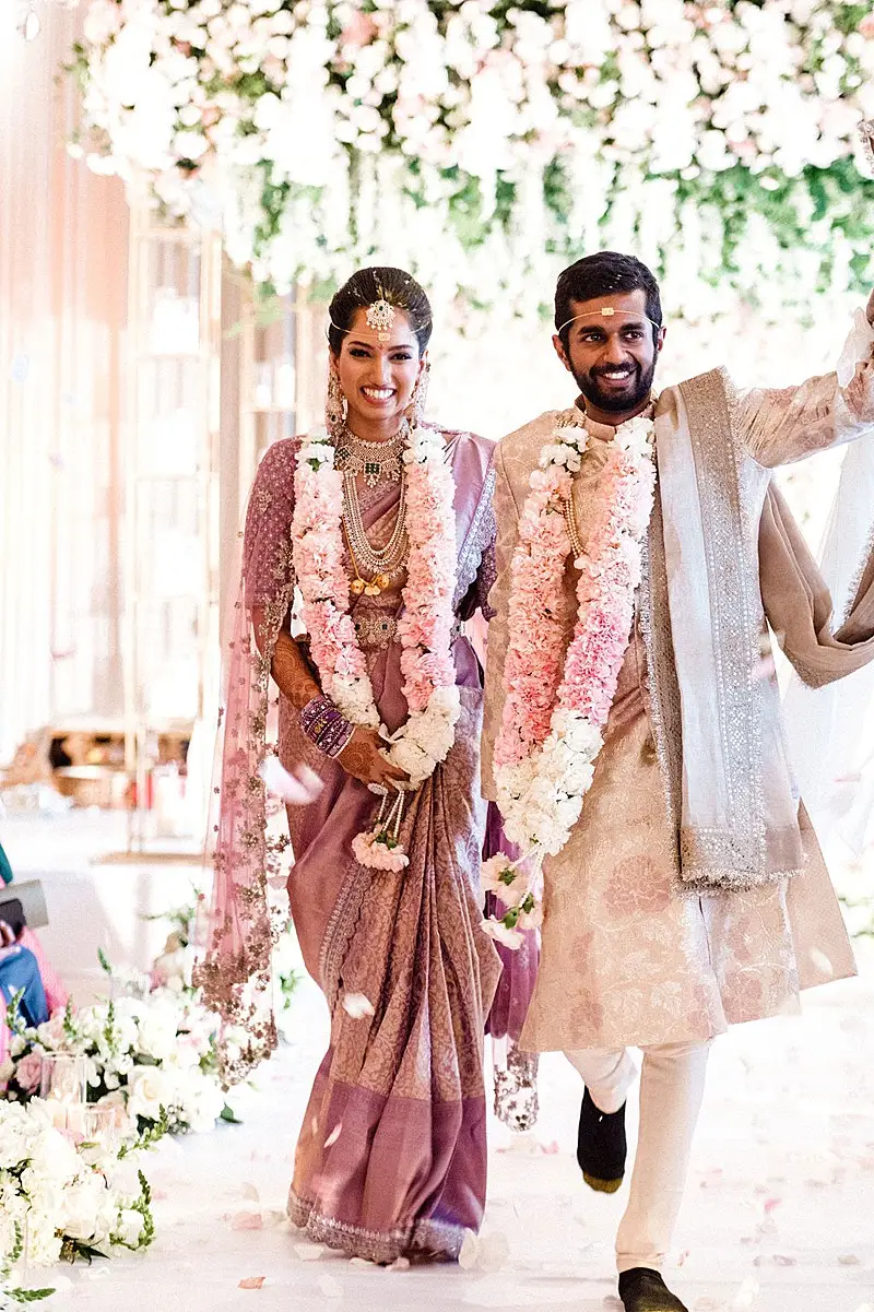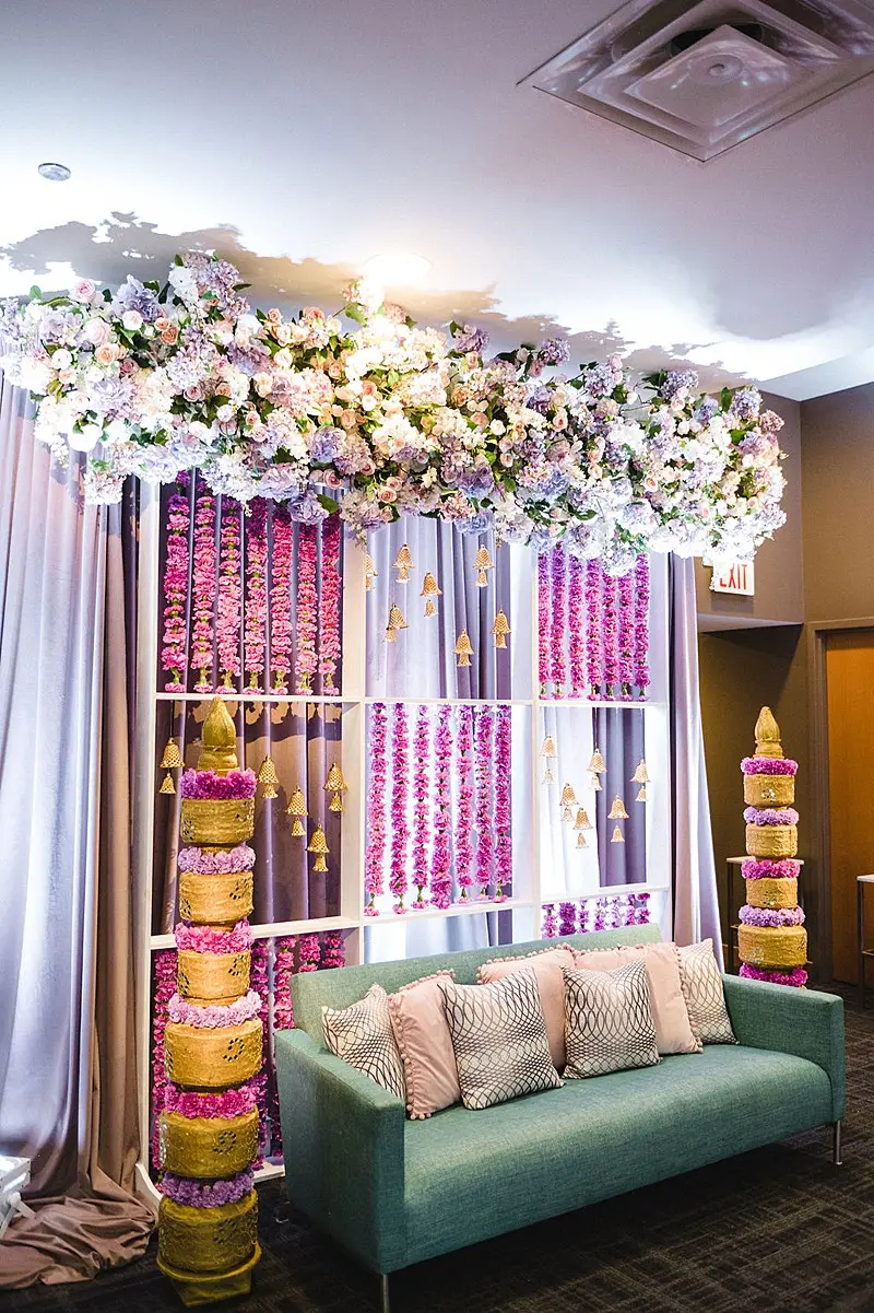 Following this Haldi ceremony, as Samhita had a hair and makeup change by the talented Kate Johnson of the Bridal Beauty Team, guests made their way into the next room for lunch and leisure. This room was artfully designed in a pallet of pink and lavender and displayed another stunning altar for the bride and groom to sit at again for an additional ceremony with blessings and gifts from their family and friends.