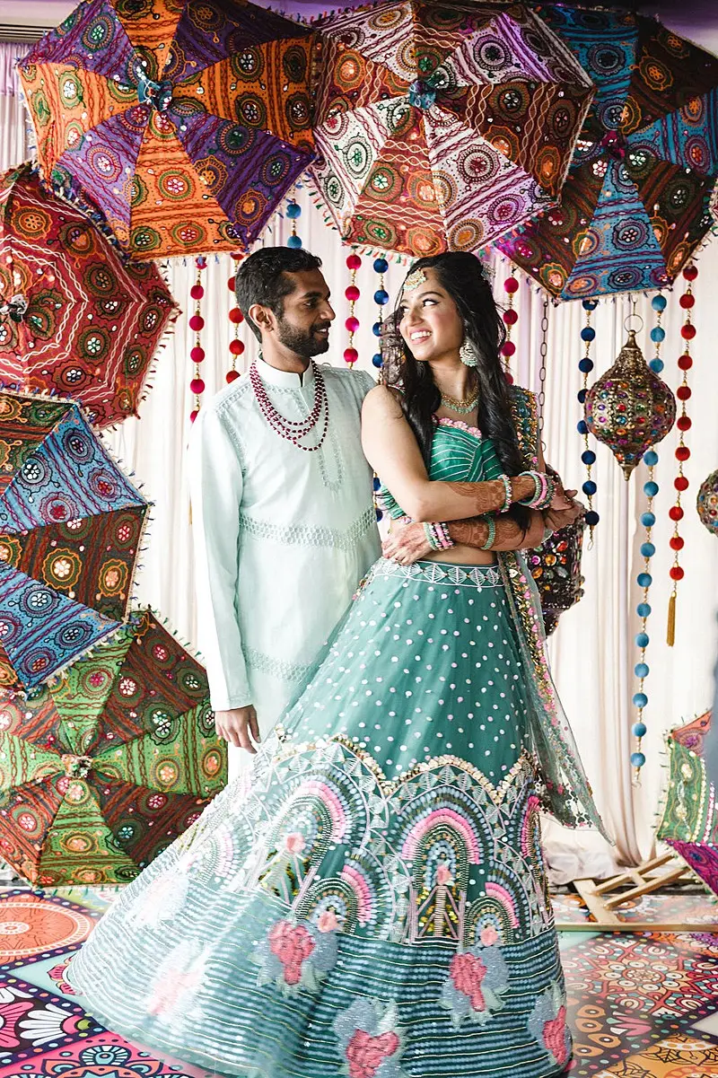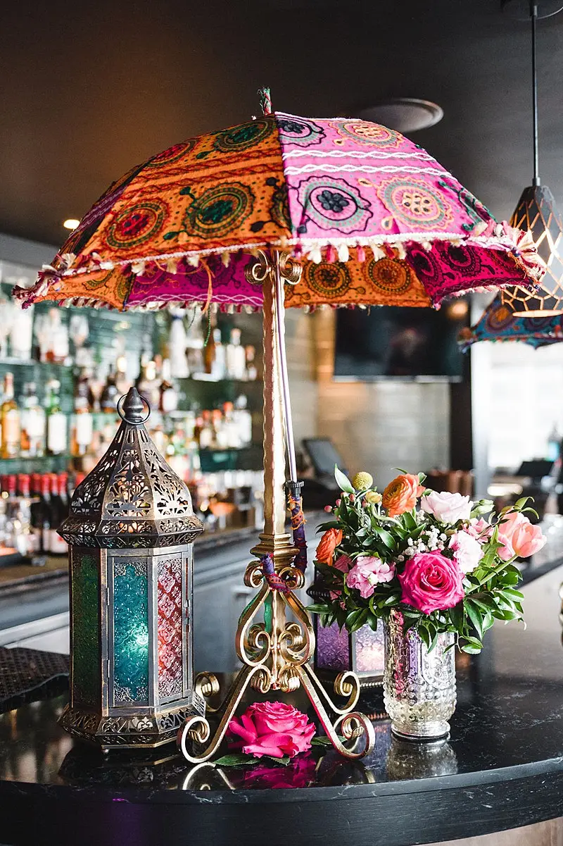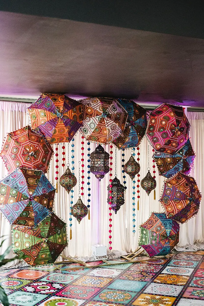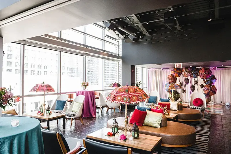 The next day featured our second event, the mehndi party which took place at the Roof on the Wit. The mehndi party featured bright, jeweled tone colors from the entire rainbow with main décor elements of a fun patterned dance floor and an elaborate dancefloor backdrop made of colorful umbrellas and Moroccan lanterns. At this party, Asian Fusion food was served alongside large-format cocktails, great dance music, and Unnati Shah performing her artful skill of henna/mehndi for the ladies. The bride even got up on the dance floor with her bridesmaids to perform a killer dance routine for their guests, and she looked jaw-dropping thanks to Namrata Soni, her hair and makeup artist who flew in from Mumbai to glam our bride for the rest of the weekend.
