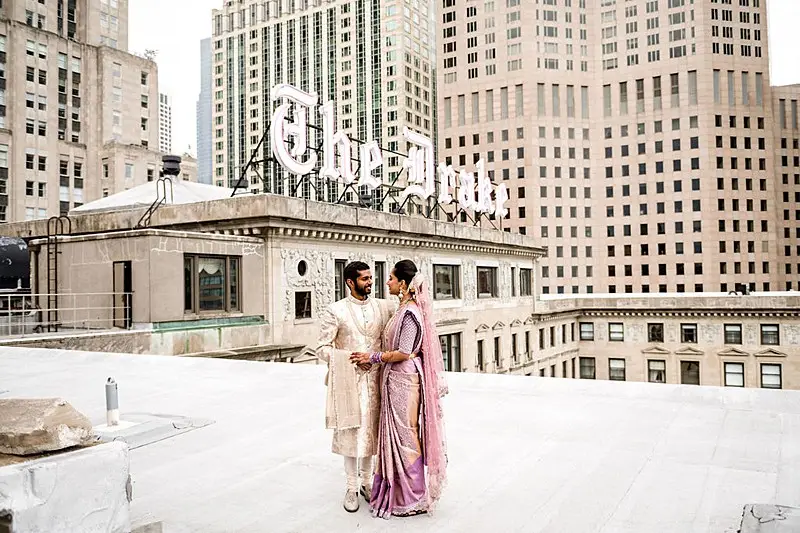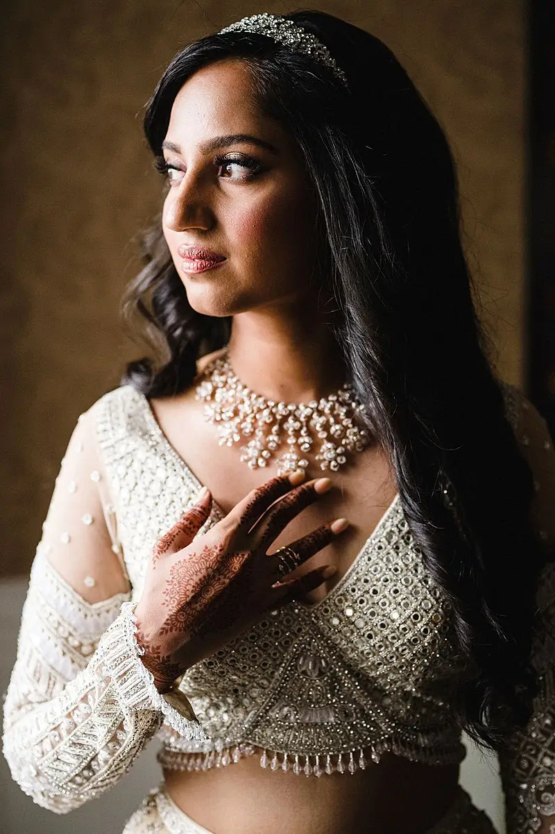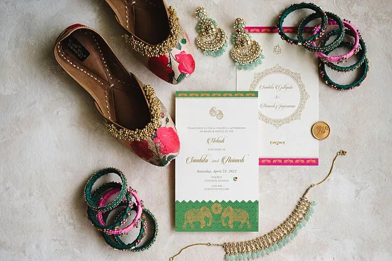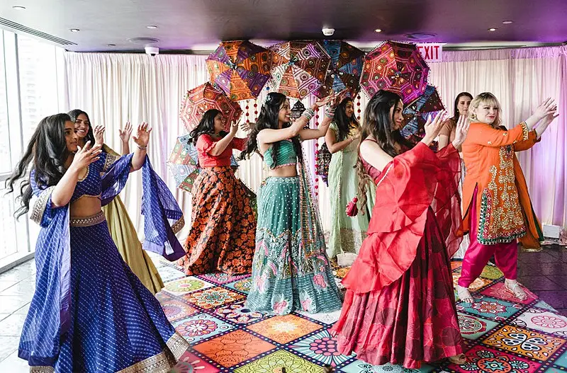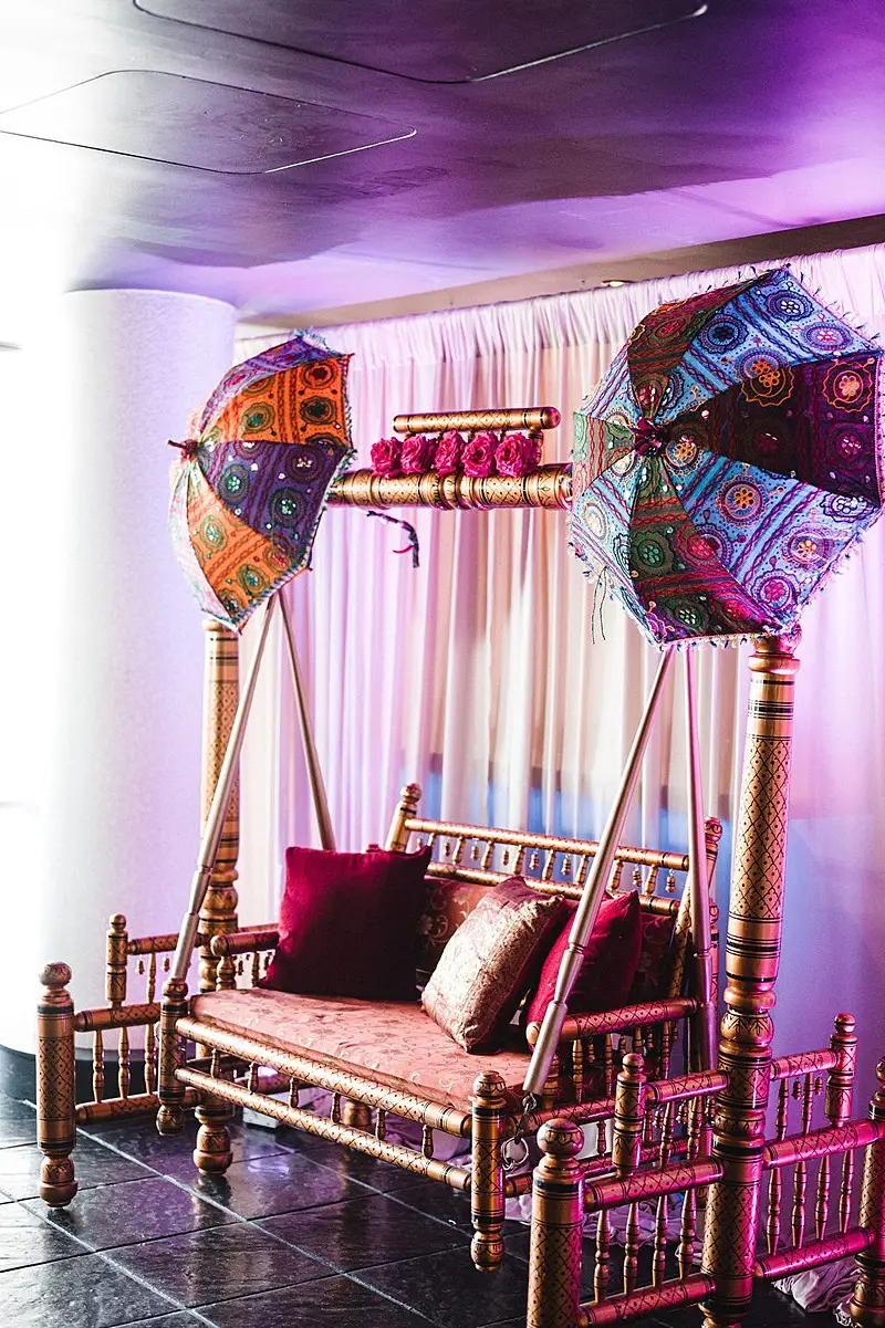 The next day featured our second event, the mehndi party which took place at the Roof on the Wit. The mehndi party featured bright, jeweled tone colors from the entire rainbow with main décor elements of a fun patterned dance floor and an elaborate dancefloor backdrop made of colorful umbrellas and Moroccan lanterns. At this party, Asian Fusion food was served alongside large-format cocktails, great dance music, and Unnati Shah performing her artful skill of henna/mehndi for the ladies. The bride even got up on the dance floor with her bridesmaids to perform a killer dance routine for their guests, and she looked jaw-dropping thanks to Namrata Soni, her hair and makeup artist who flew in from Mumbai to glam our bride for the rest of the weekend.