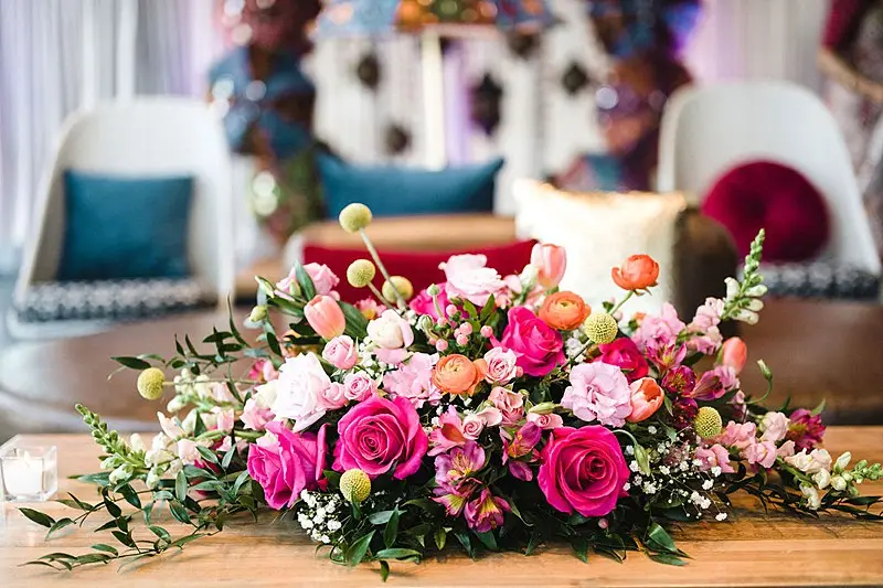 For this event, Samhita was inspired by the colors of marigolds, so a gorgeous backdrop of strung marigolds was created as an altar for Samhita and Avi to sit under as their guests wished them well. We used this color throughout the design in florals, pillows, and linens to create a gloriously bright explosion of marigold goodness.