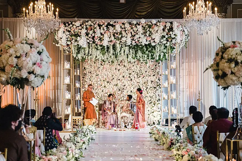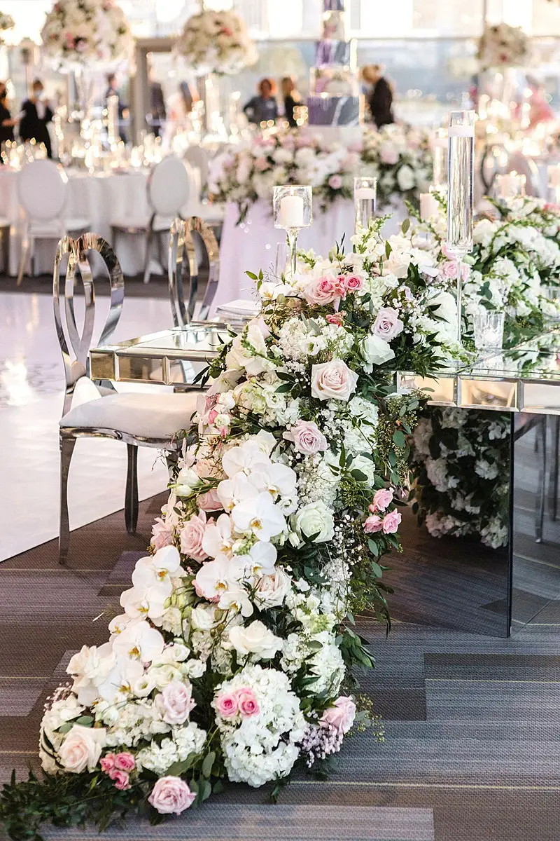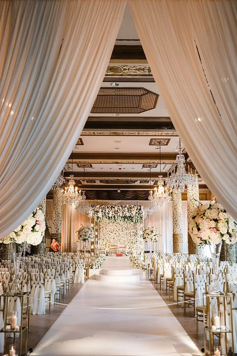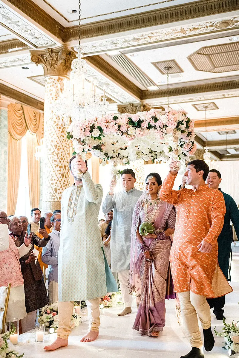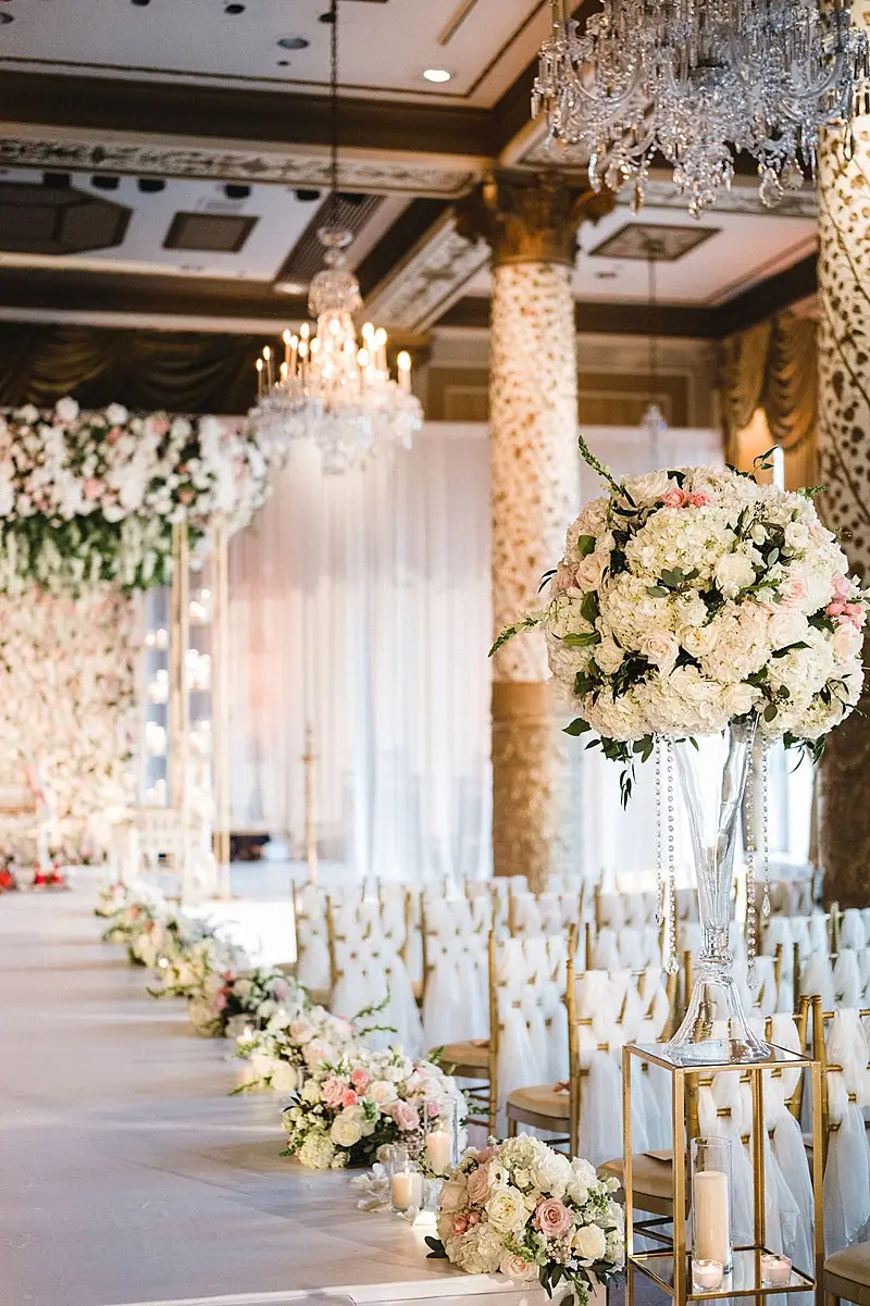 The morning of this day was when our traditional Hindu ceremony took place in the Gold Coast Ballroom of the Drake Hotel. The mandap was made of golden pillars that were filled with candlelight, and the backdrop was a gigantic wall completely filled with blush and ivory floral. Overhead was lush, vertical floral suspended as the whipped cream cherry on top. The aisle was lined with lush floral pieces, high and low, and the chairs were thoughtfully draped with chiffon fabric to soften the look.