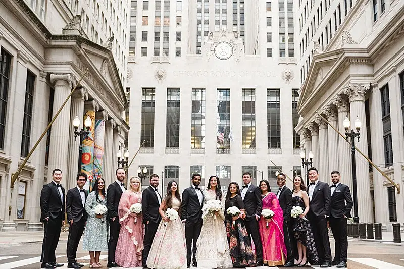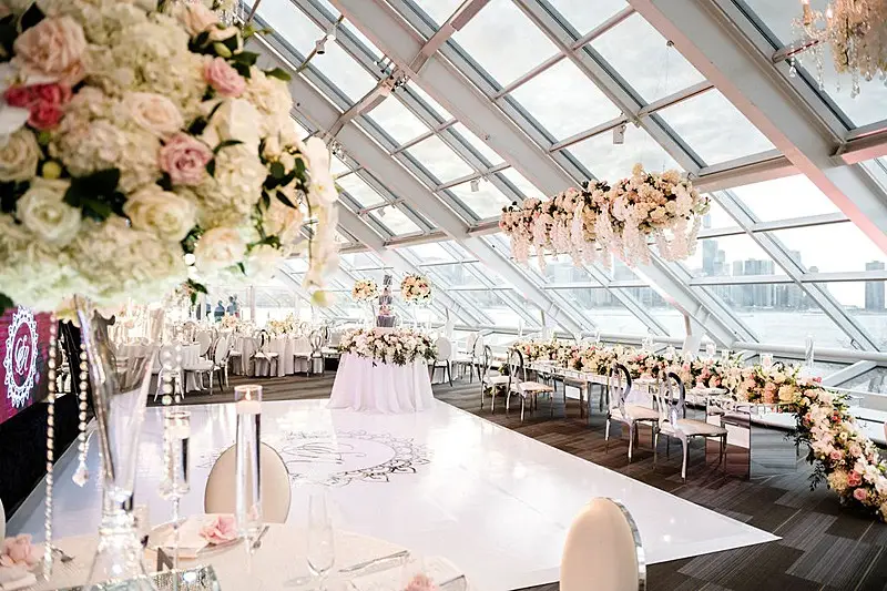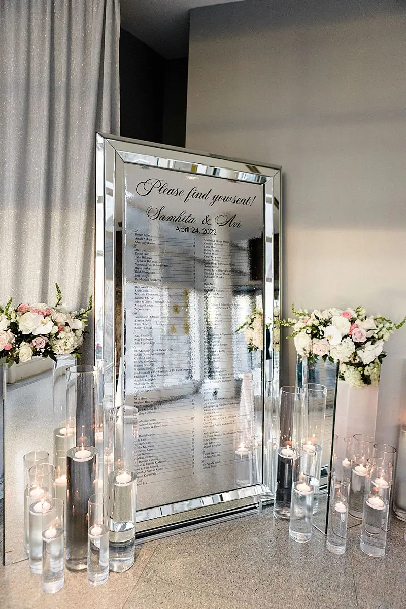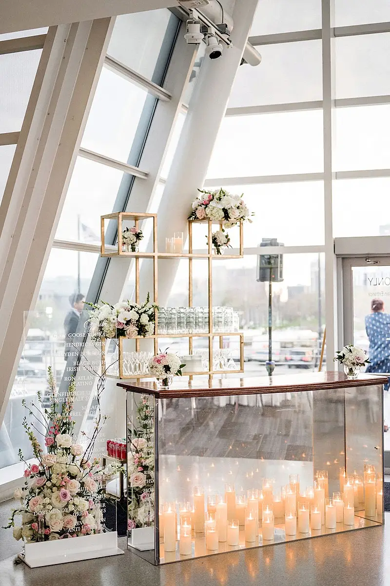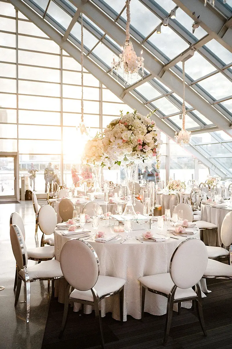 Once they were officially married, it was time to celebrate, and later that evening guests headed to the Adler Planetarium for the final show, and it did not disappoint! Elements of blush, white, silver, lucite, and mirror were plenty and used throughout the space intentionally to play into the modern aesthetic of the planetarium.