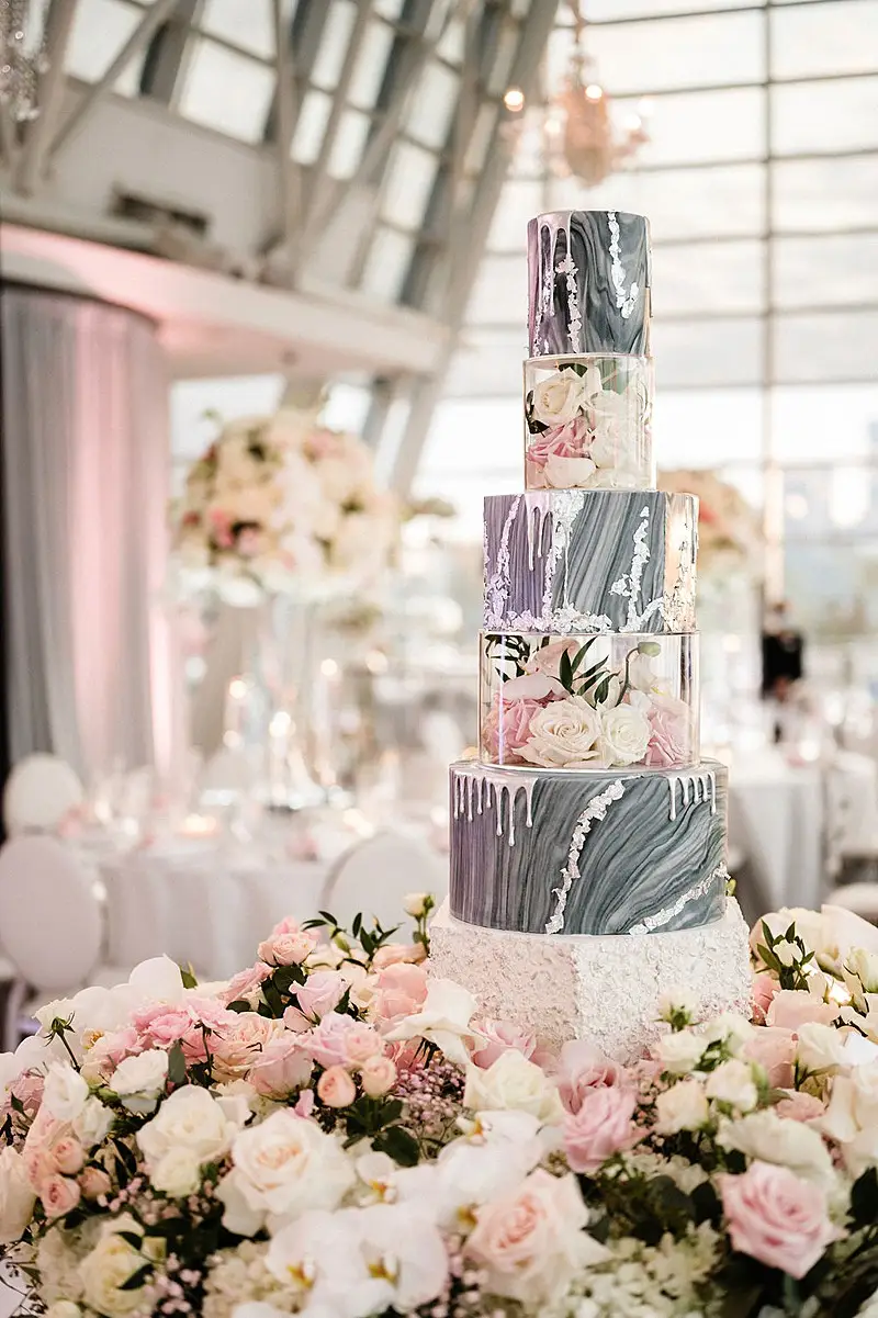 But the showstopper of the evening had to be the cake made by ECBG Cake Studio! It was a 6-tier mountainous showstopper made of silver marble and floral-filled lucite tiers that had the entire setup crew stopped in the tracks when it arrived and guests dropping their jaws as they entered the room!
