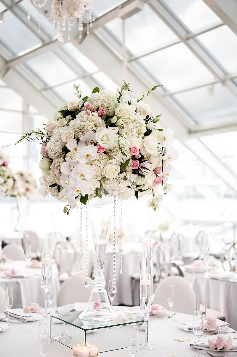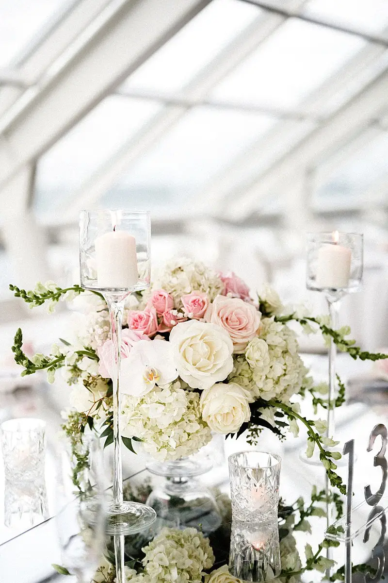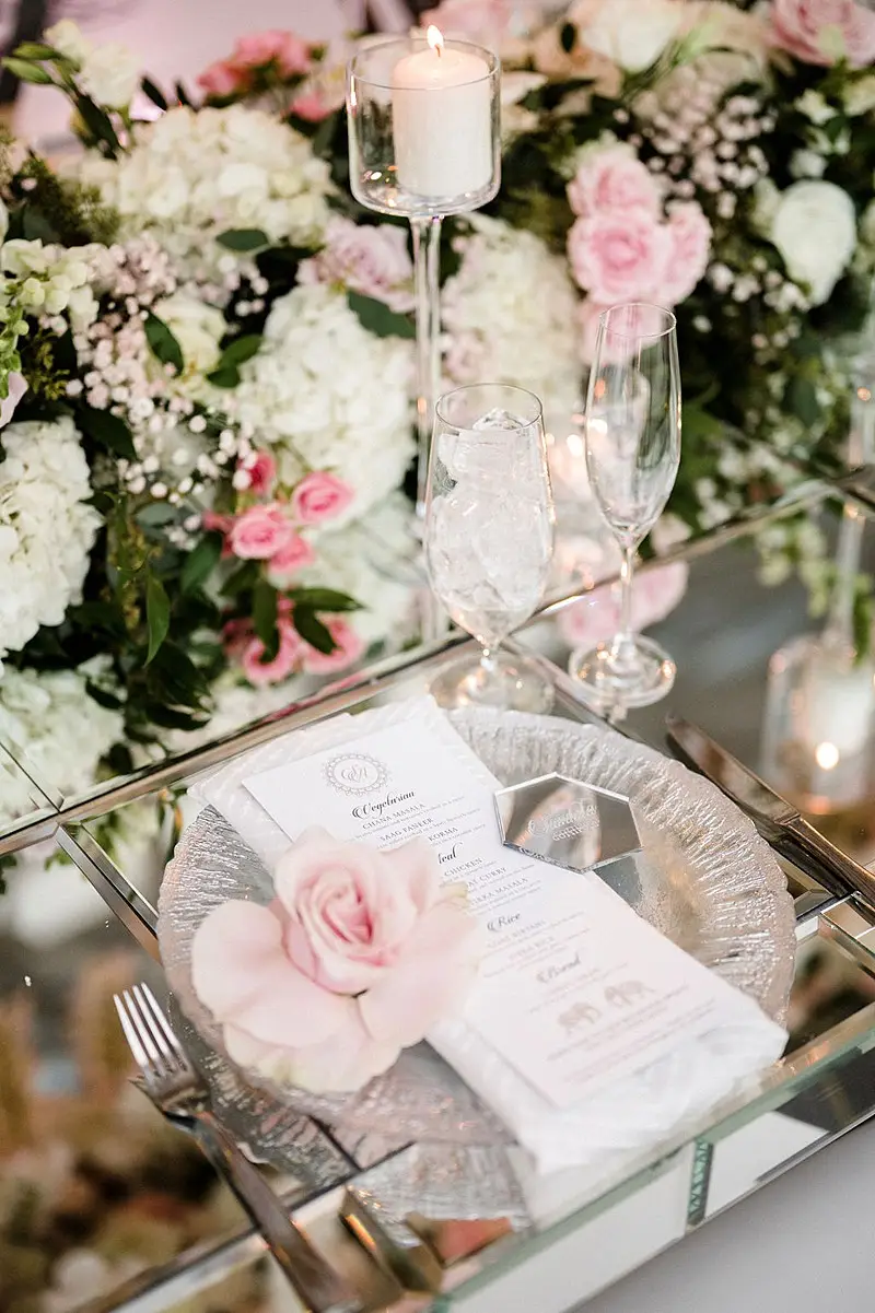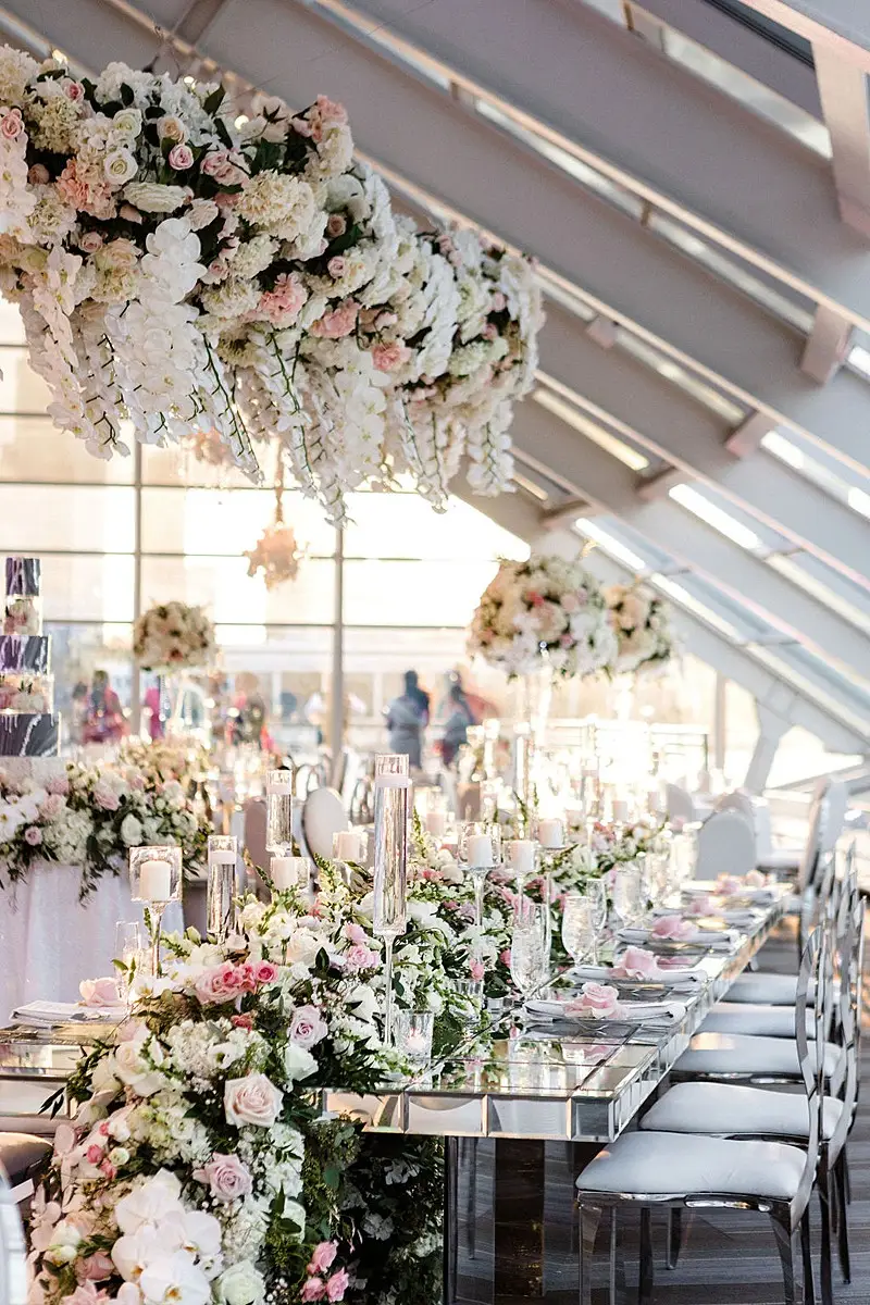 The tables were covered head to toe in mirror table toppers or luxe white linens from BBJ linen which were only the bases for the larger-than-life floral elements that filled the room, tabletop, and above, and everything was made complete with the mirror and white chairs provided by Ellie n Rose. The bars were lucite filled with candlelight, and the menus by Steracle Press shimmered with silver foil.