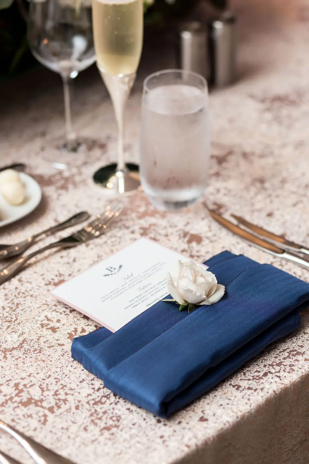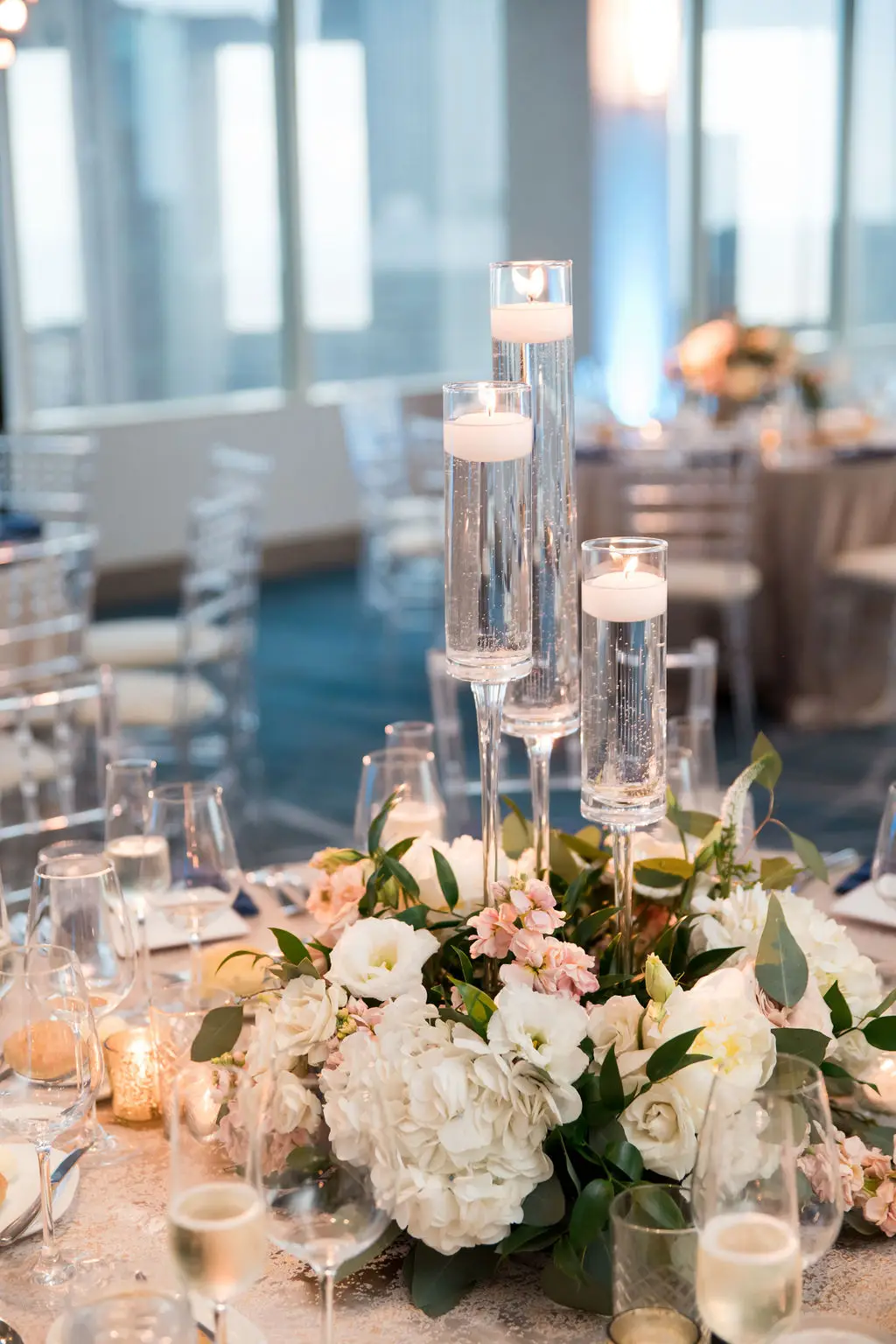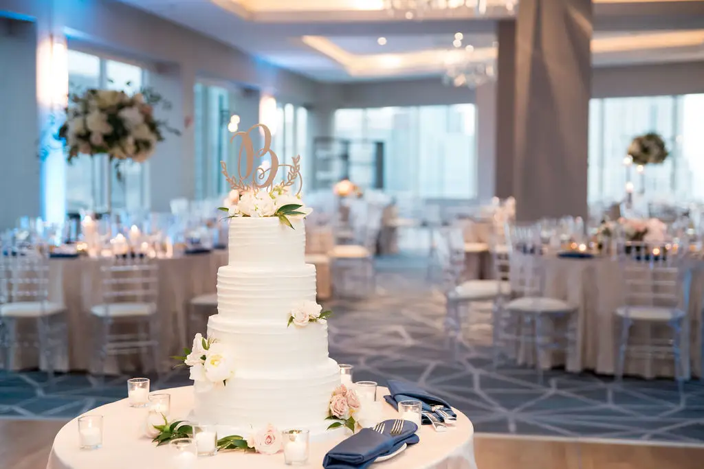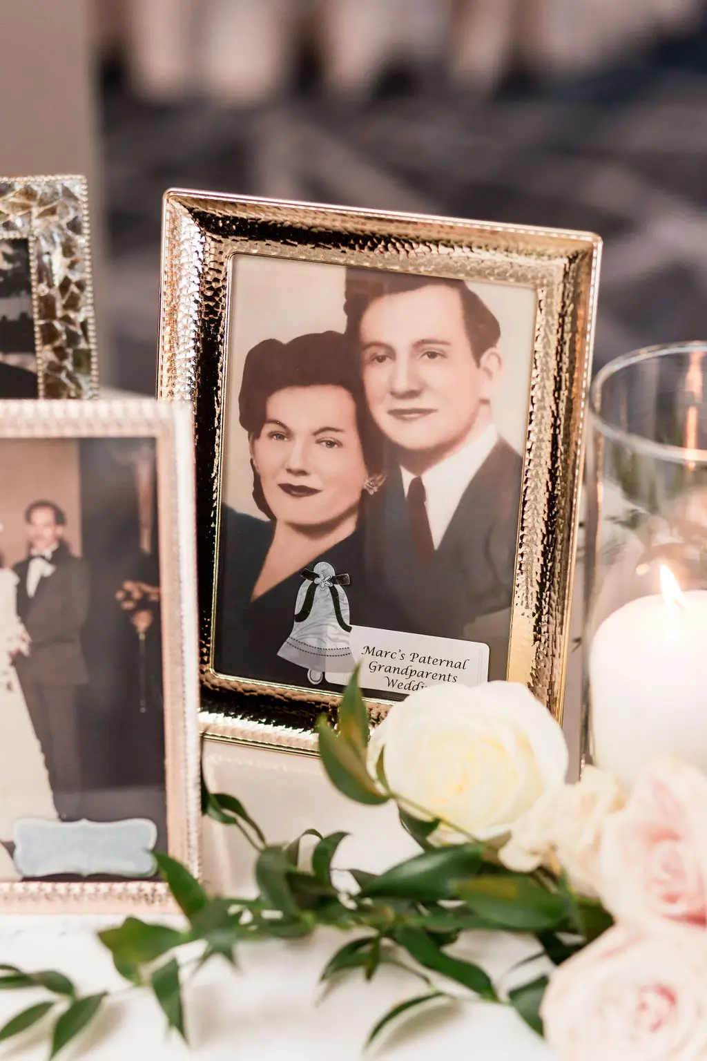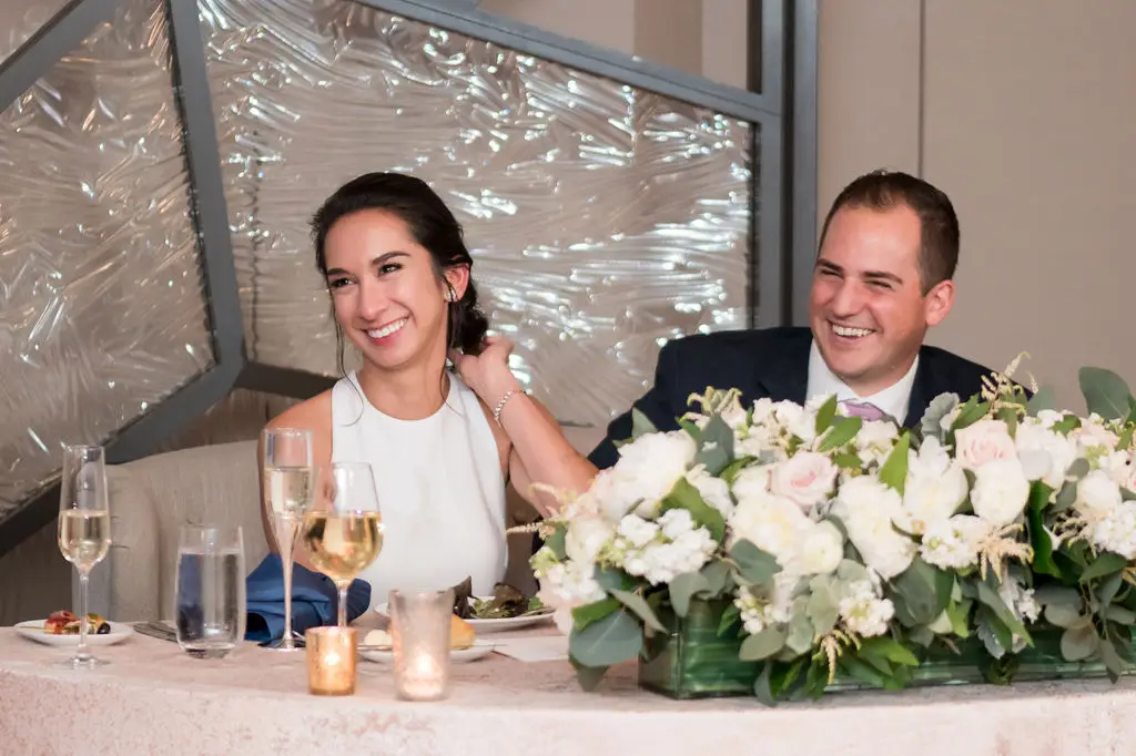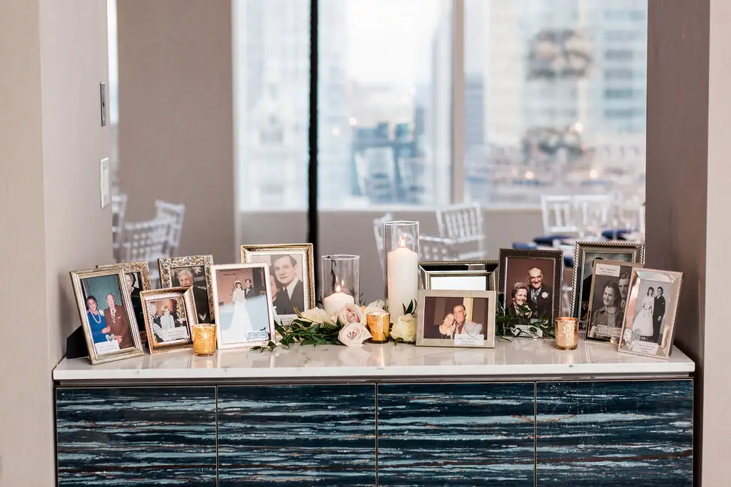 Post ceremony, Audrey, Marc, and their wedding party went around the city with Amanda Megan Miller and Poetic Productions for photos and video, and guests made their way back to the Swissôtel for cocktail hour. Back at the Swissôtel, guests were greeted by a large escort card wall, expertly created by Exquisite Designs who decorated it with gorgeous foliage and floral. As the doors to the Eleve ballroom opened, everyone’s faces dropped as they soaked in the views of the city – which was awesome for the Navy Pier fireworks later in the evening! Audrey & Marc’s navy and blush color scheme were the perfect colors to dress up the ballroom. Ivory and blush floral from Exquisite Designs adorned all the tables, which were complemented by the prettiest new blush linens from BBJ.  Clear “crystal” Chiavari chairs completed the look and complimented the ballroom’s chandeliers and glass windows. One of the most special touches of the day was the collection of photos of Audrey & Marc’s parents, grandparents, and great grandparents that were displayed on ledges in Eleve. It’s always so nice to see a glimpse into past family weddings and a great way to include family members who are no longer here.