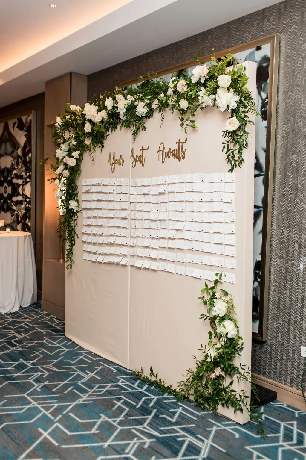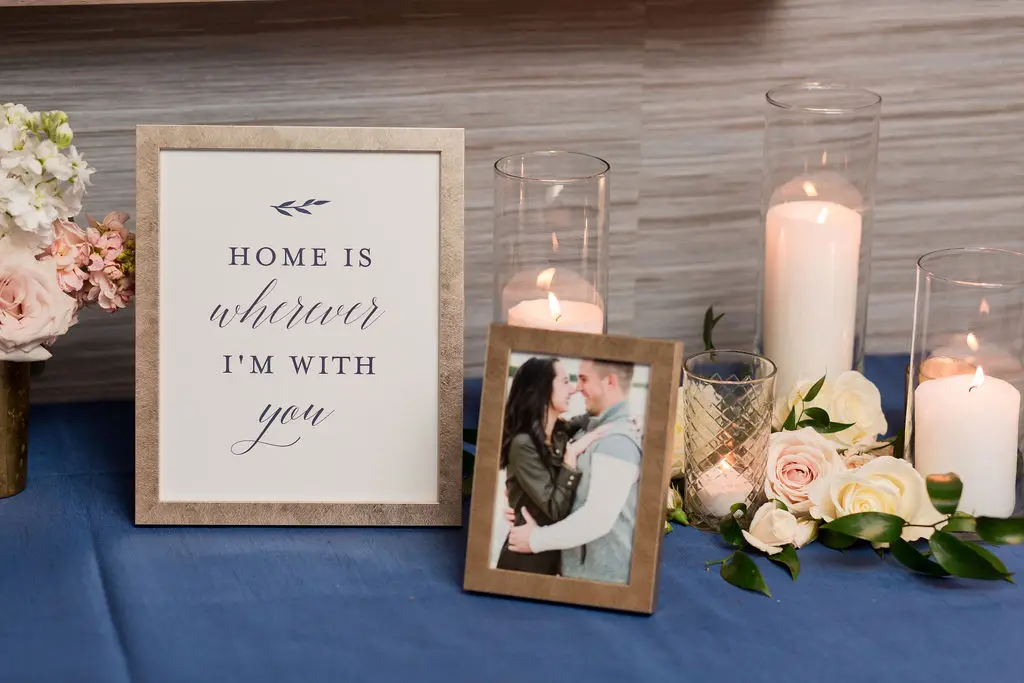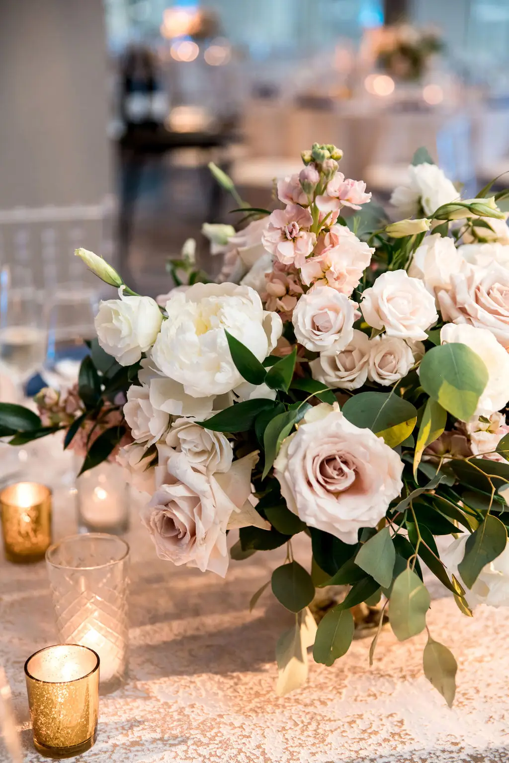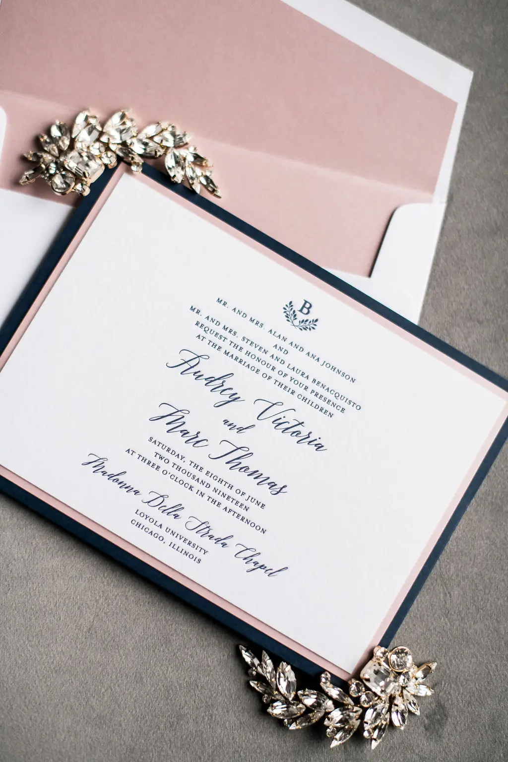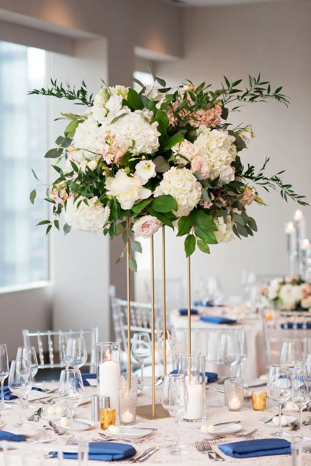 Post ceremony, Audrey, Marc, and their wedding party went around the city with Amanda Megan Miller and Poetic Productions for photos and video, and guests made their way back to the Swissôtel for cocktail hour. Back at the Swissôtel, guests were greeted by a large escort card wall, expertly created by Exquisite Designs who decorated it with gorgeous foliage and floral. As the doors to the Eleve ballroom opened, everyone’s faces dropped as they soaked in the views of the city – which was awesome for the Navy Pier fireworks later in the evening! Audrey & Marc’s navy and blush color scheme were the perfect colors to dress up the ballroom. Ivory and blush floral from Exquisite Designs adorned all the tables, which were complemented by the prettiest new blush linens from BBJ.  Clear “crystal” Chiavari chairs completed the look and complimented the ballroom’s chandeliers and glass windows. One of the most special touches of the day was the collection of photos of Audrey & Marc’s parents, grandparents, and great grandparents that were displayed on ledges in Eleve. It’s always so nice to see a glimpse into past family weddings and a great way to include family members who are no longer here.