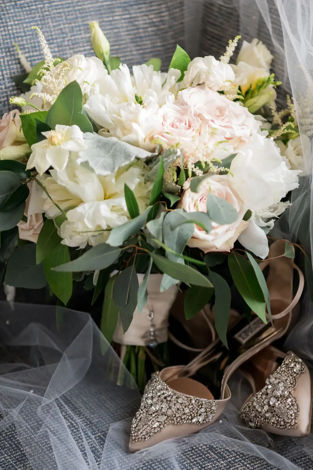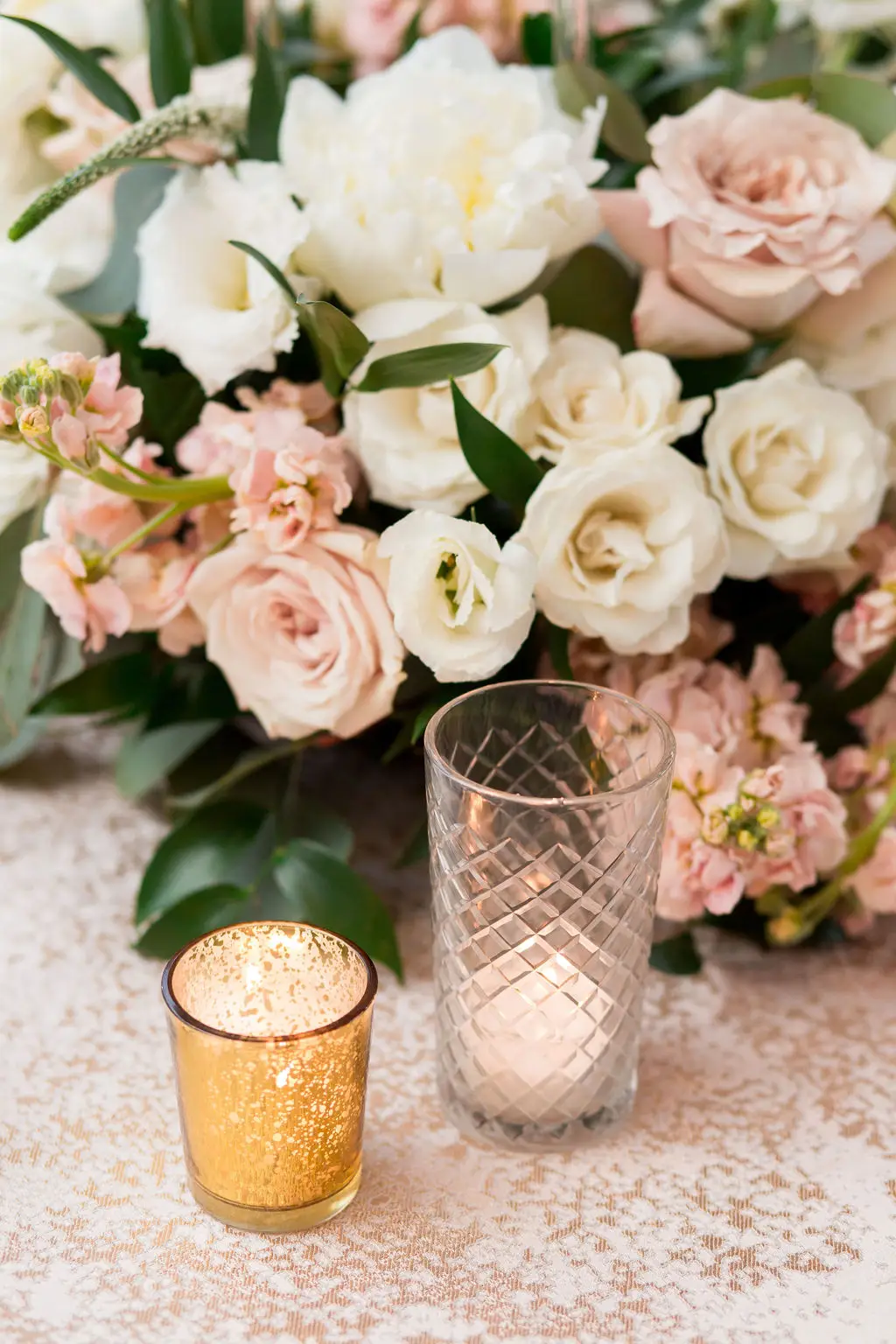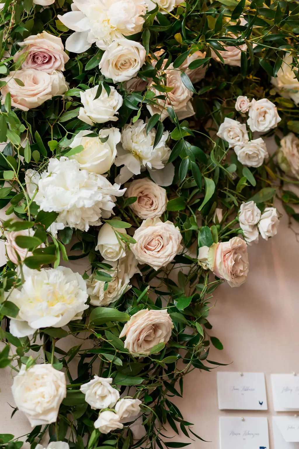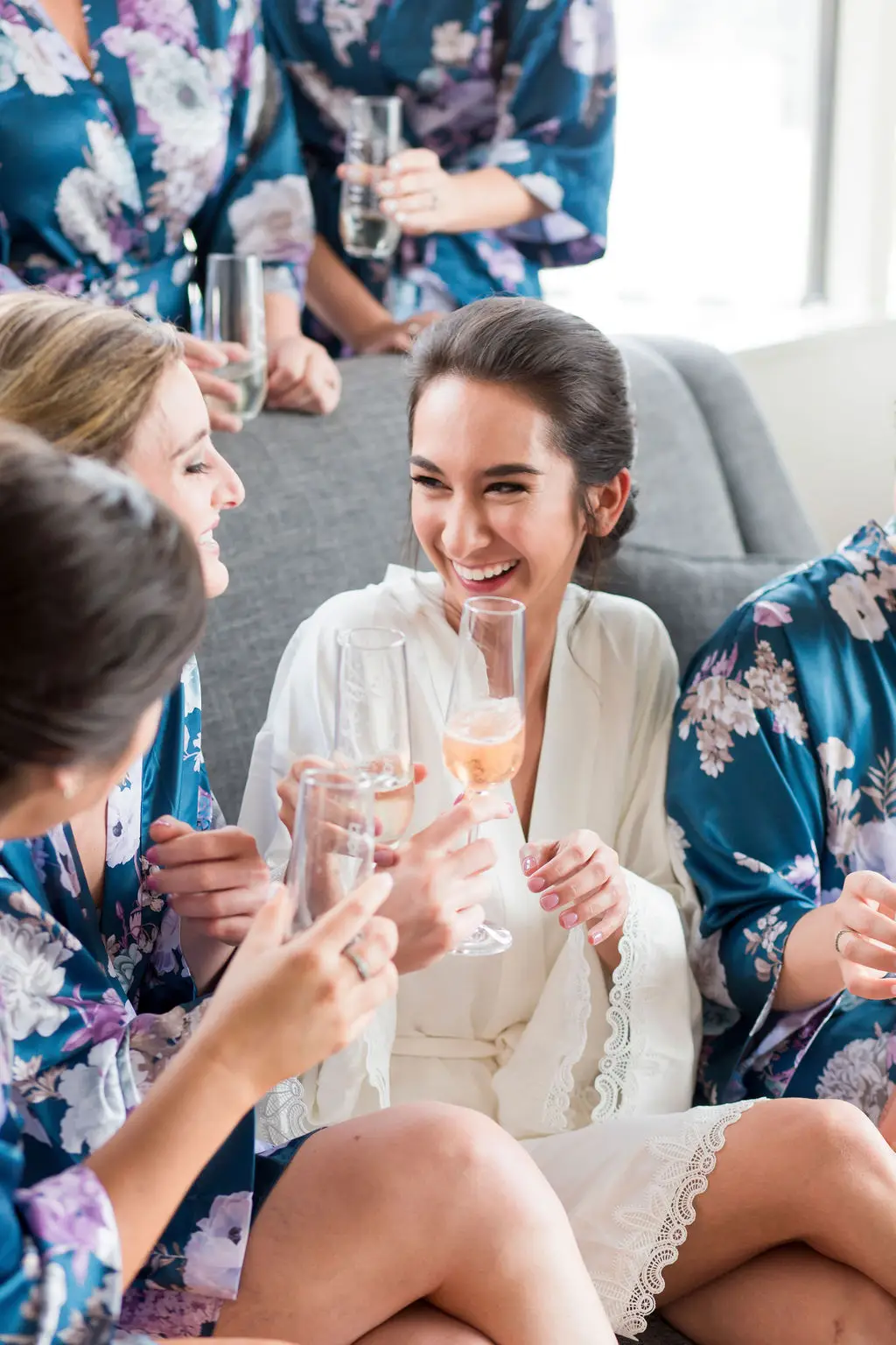Post ceremony, Audrey, Marc, and their wedding party went around the city with Amanda Megan Miller and Poetic Productions for photos and video, and guests made their way back to the Swissôtel for cocktail hour. Back at the Swissôtel, guests were greeted by a large escort card wall, expertly created by Exquisite Designs who decorated it with gorgeous foliage and floral. As the doors to the Eleve ballroom opened, everyone’s faces dropped as they soaked in the views of the city – which was awesome for the Navy Pier fireworks later in the evening! Audrey & Marc’s navy and blush color scheme were the perfect colors to dress up the ballroom. Ivory and blush floral from Exquisite Designs adorned all the tables, which were complemented by the prettiest new blush linens from BBJ.  Clear “crystal” Chiavari chairs completed the look and complimented the ballroom’s chandeliers and glass windows. One of the most special touches of the day was the collection of photos of Audrey & Marc’s parents, grandparents, and great grandparents that were displayed on ledges in Eleve. It’s always so nice to see a glimpse into past family weddings and a great way to include family members who are no longer here.