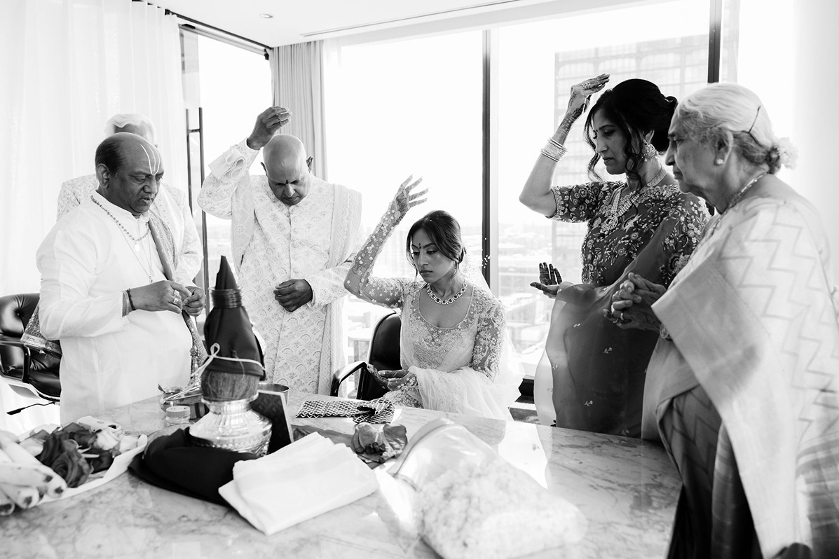 Saturday unfolded in Chicago’s West Loop, beginning with bride and groom prep at the Nobu Hotel. Pre-ceremony pujas were followed by a celebratory baraat for the groom, setting the tone for a day of tradition and festivity.